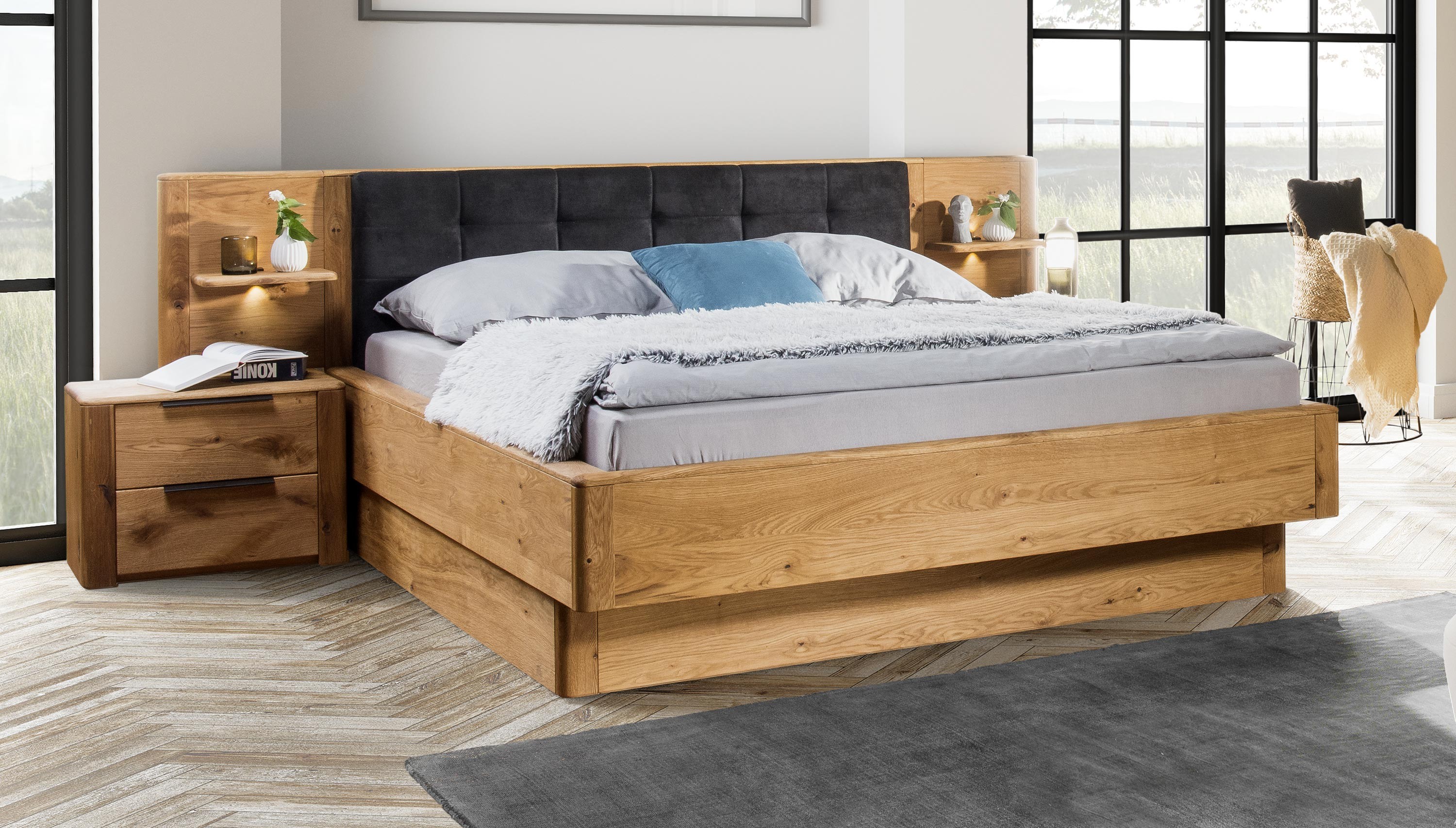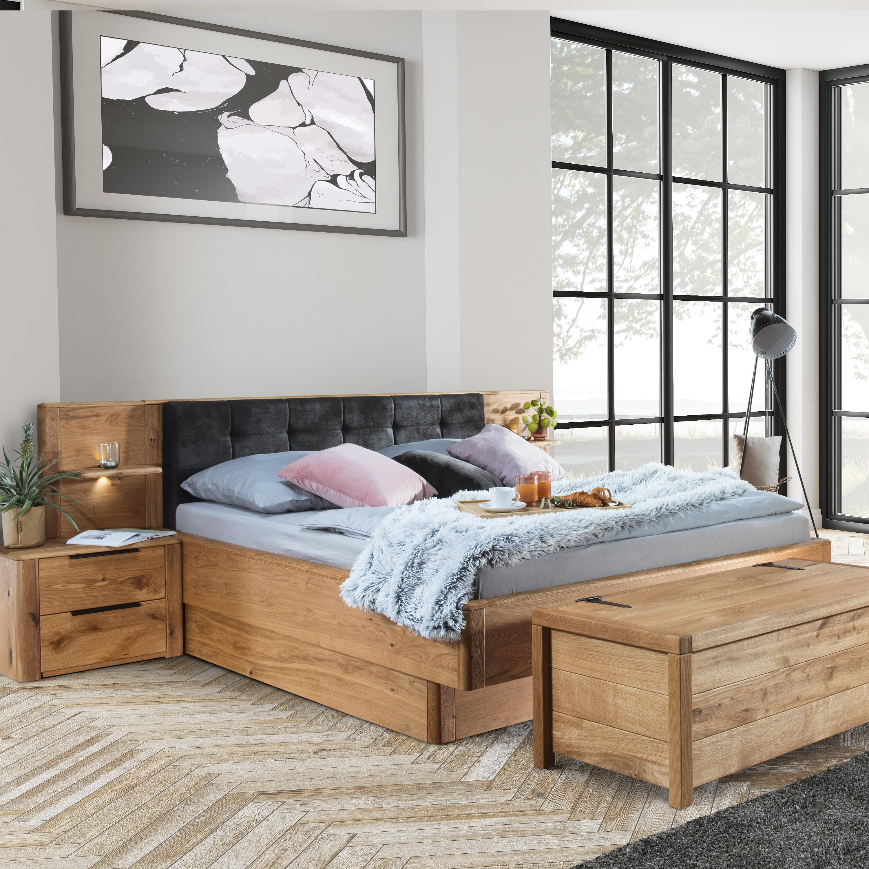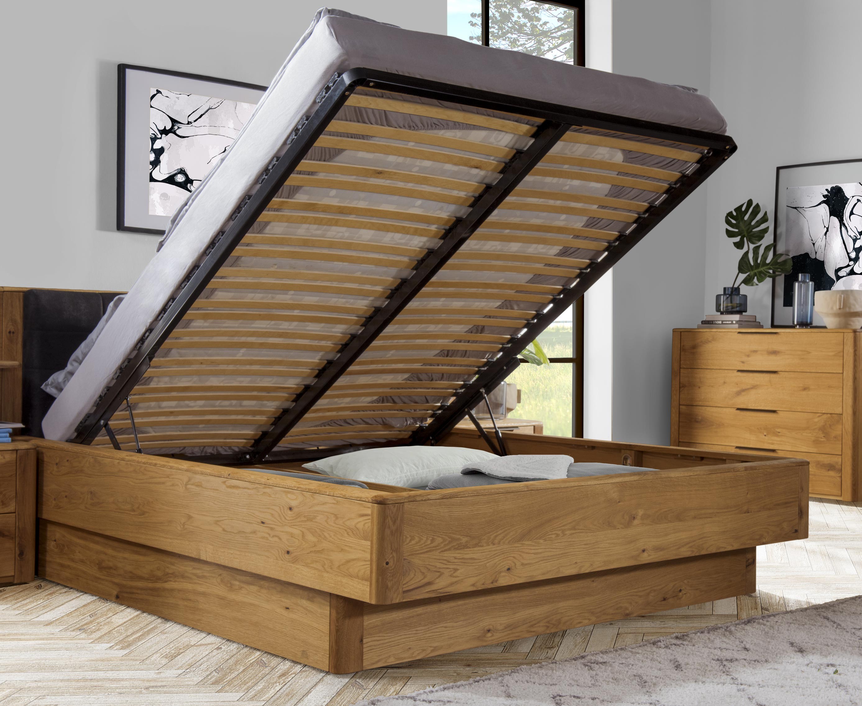 Masszív tölgyfa franciaágy elöl kihajtható tárolóval 200x200 cm