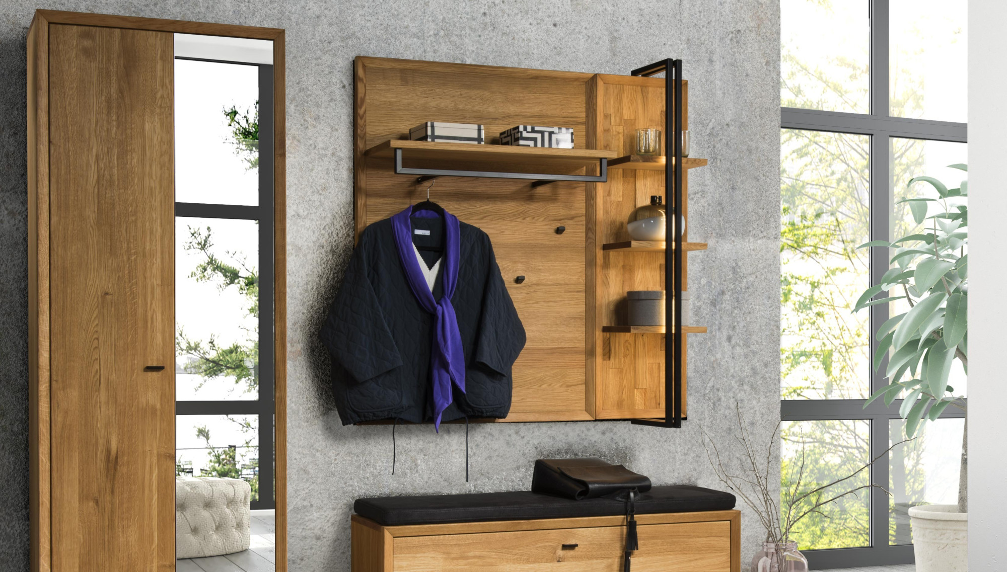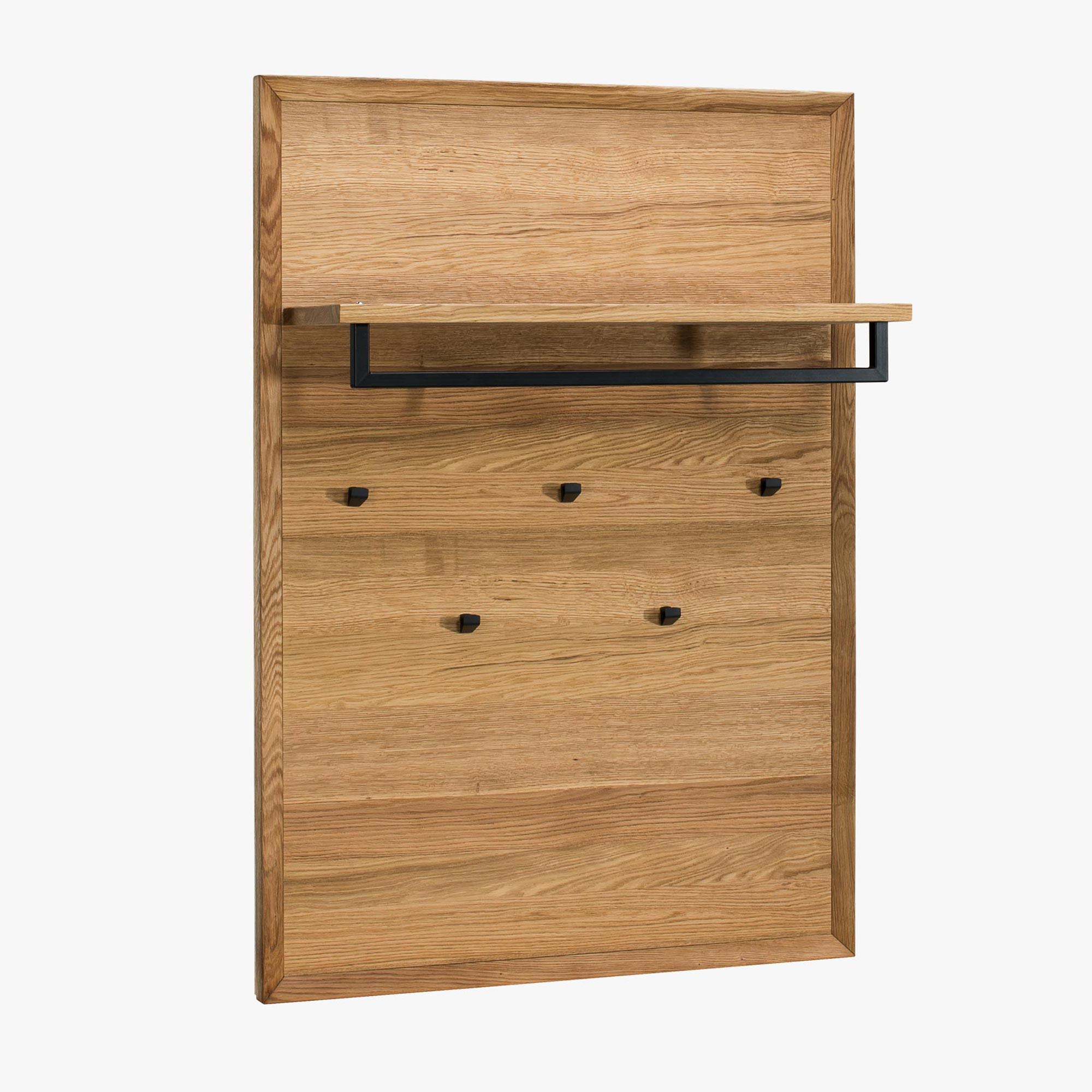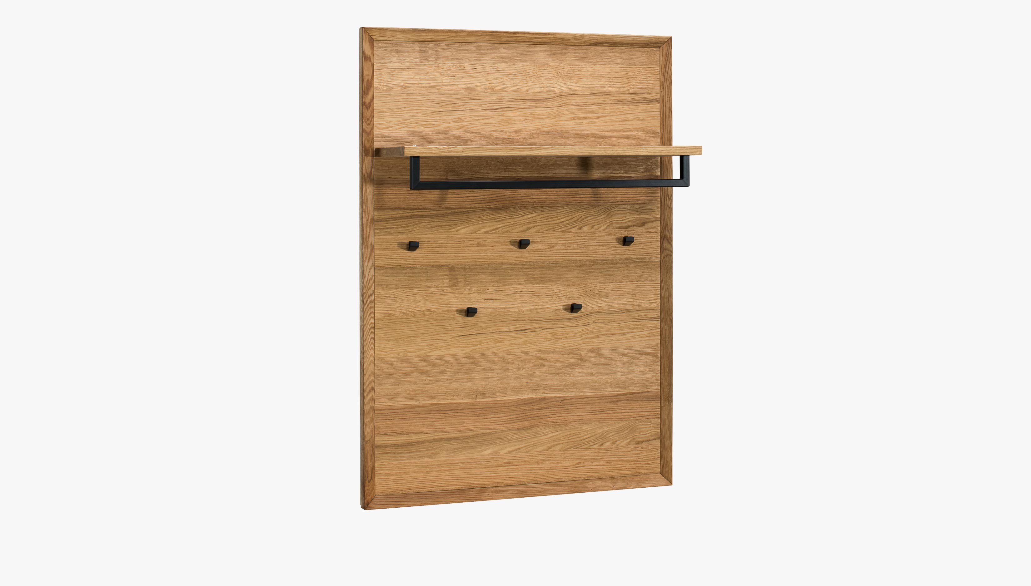 Tölgy falipanel, amely a Vilo kollekció előszobabútorainak része. Előnye az 5 teljes értékű akasztó, valamint egy praktikus polc, amely alatt egy hosszú rúd található ruhák felakasztásához. A panel közvetlenül a falra szerelhető, és tartalmazza a szereléshez szükséges tartozékokat. Érdekes kombinációként, és ha szükség van további tárolóhelyre, használja a Vilo 41 típusú polcot, mint az alábbi képen. A polc és a keret tölgyfa, maga a látható felület prémium tölgyfurnérból készült, gyönyörű tölgyfa erezettel természetes színben.