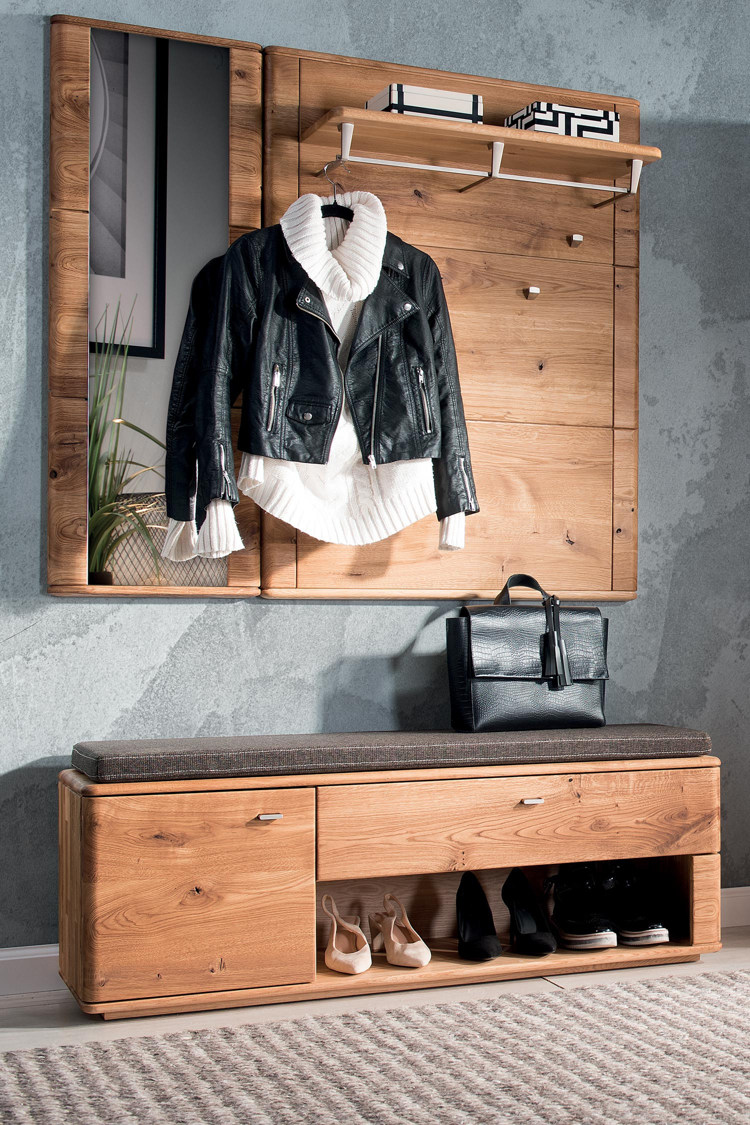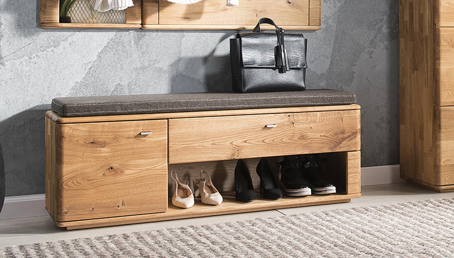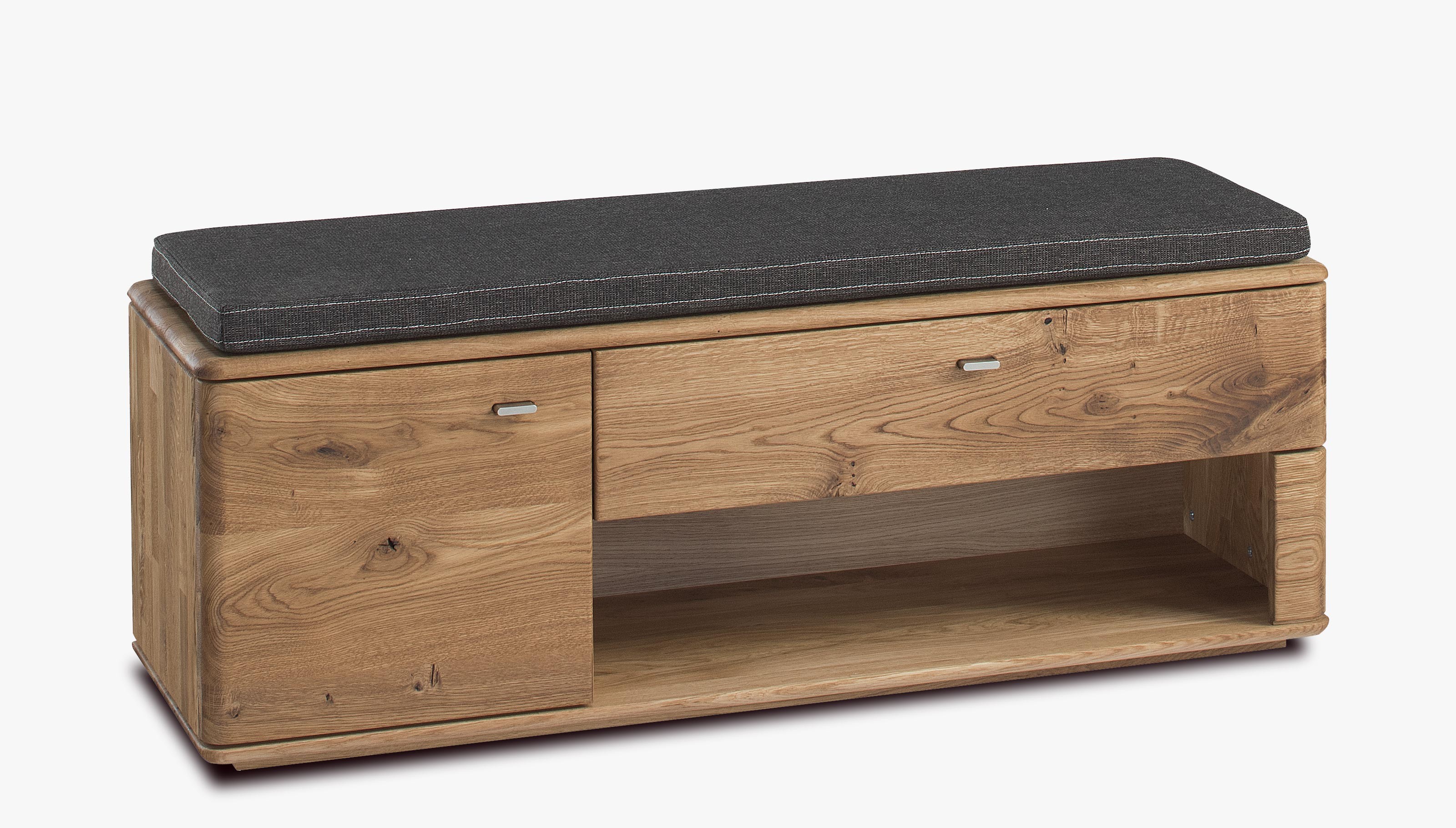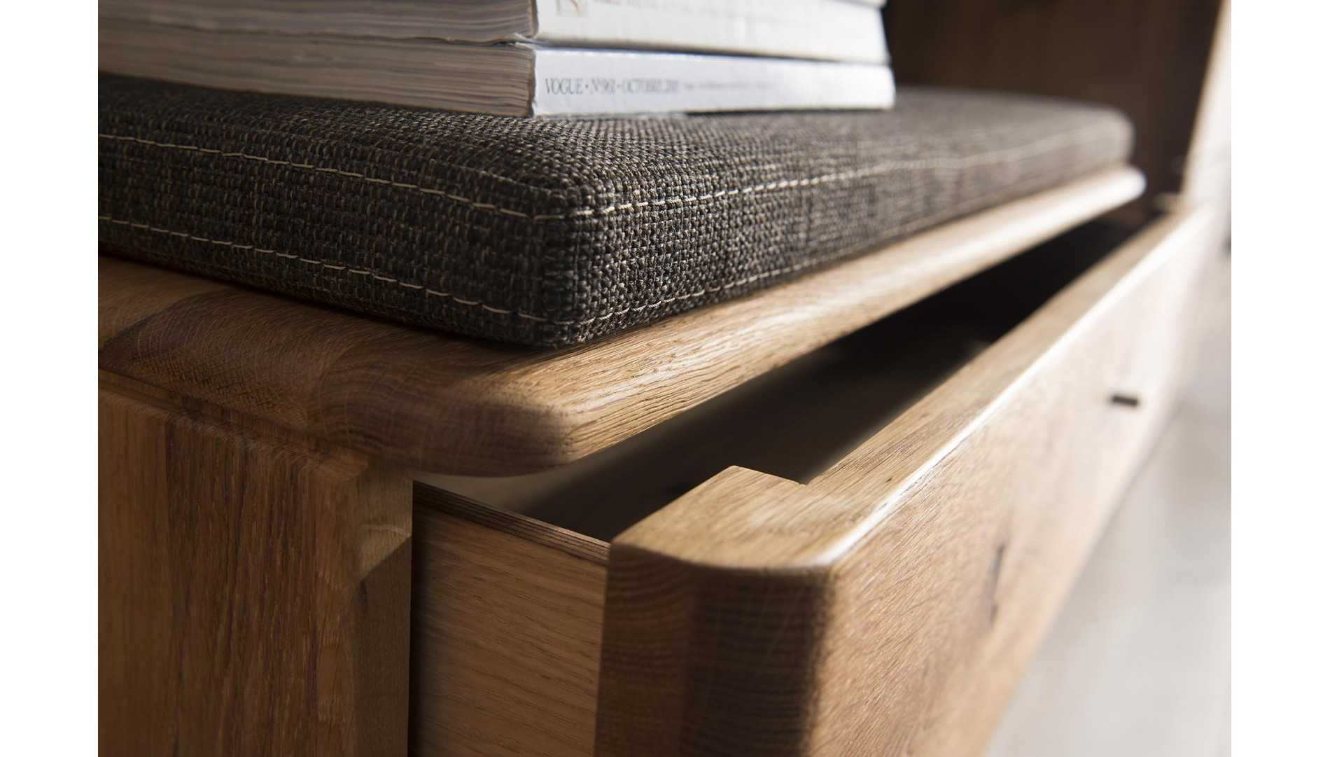 Tömör tölgy előszobai pad fiókkal és ajtóval, párnával, 126 cm