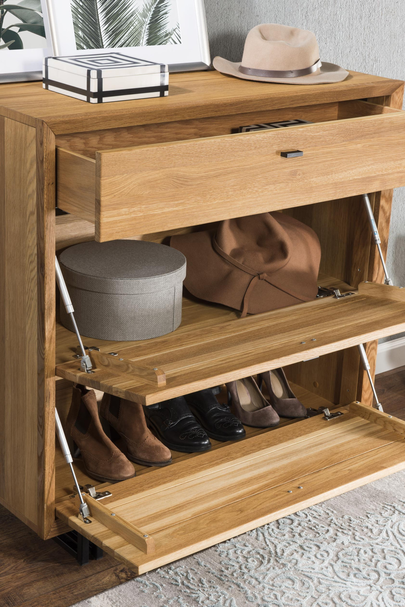 Exkluzív bútordarab az előszobába, bőséges tárolóhellyel cipői és kiegészítői számára. A tölgy Vilo 10-es típus időtálló darab. A felső részben egy fiók található, bőséges tárolóhellyel és soft-close halk záródással. Az alsó részen 2 x tárolóhely található a cipői számára. Belsőbe mindenképp csak száraz cipőket javasolunk. Az ajtók lenyíló kialakításúak, tehát felülről lefelé nyílnak. A Vilo cipőtároló már összeszerelve érkezik, gyönyörű kivitelben.