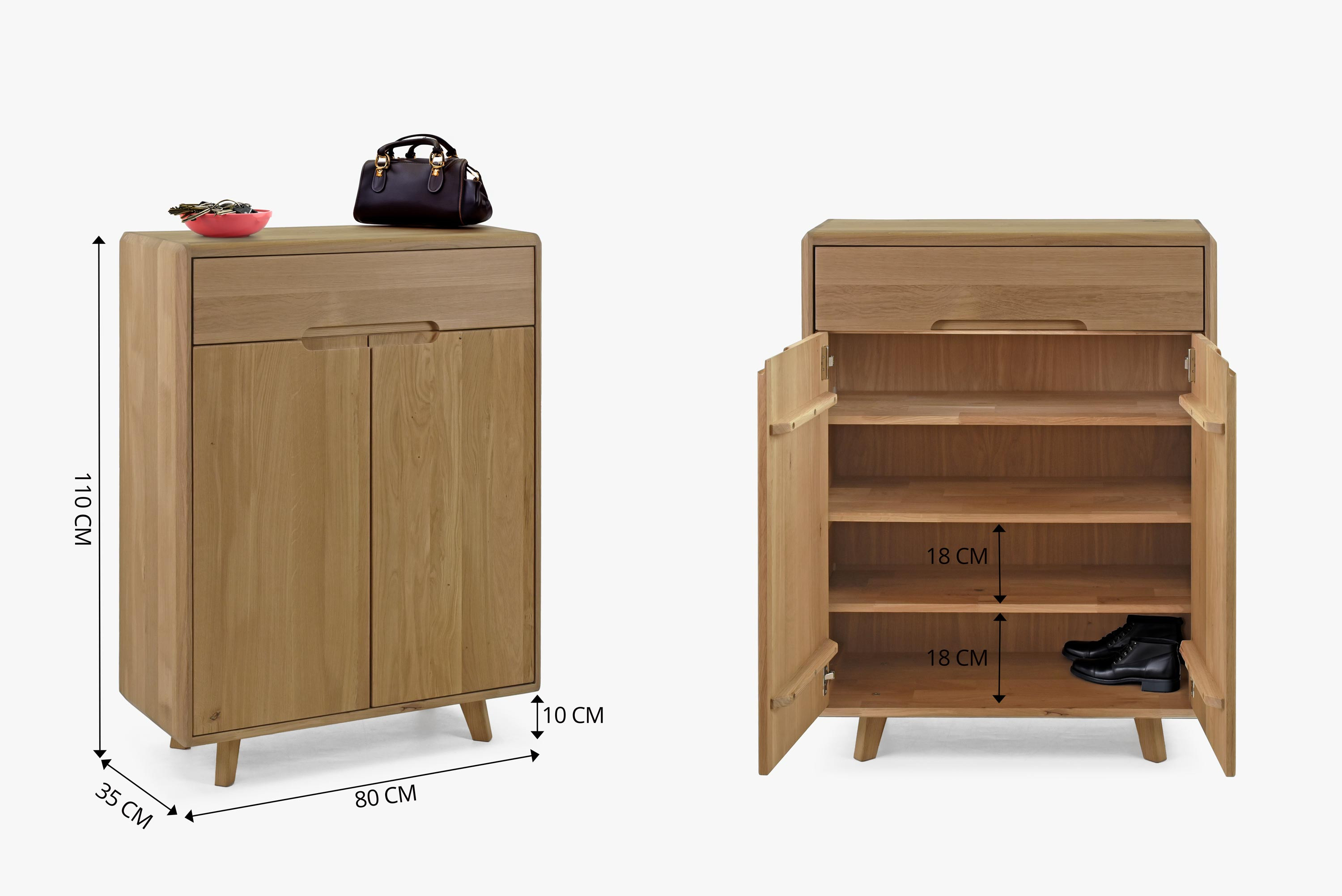 A komód lábakon áll, amelyek nemcsak esztétikai értékét növelik, hanem megkönnyítik alatta a takarítást is. Összeszerelve szállítjuk, kivéve a lábakat, amelyek könnyen felszerelhetők. A belső tér két ajtót kínál összesen három polccal, ami elegendő helyet biztosít a cipők rendszerezéséhez. Nedves cipők tárolásához javasoljuk alátét használatát, hogy megőrizze a fa minőségét. A komód felső részében ráadásul egy nagy fiók található apróságok vagy cipőápolási eszközök tárolására.