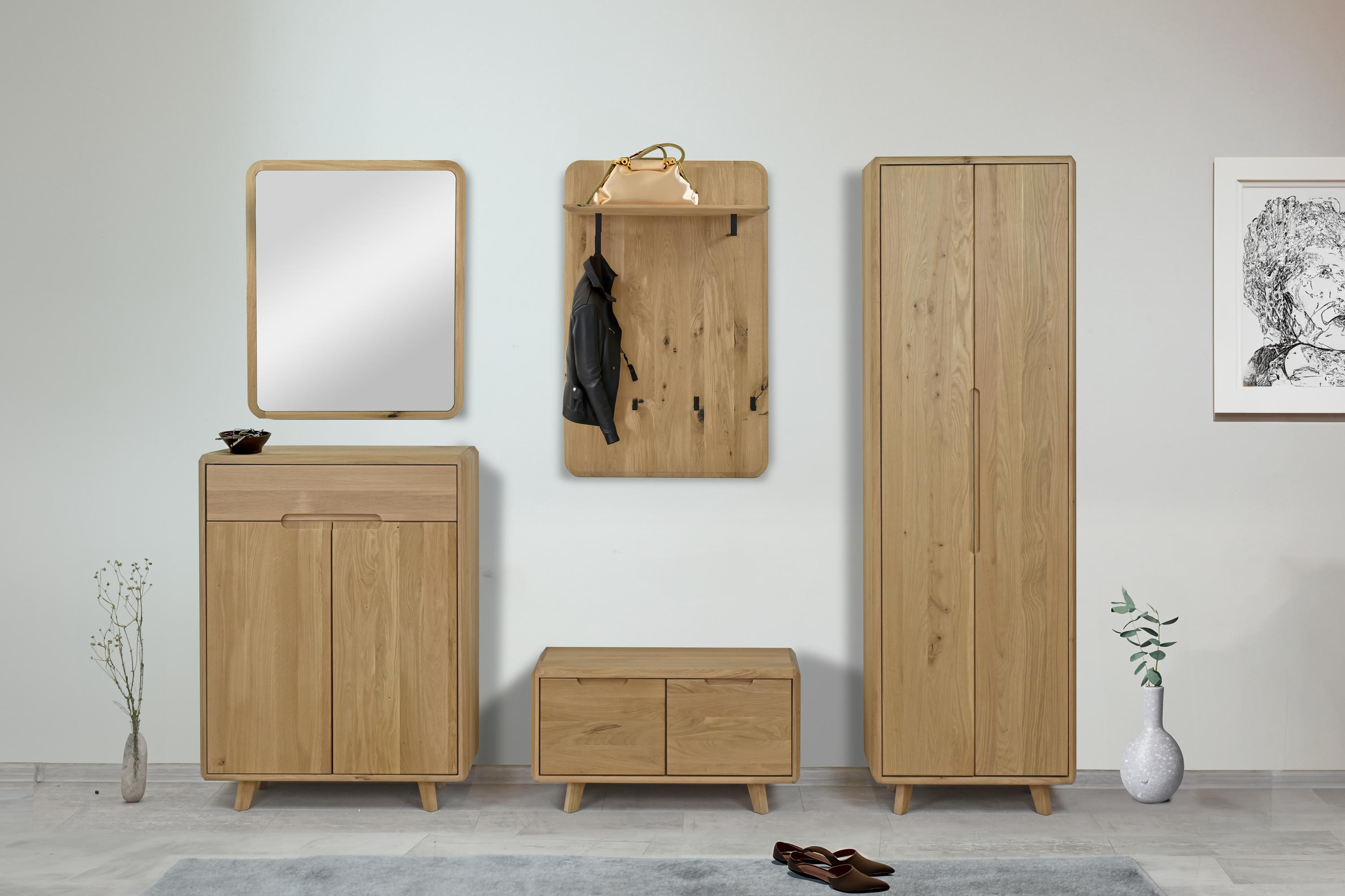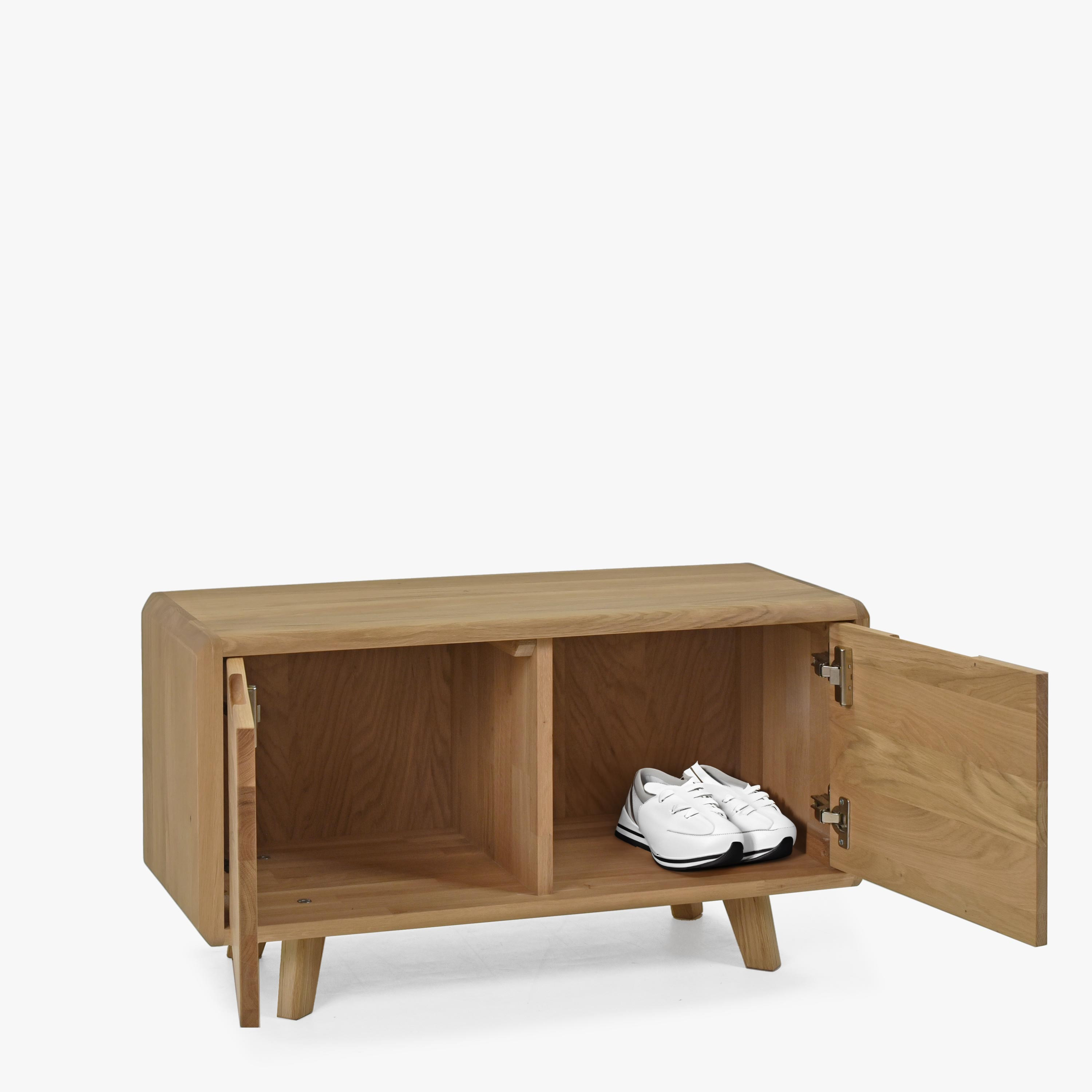 Előszobai pad ajtókkal, tömör fehér tölgy, skandináv design