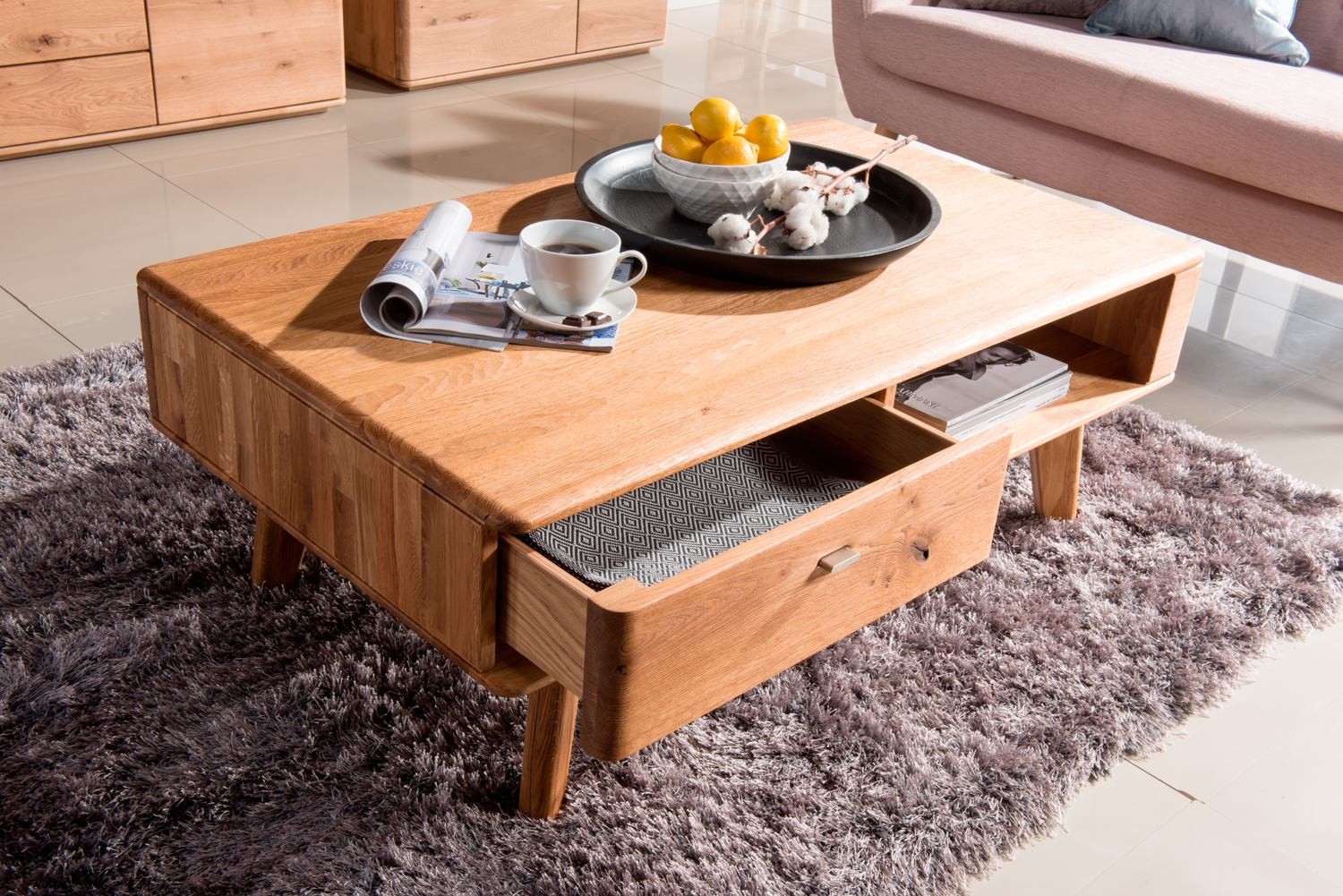 A Texas, Janosik dohányzóasztal elegendően nagy tárolófelületet kínál, amit különösen értékelni fog ünnepségek rendezésekor. A dohányzóasztal praktikusságát egy tágas, kellően mély, halk záródású fiók és a fiók melletti, az asztallap alatt található nyitott tárolóhely adja. Bár az asztal nagyon egyszerűnek tűnik, teljes mértékben ki fogja használni.