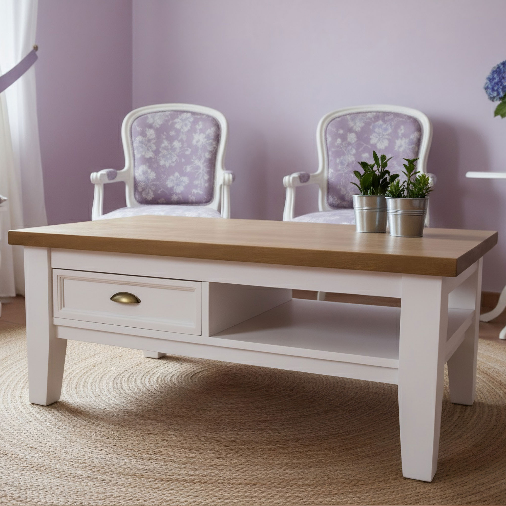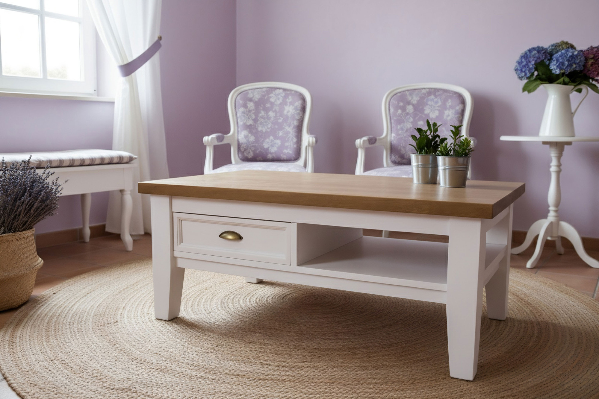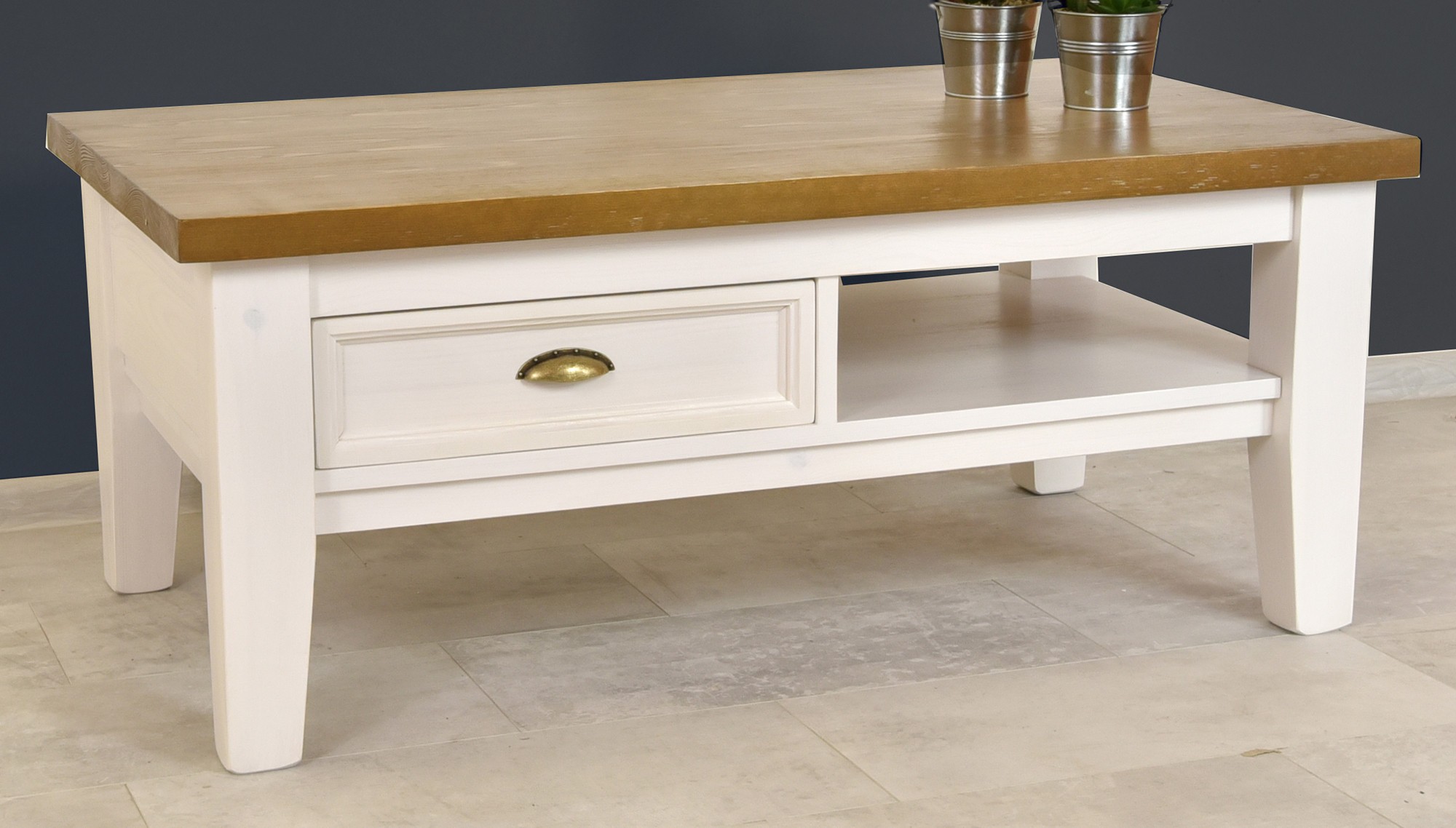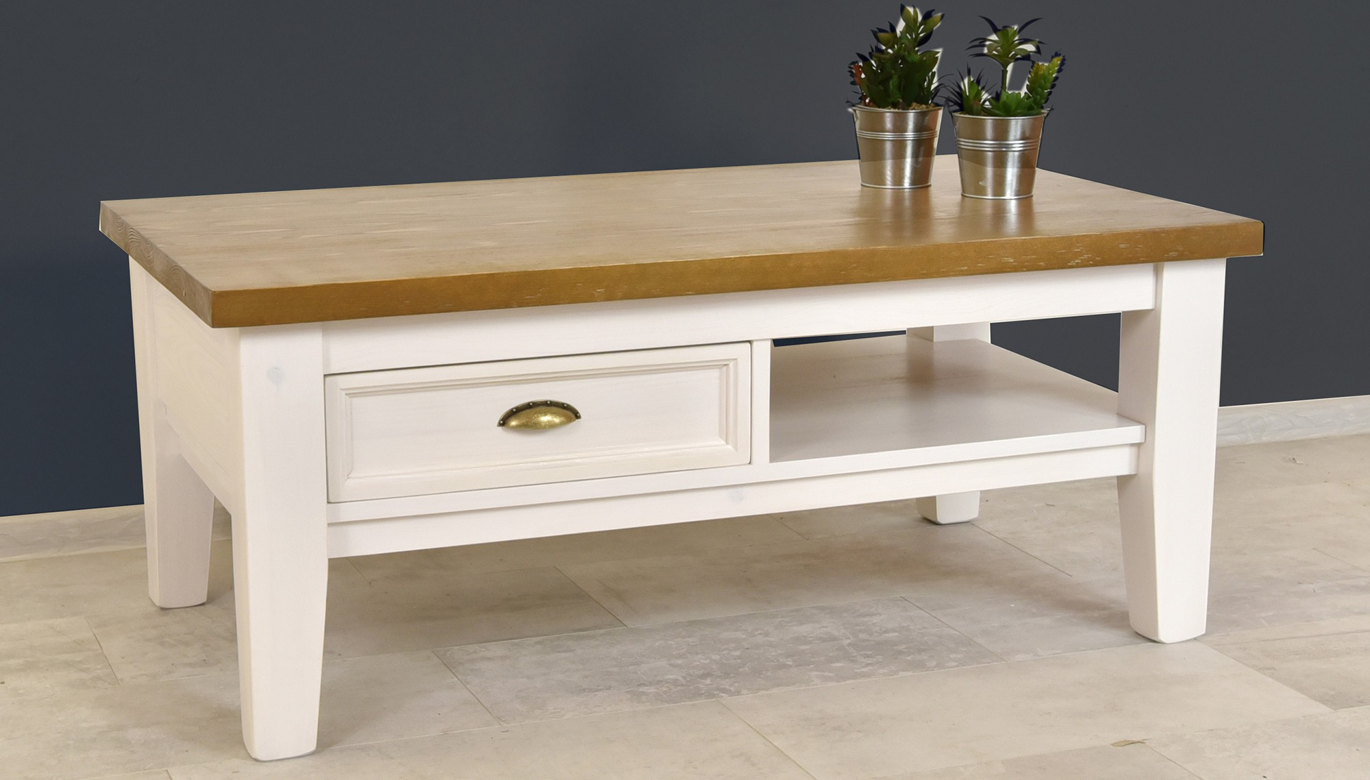 Provence fa dohányzóasztal elegáns és praktikus bútordarab, amely a francia vidéki hangulatot hozza az Ön nappalijába. Tömör fenyőfából készül, ami garantálja a hosszú élettartamot, stabilitást és szilárdságot. A felső lap akár 4 cm vastagsága kiemeli az asztal masszív jellegét, ugyanakkor elegendő helyet biztosít a mindennapi használathoz. Nem hiányzik a praktikus fiók és tárolópolc sem, így mindig kéznél lesznek a szükséges dolgok. A fehér és barna kombinációja jellegzetes rusztikus megjelenést kölcsönöz az asztalnak, és könnyen illeszthető a többi bútordarabhoz a helyiségben.
