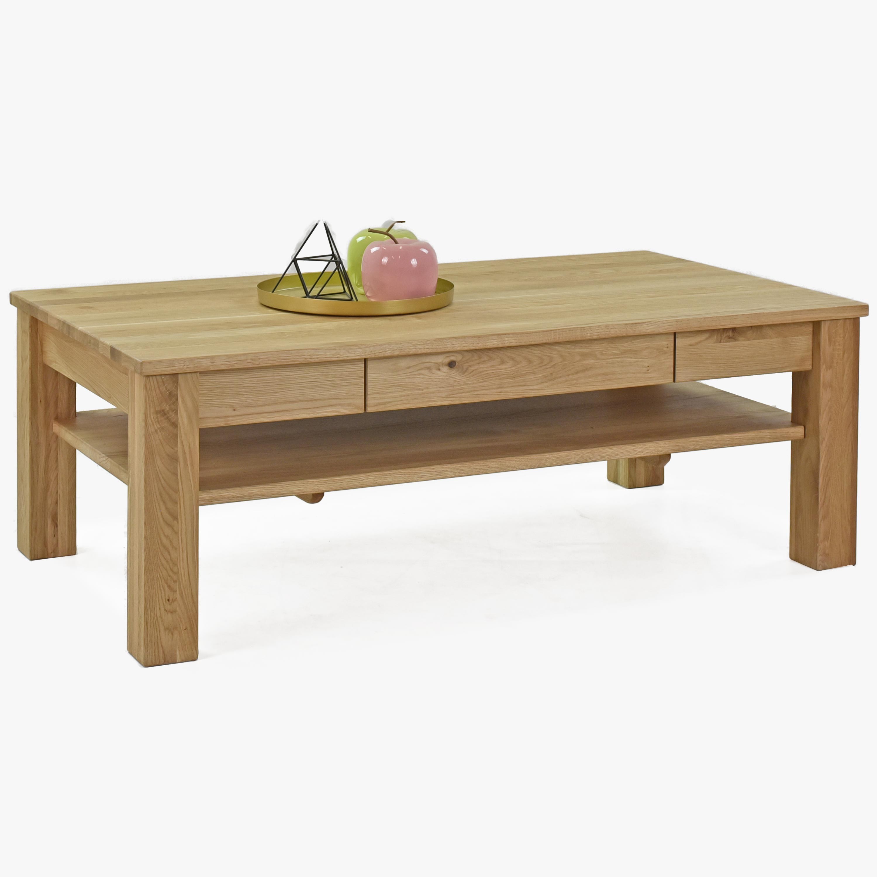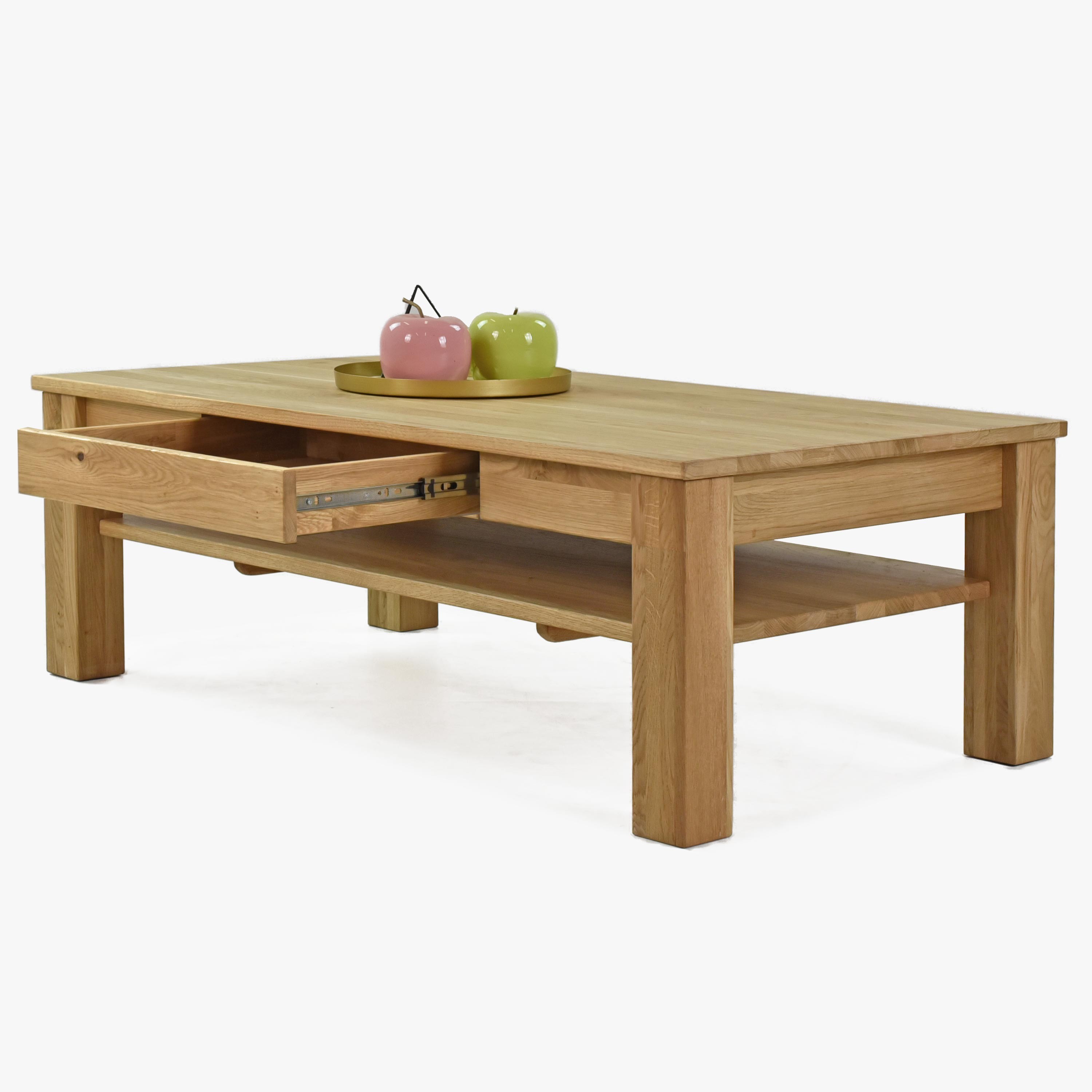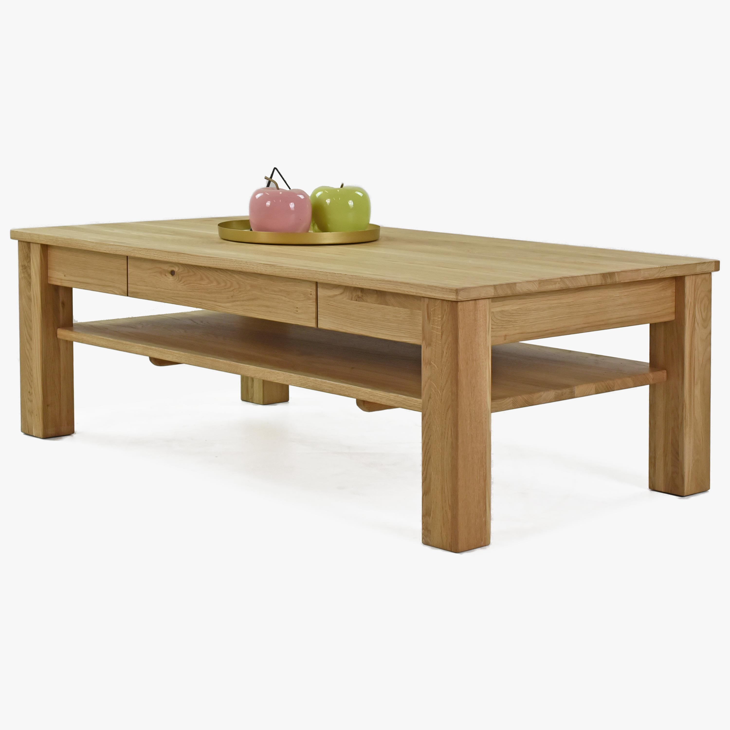 Tömör tölgyfa dohányzóasztal polcokkal és fiókokkal, natúr színű