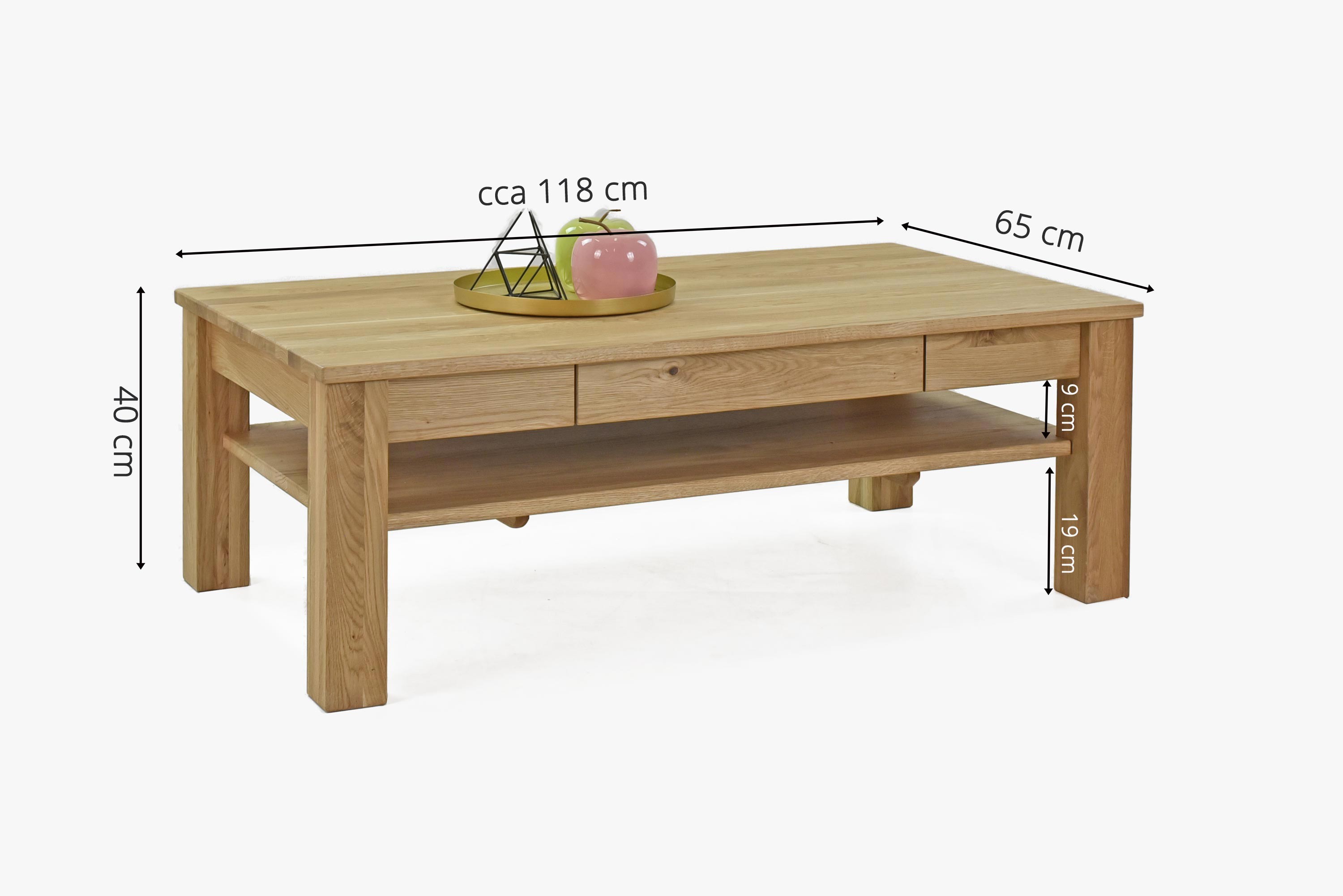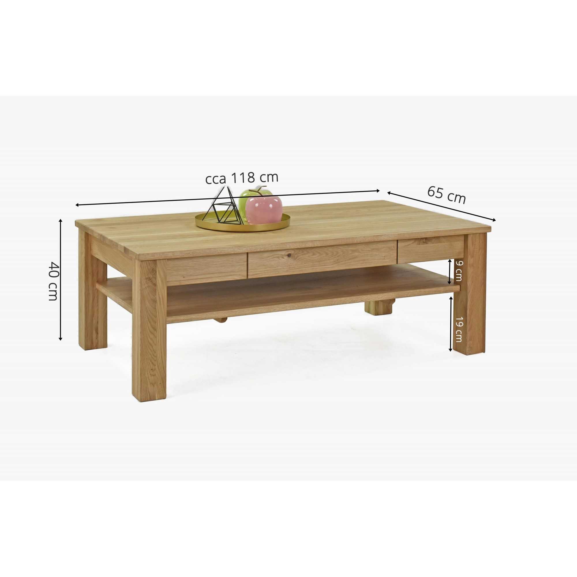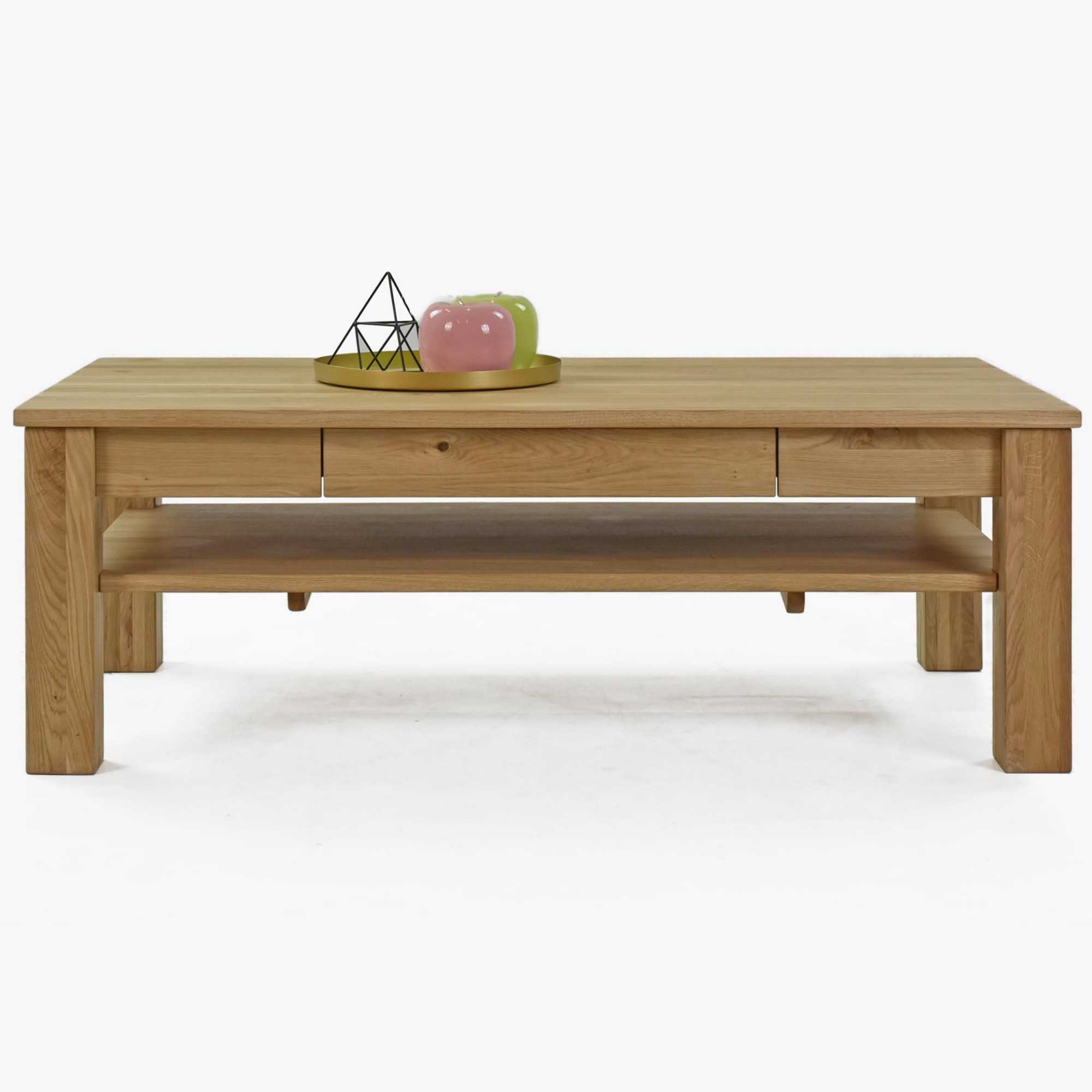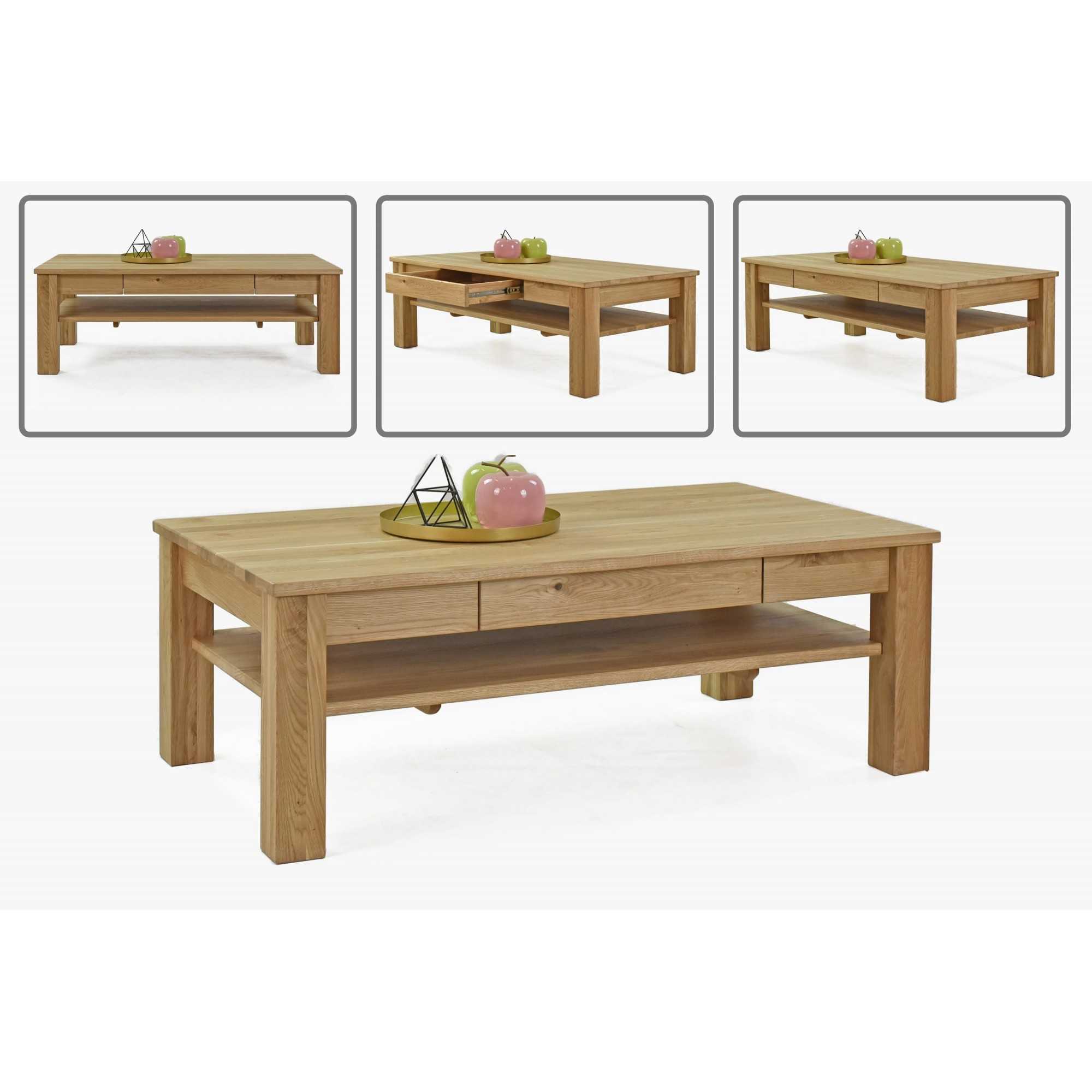 Tömör tölgyfa dohányzóasztal polcokkal és fiókokkal, natúr színű
