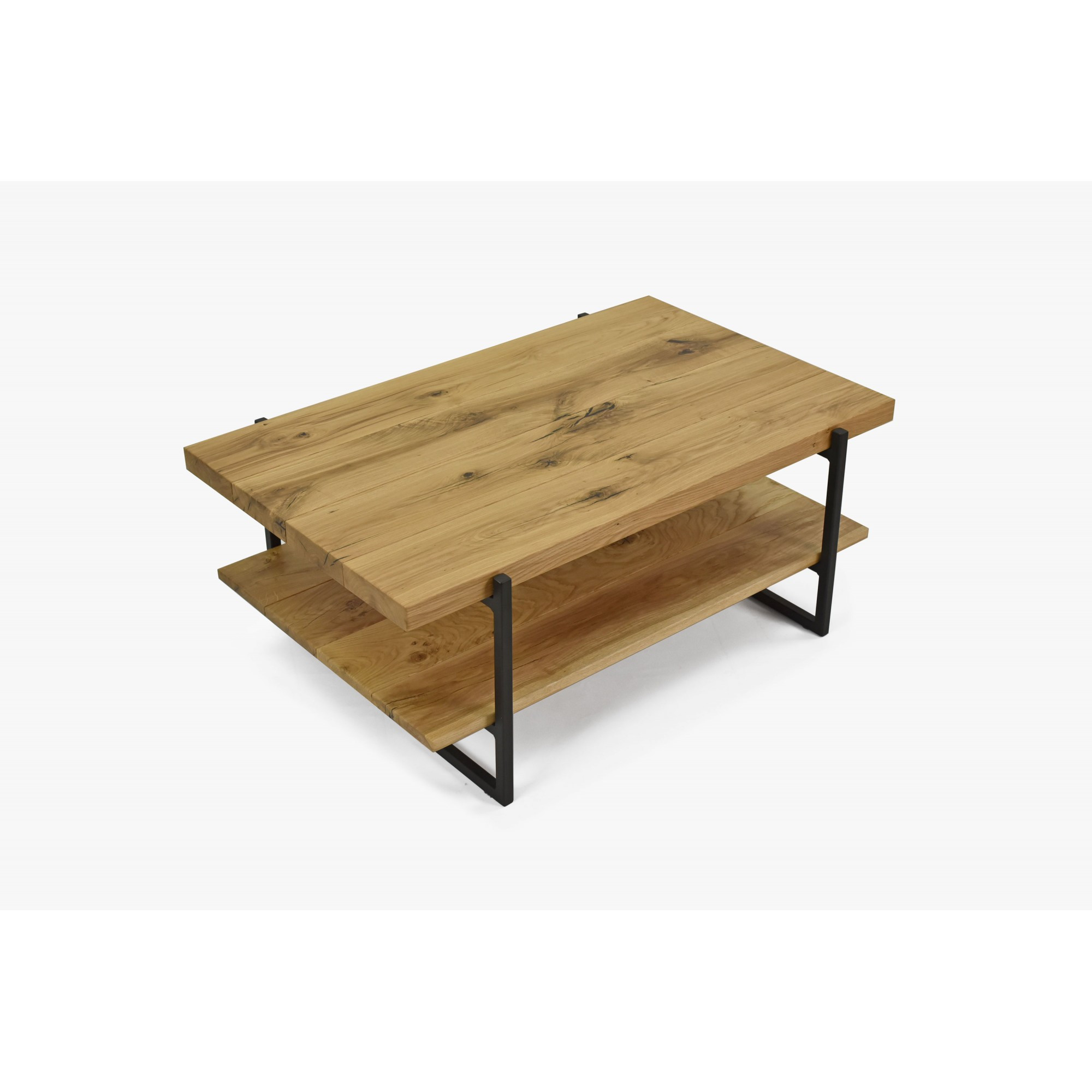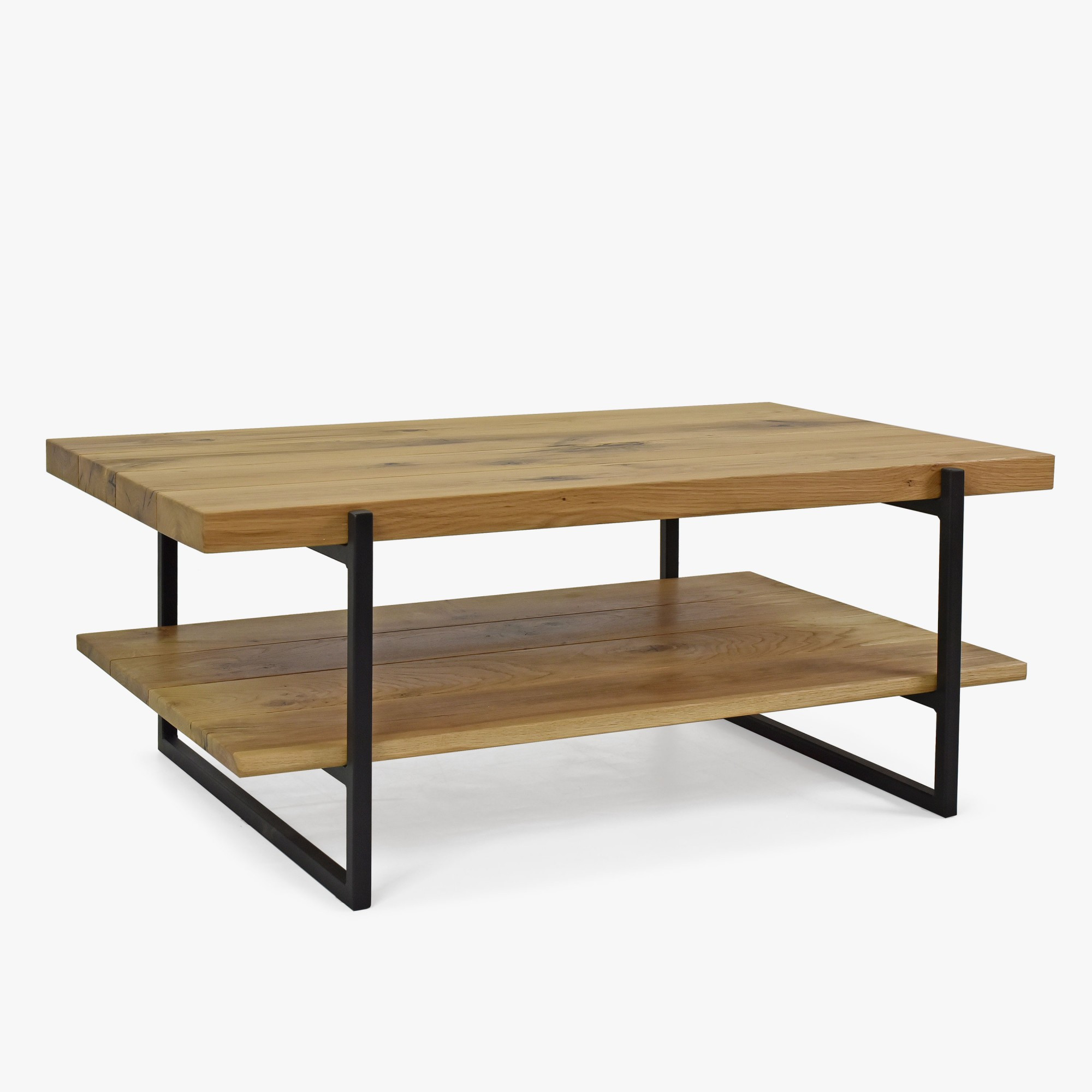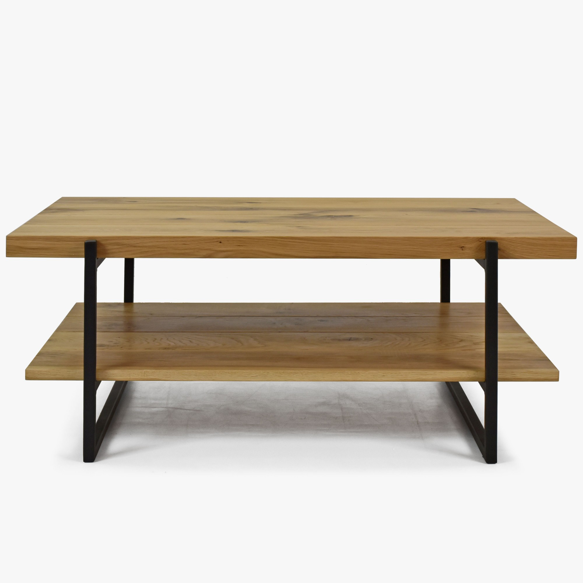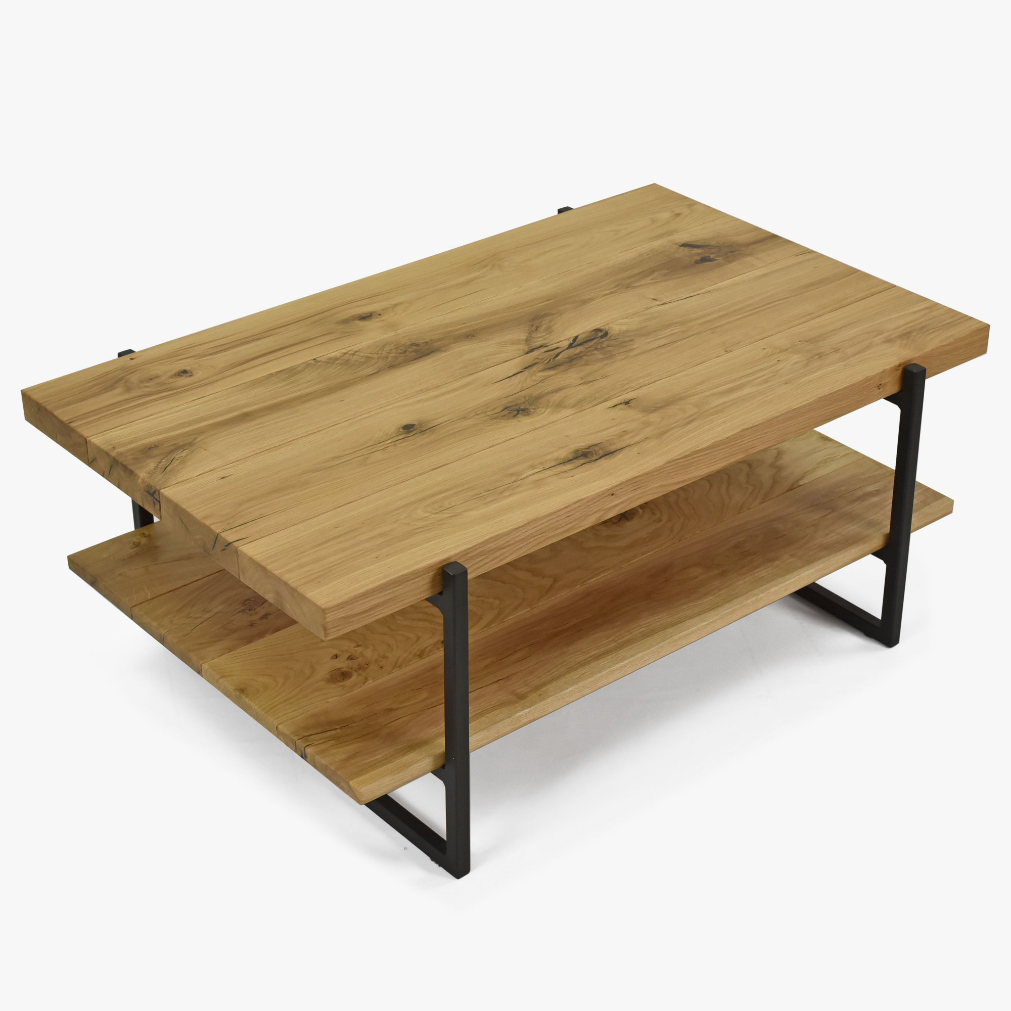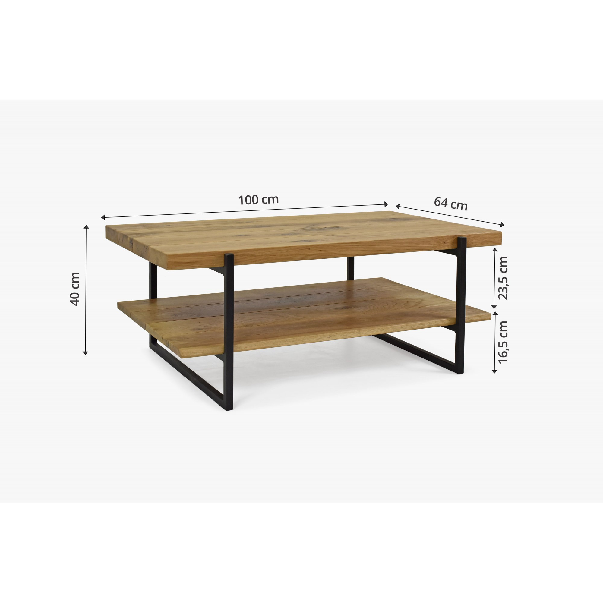 Masszív tölgy dohányzóasztal polccal, fekete matt fém lábakkal