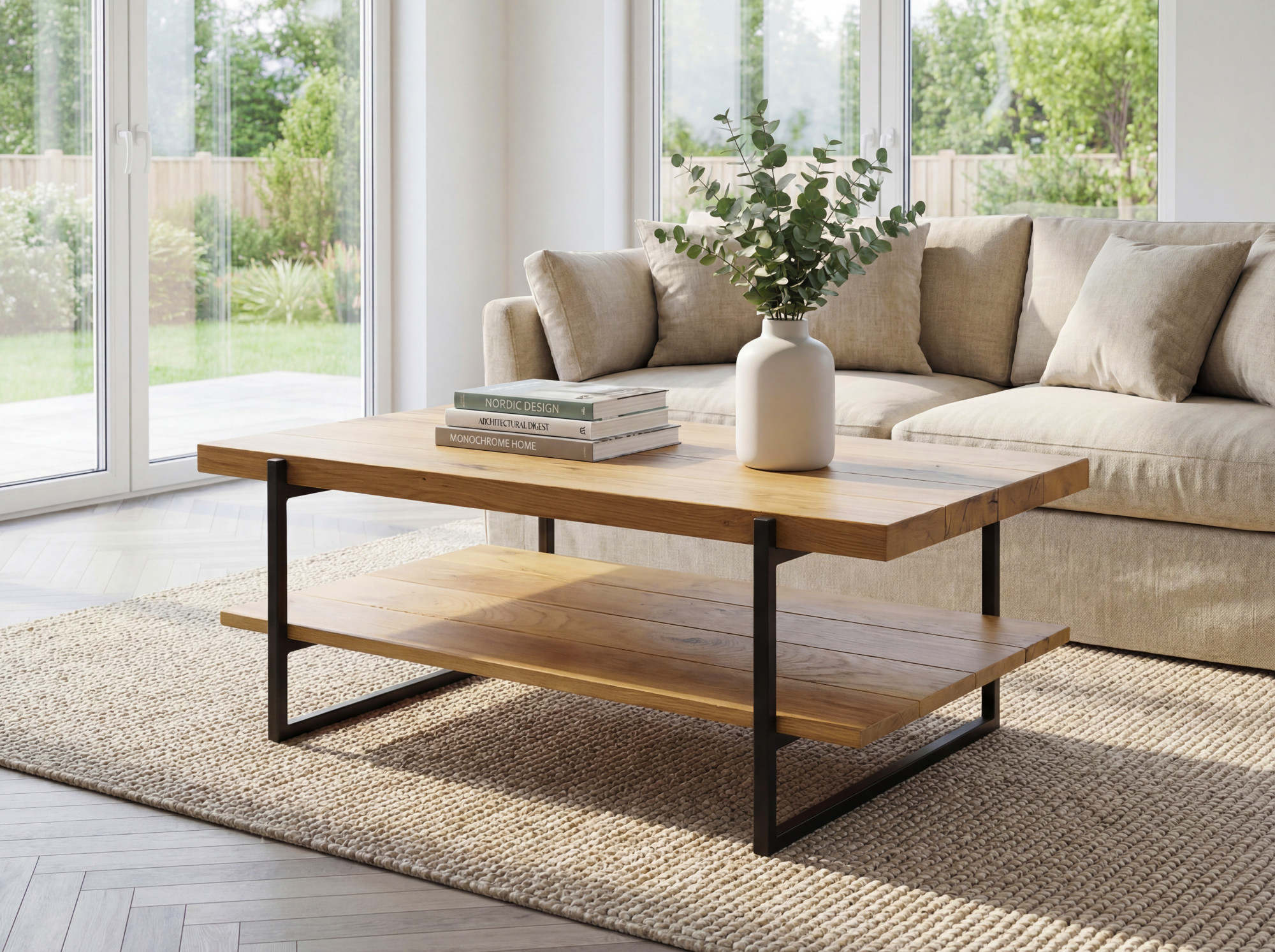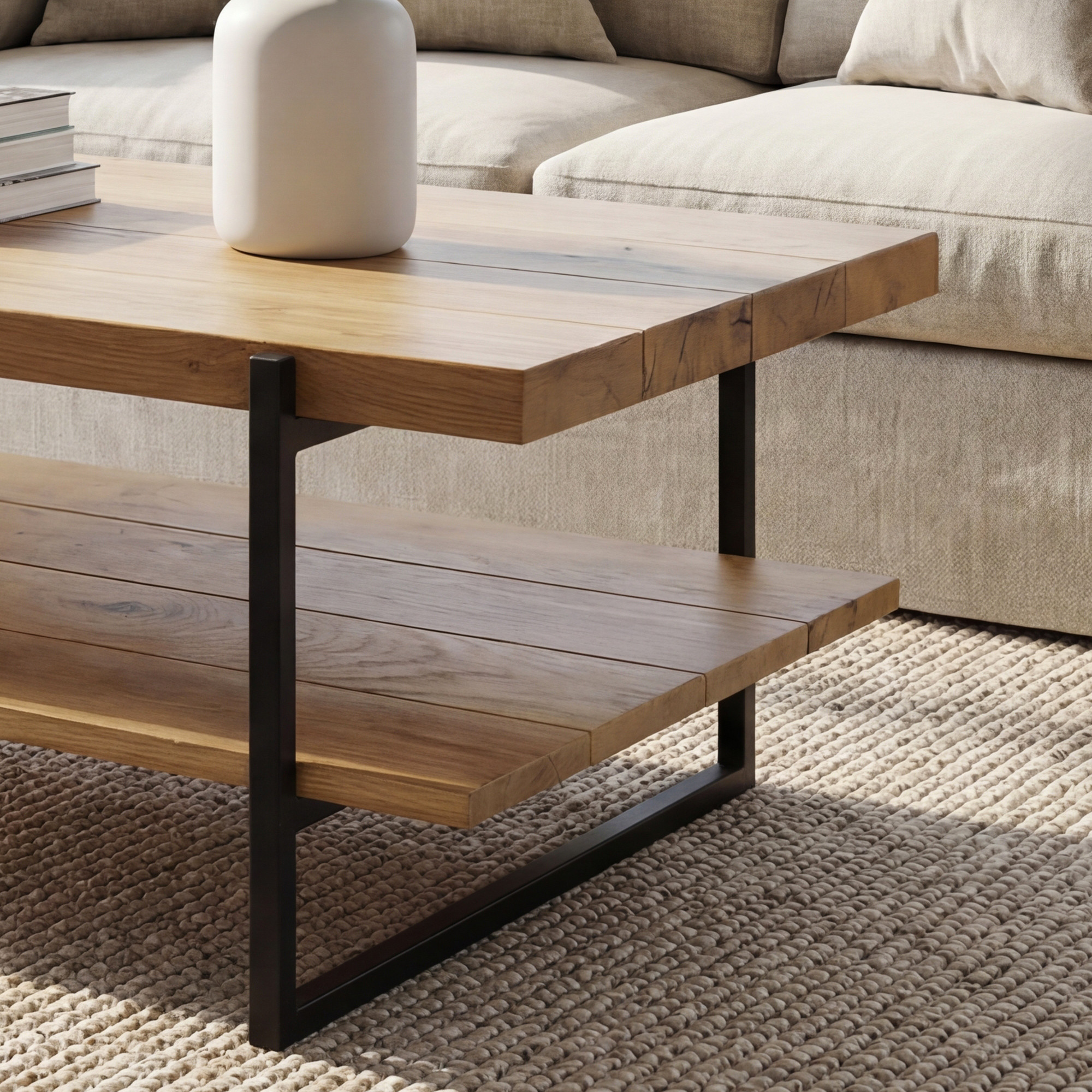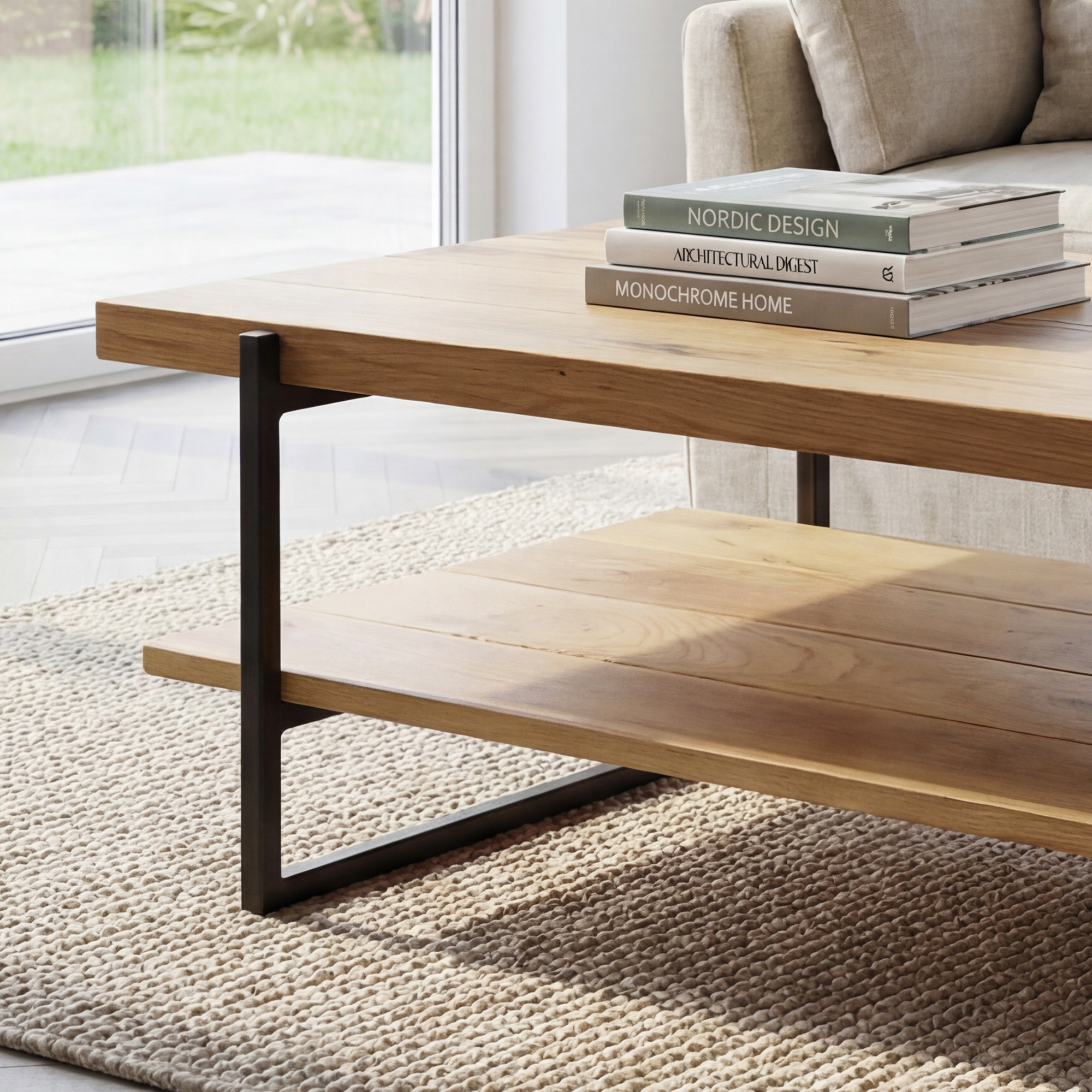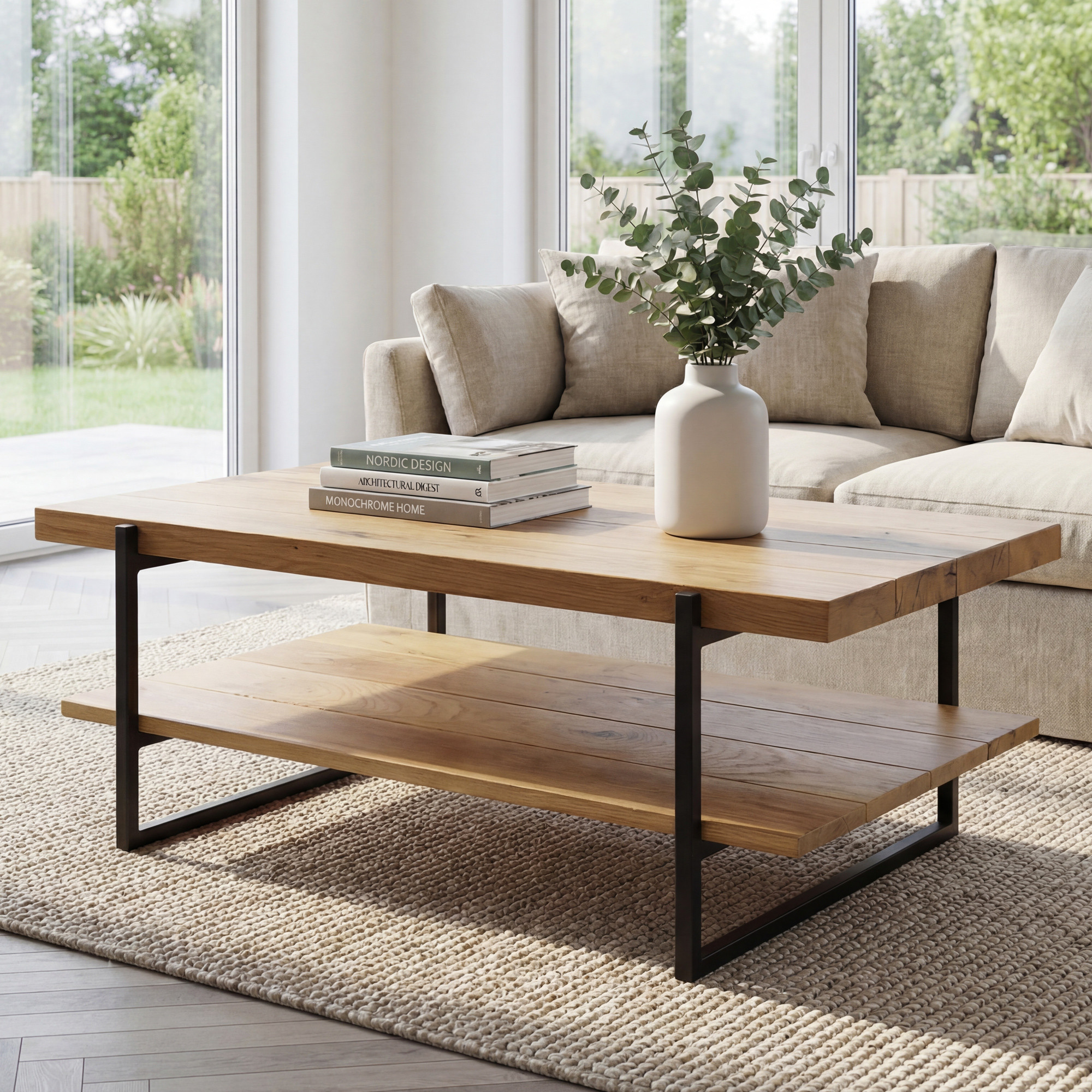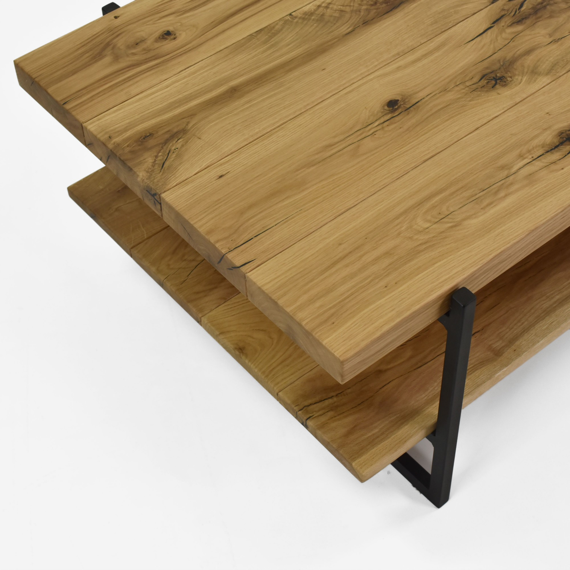 Masszív tölgy dohányzóasztal polccal, fekete matt fém lábakkal