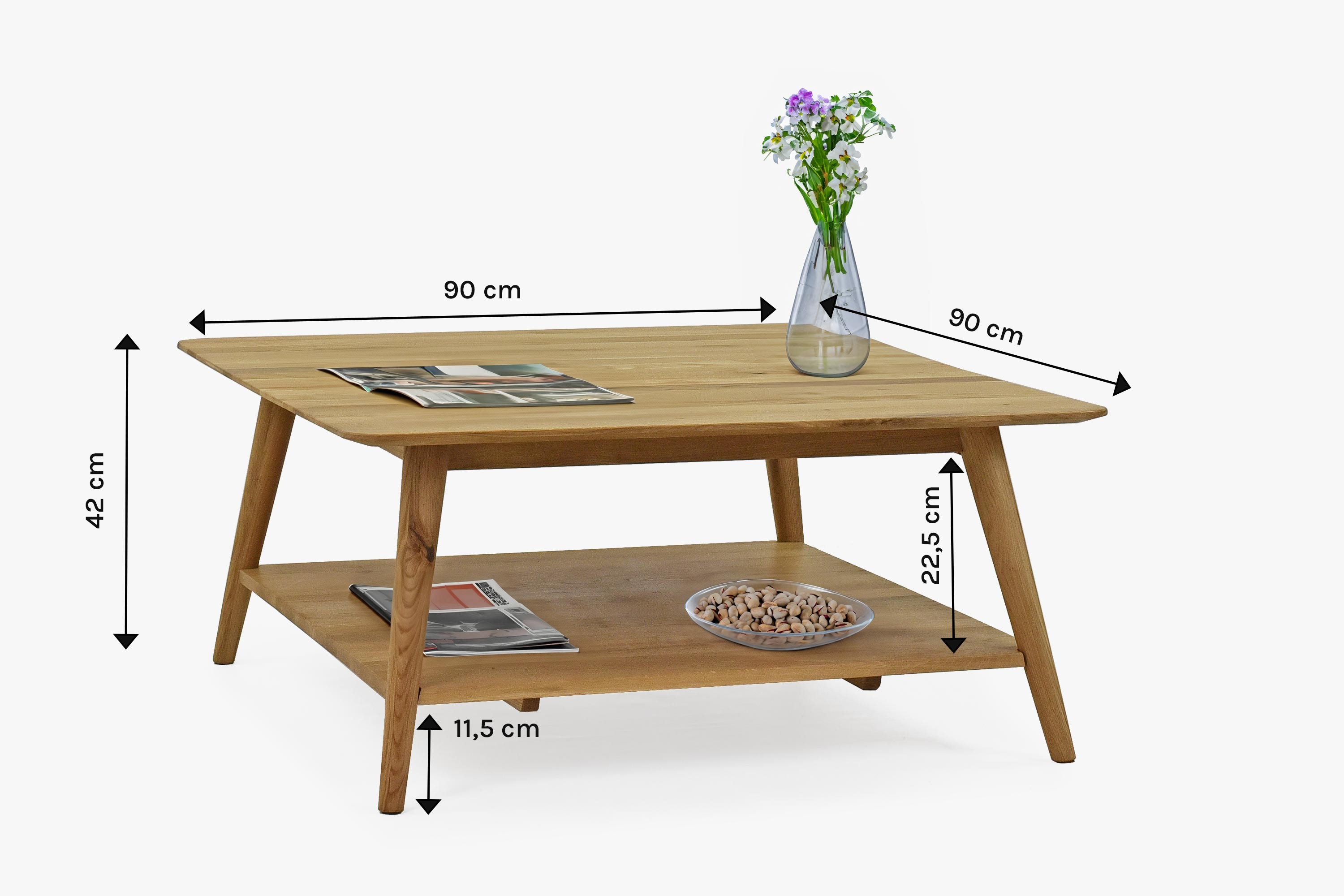 Tömör tölgyfa dohányzóasztal polccal, skandináv stílusú, 90x90 cm