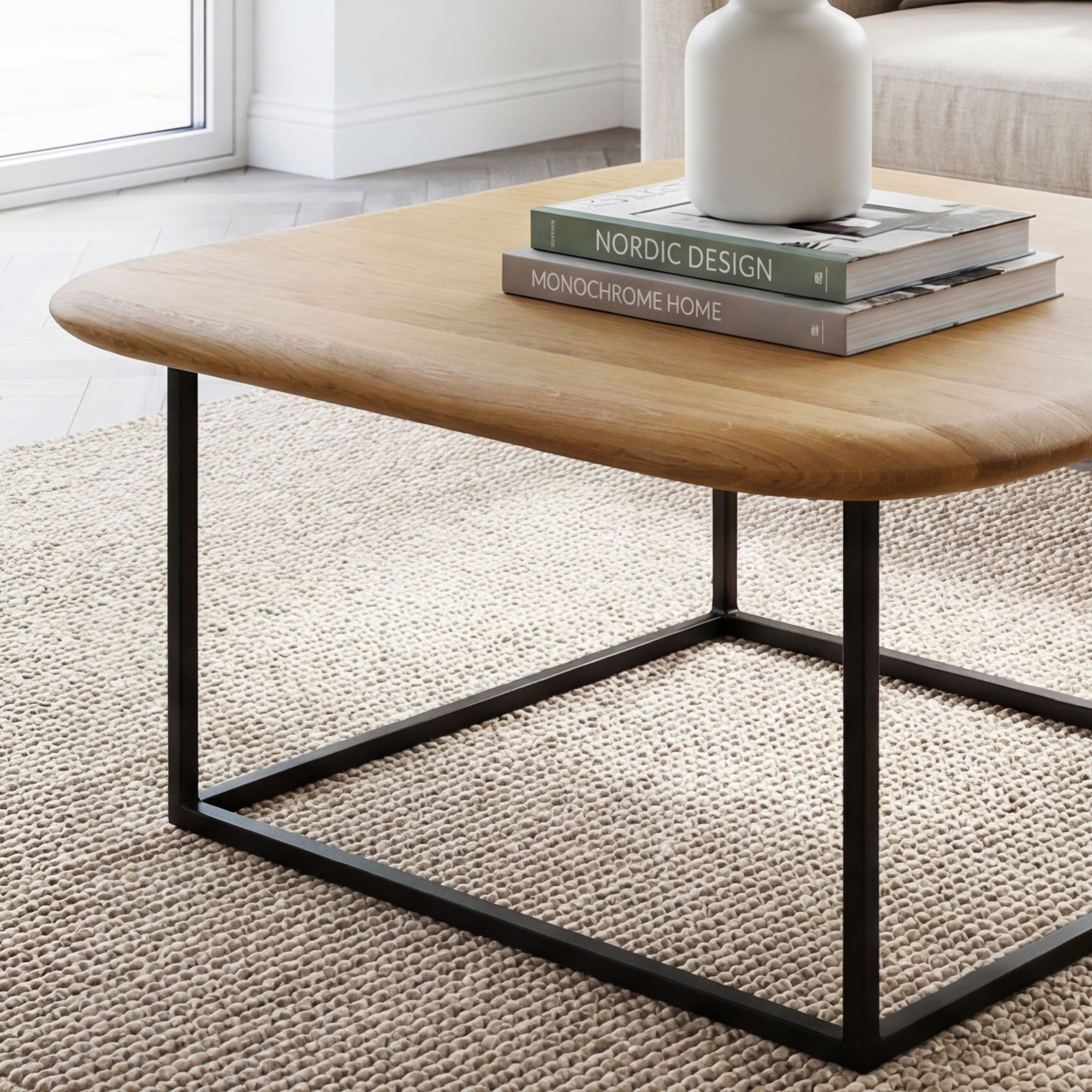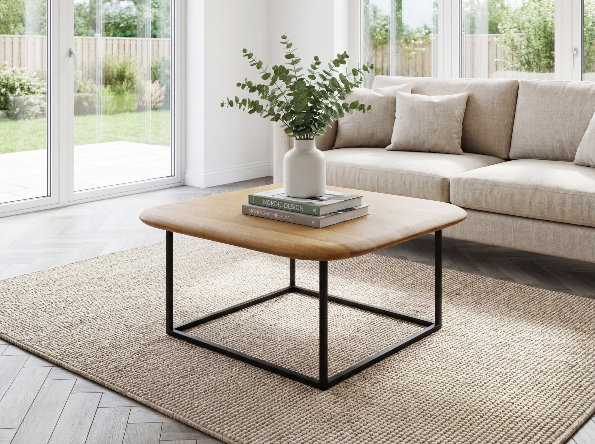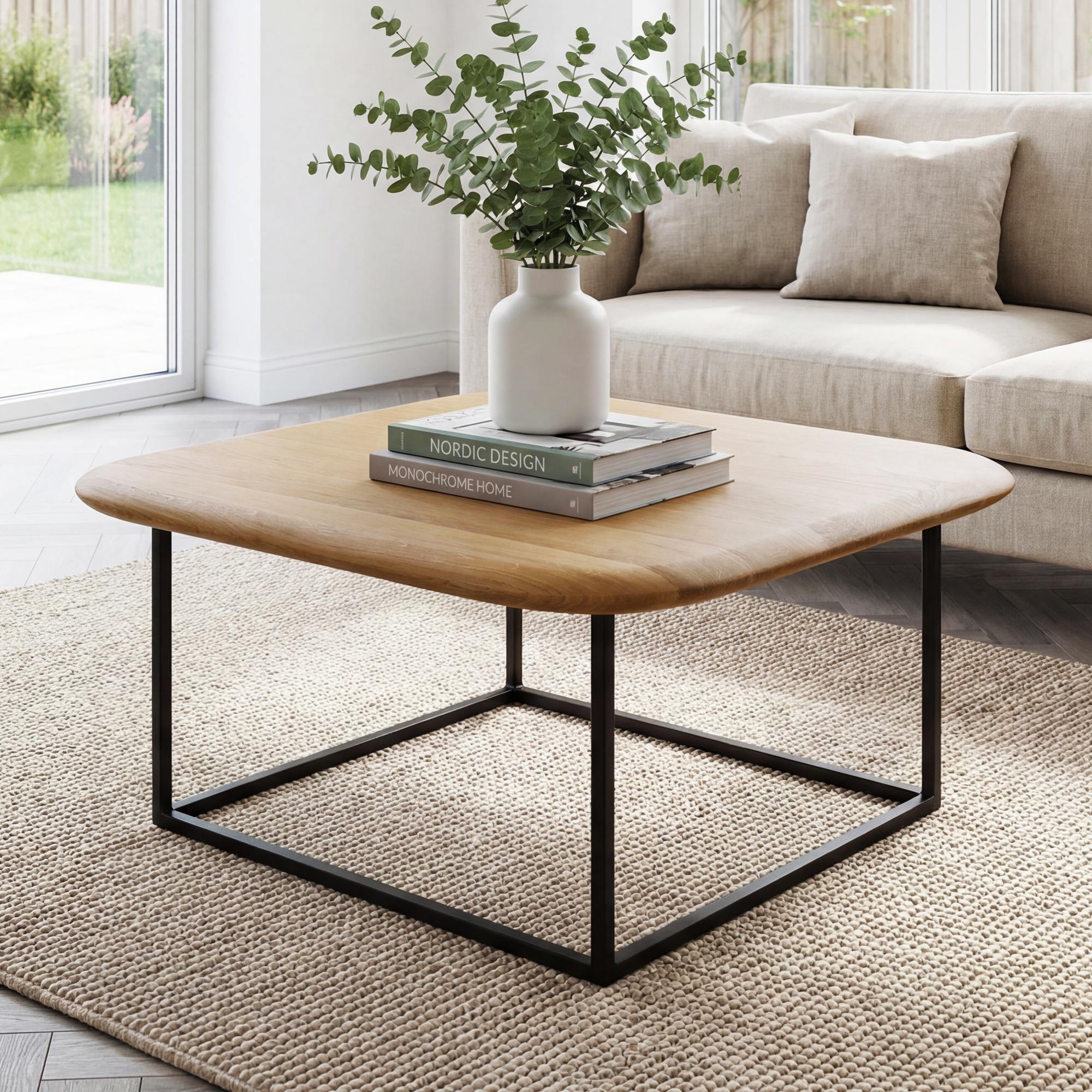 Fa négyzet alakú dohányzóasztal, amely nagyszerű kiegészítője minden nappalinak. Ez az asztal, amely minőségi tölgyfa asztallapot és fekete matt vasból készült lábakat ötvöz, robusztusságával és modern dizájnjával tűnik ki. A tölgyfa ismert tartósságáról és hosszú élettartamáról, ami ideálissá teszi bútorgyártásra. A fa természetes struktúrája és lekerekített élei vizuális könnyedséget és eleganciát adnak az asztalnak, míg a lap vastagsága 4 cm garantálja annak stabilitását és szilárdságát.