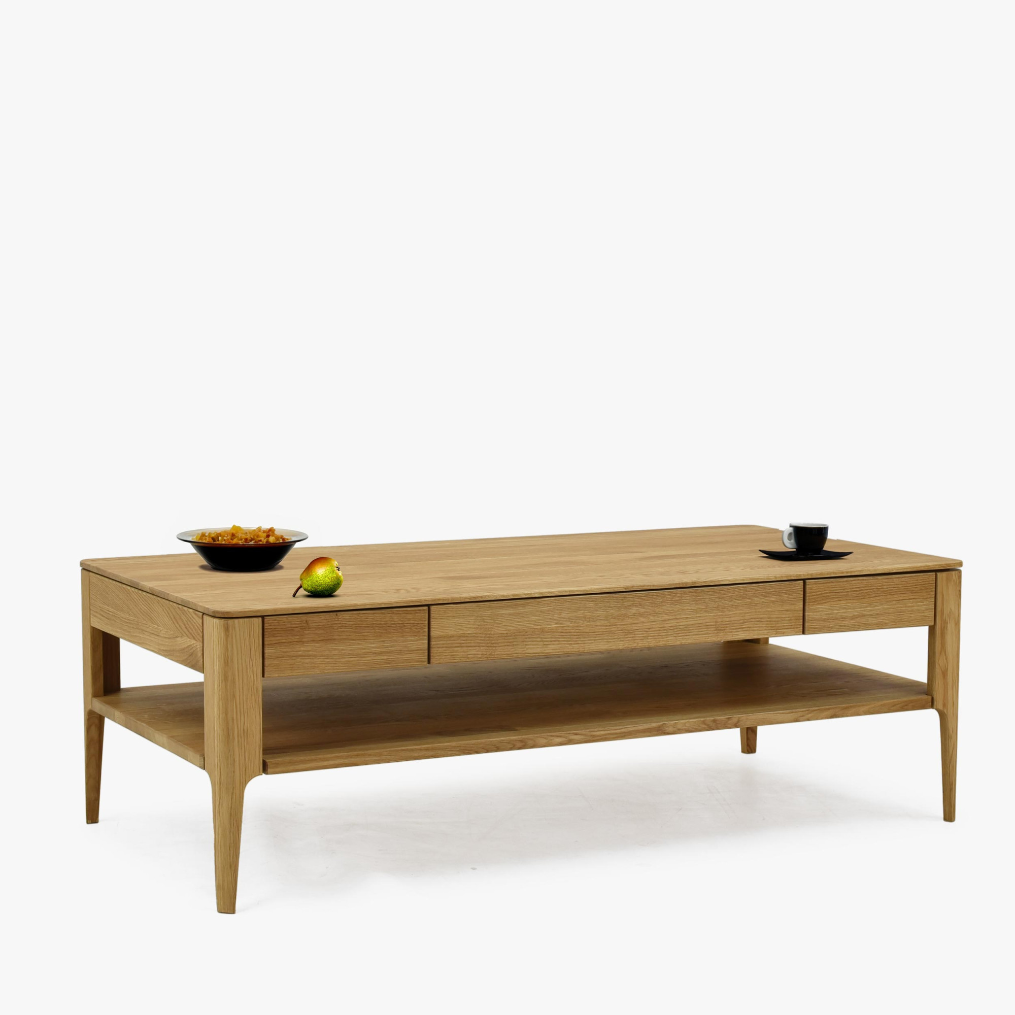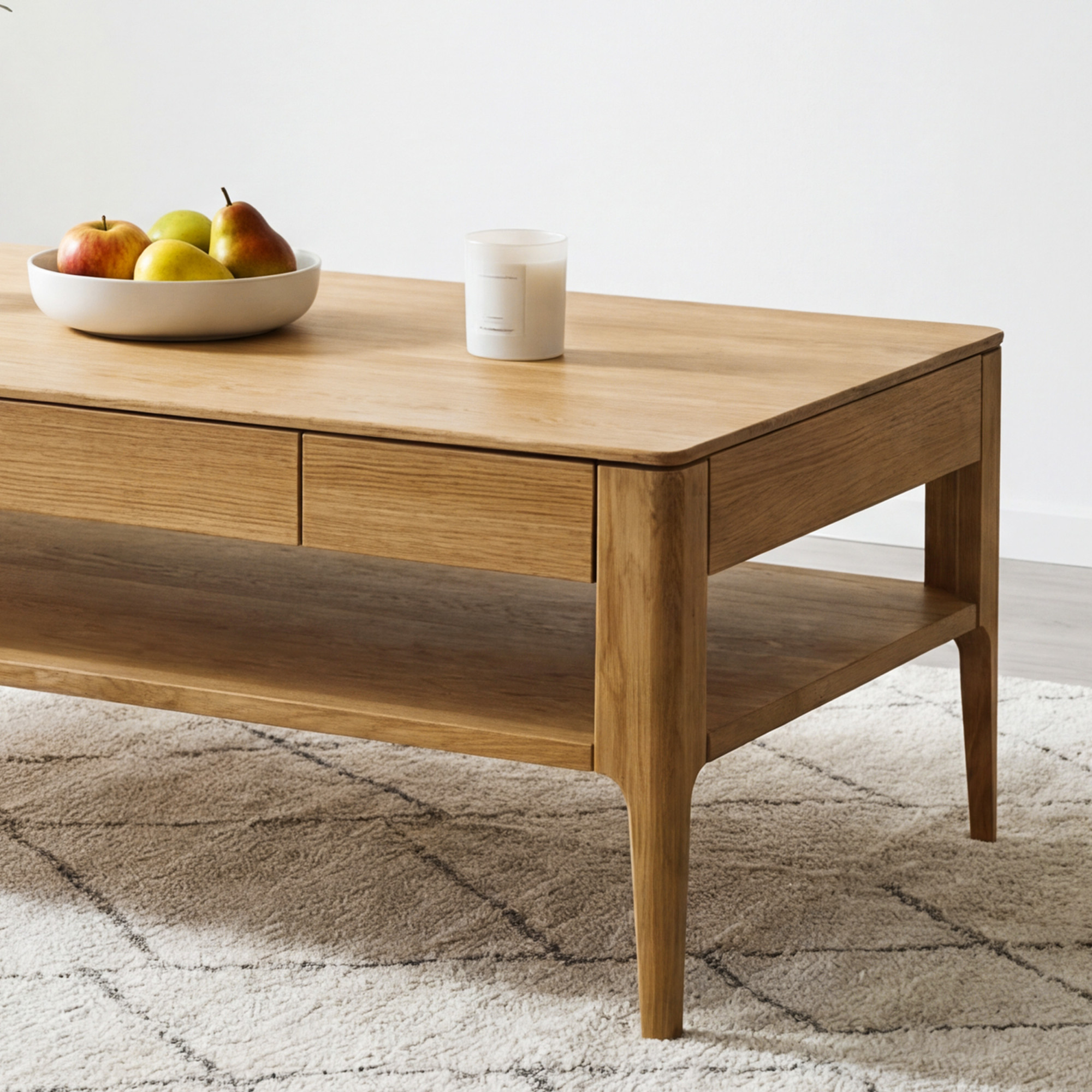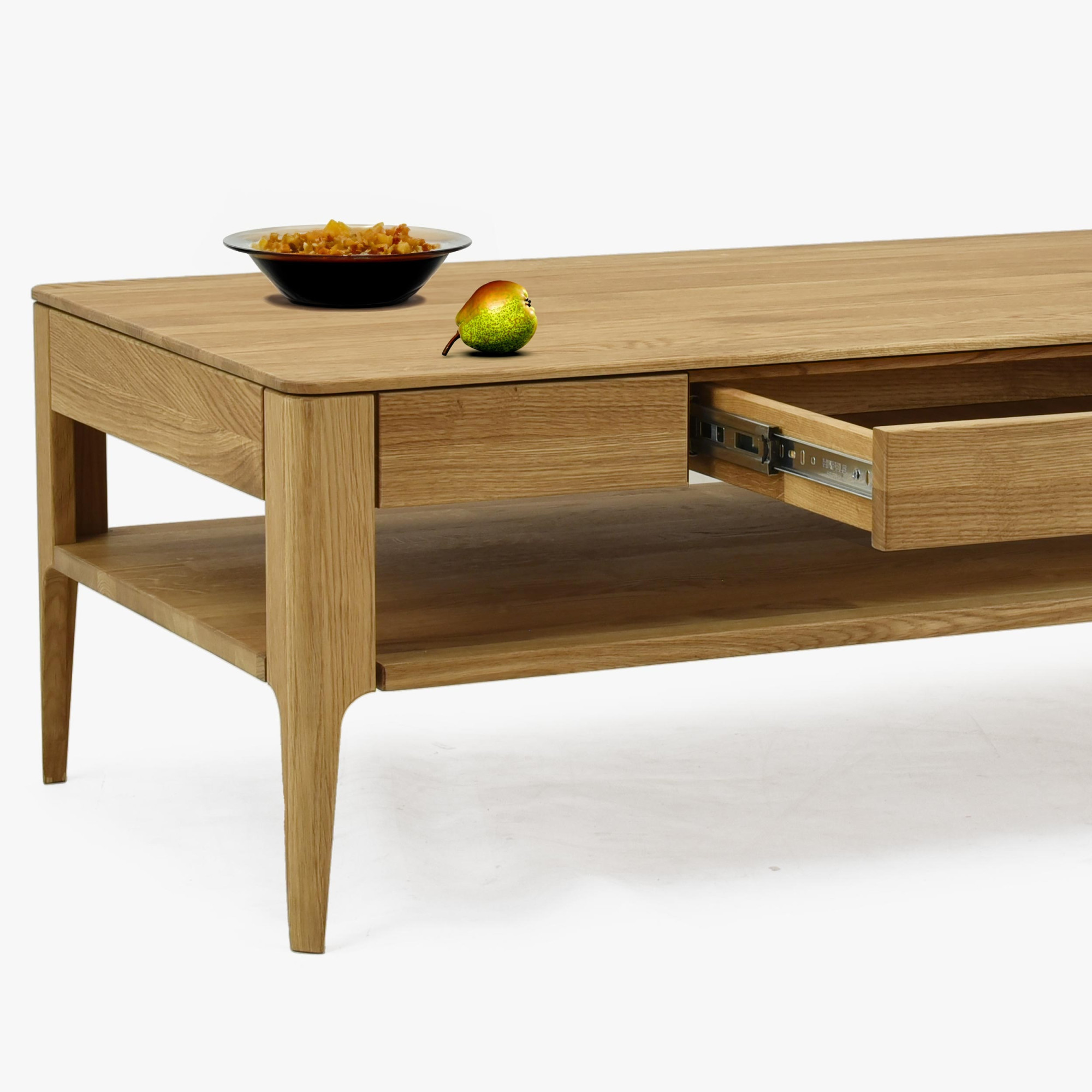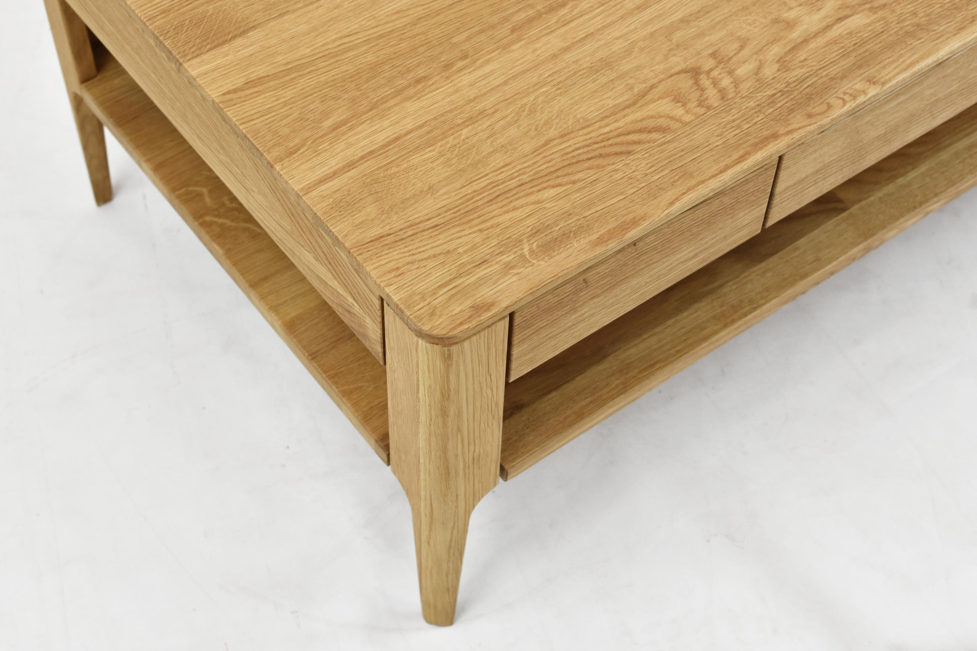 Tömör tölgy dohányzóasztal fiókkal, lekerekített sarokkal, modern