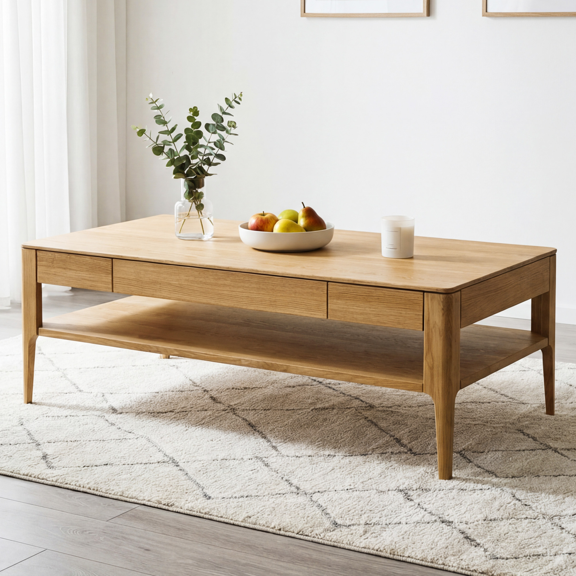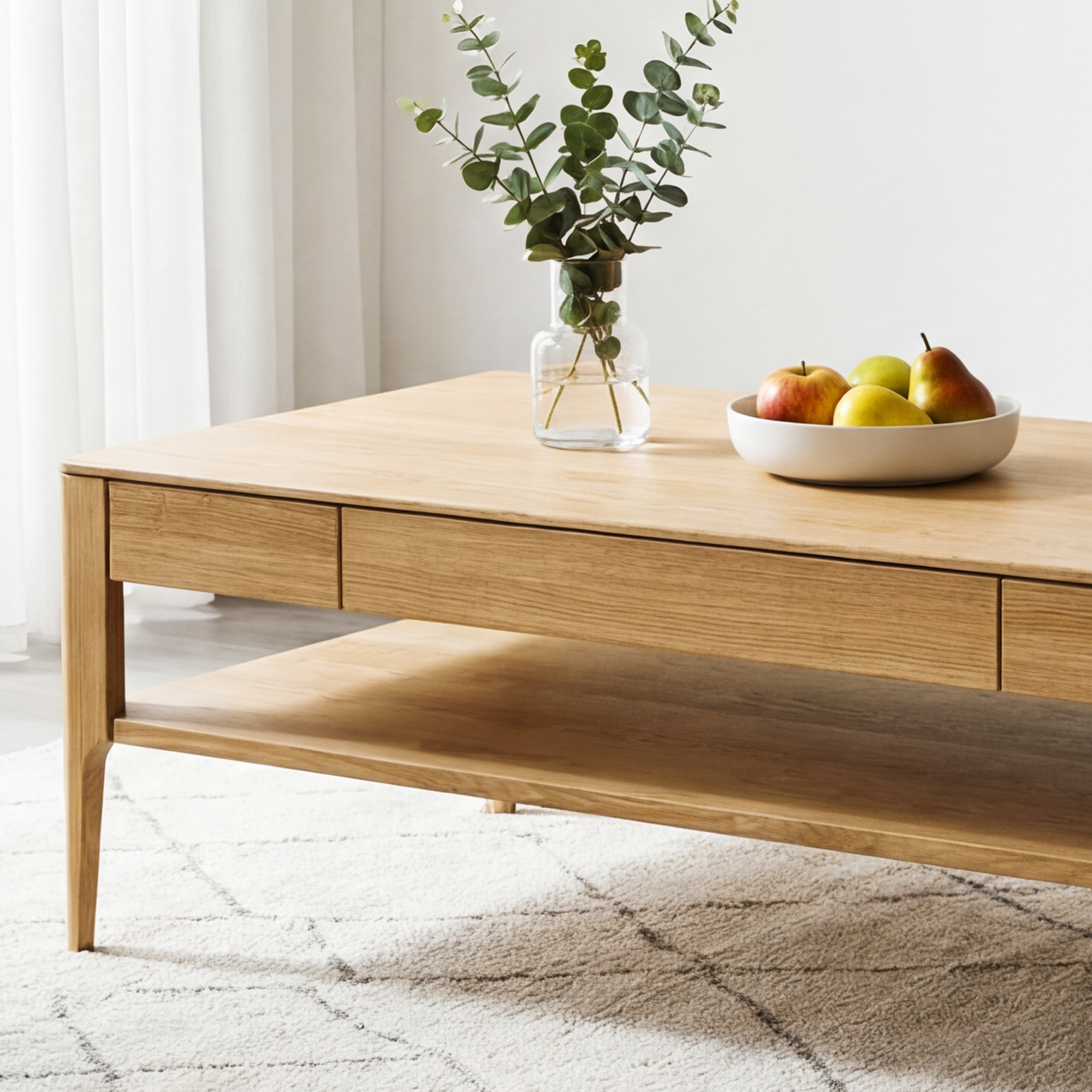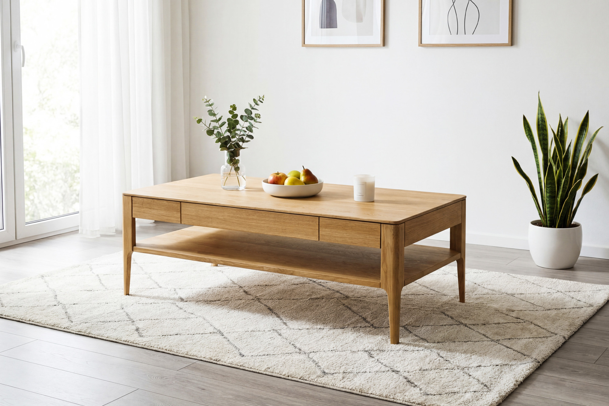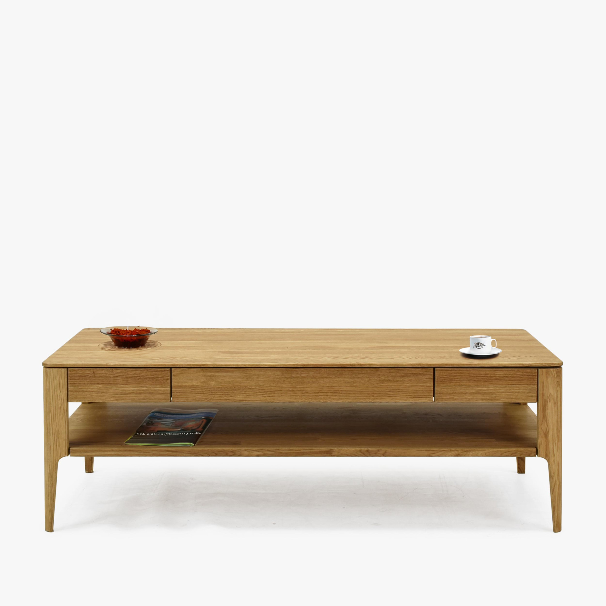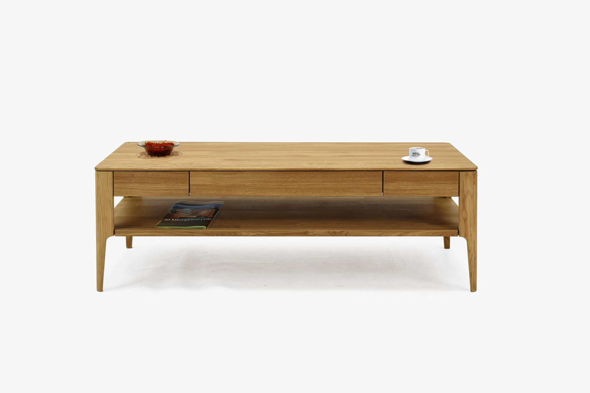 Tömör tölgy dohányzóasztal fiókkal, lekerekített sarokkal, modern