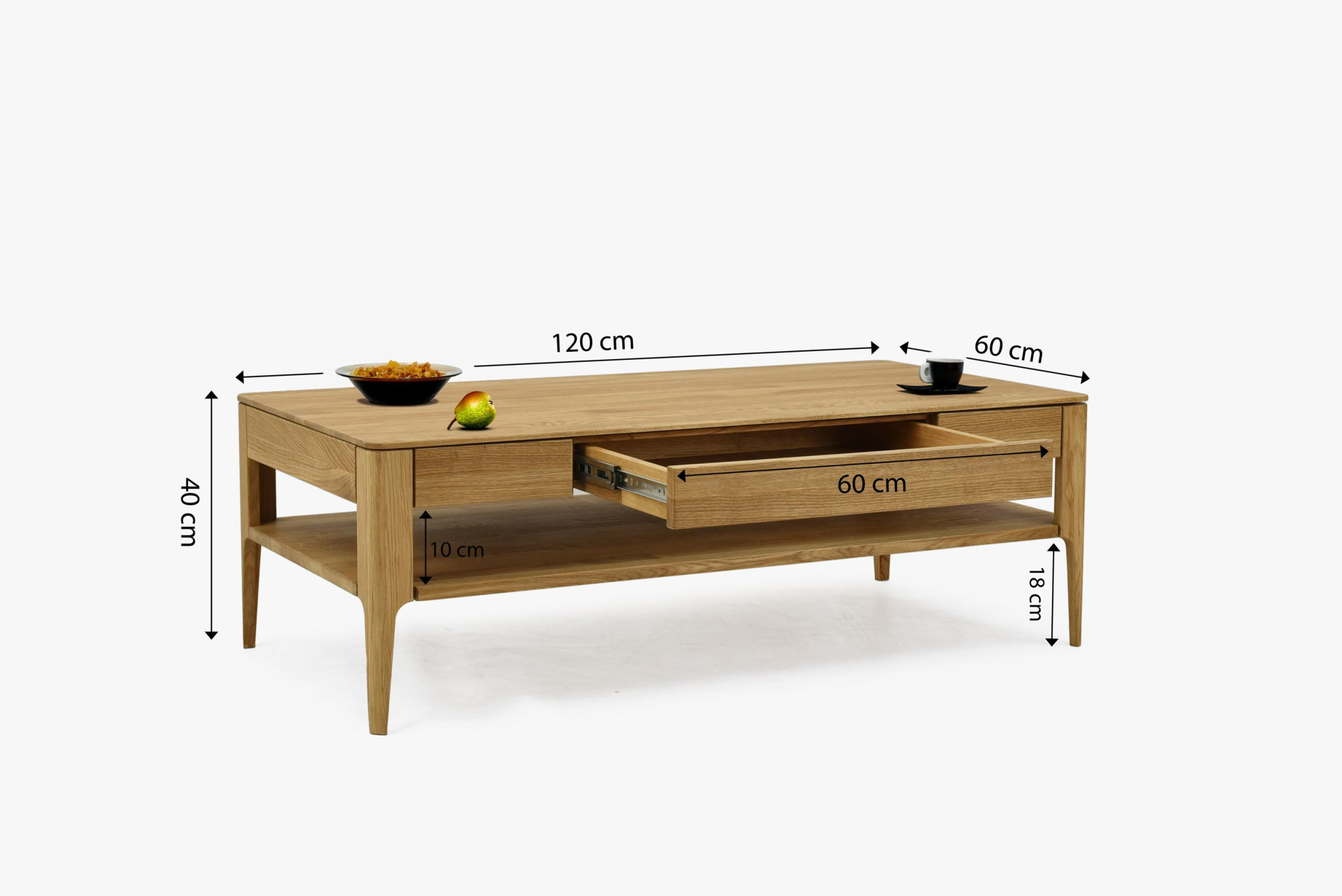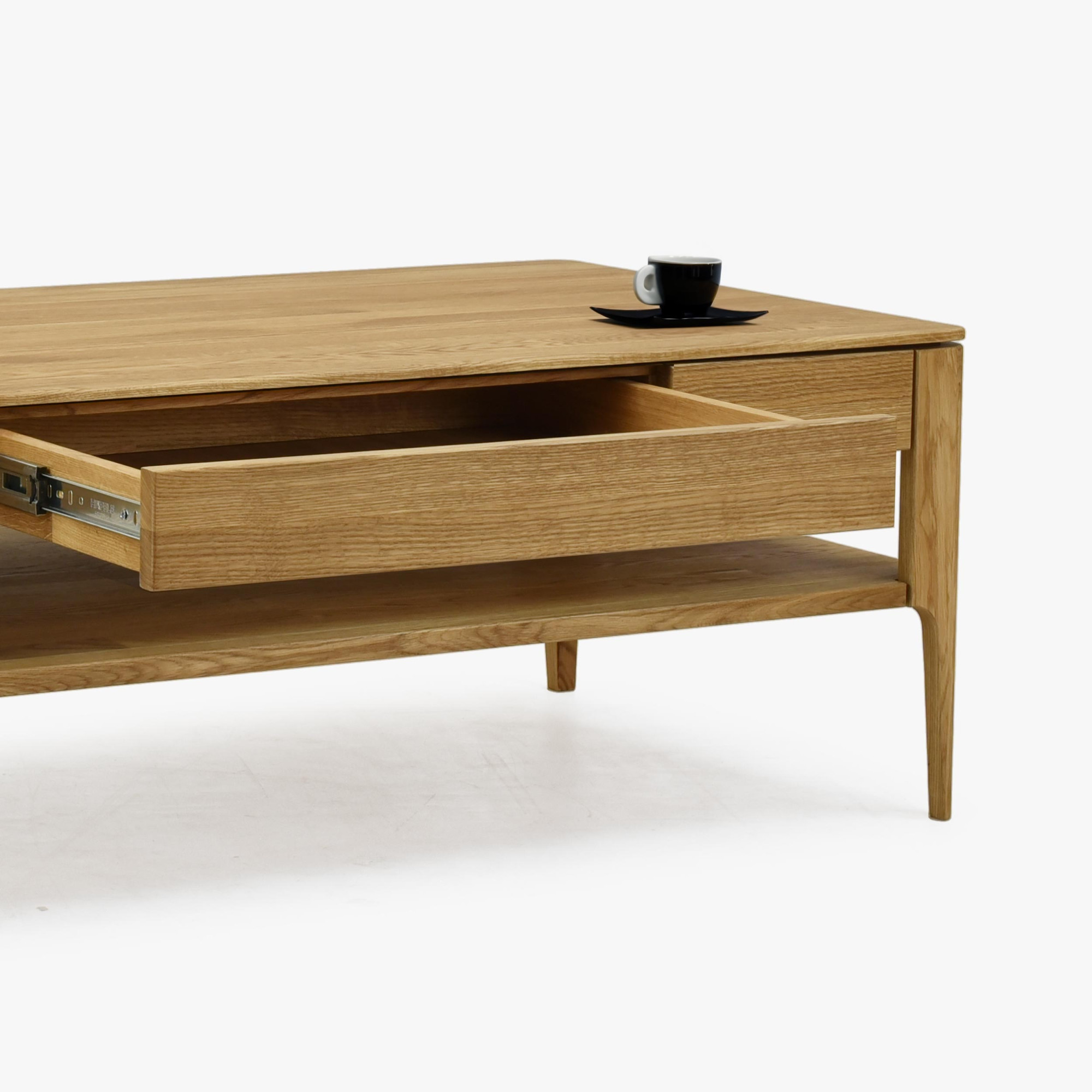 A dohányzóasztal nagyon praktikus átgondolt elrendezésének köszönhetően. Tároló polccal és egy fiókkal rendelkezik kisebb tárgyak elhelyezésére, így elegendő tárolóhelyet biztosít igényeihez. Az összes fiók és ajtó csendes záródású, soft-close megoldással, amely sima és halk működést biztosít, továbbá növeli a bútor élettartamát. Az asztal felülete olasz Borma Wachs olajjal van kezelve tölgy natural színben, amely kiemeli a fa természetes erezetét és védelmet nyújt a külső hatásokkal szemben.