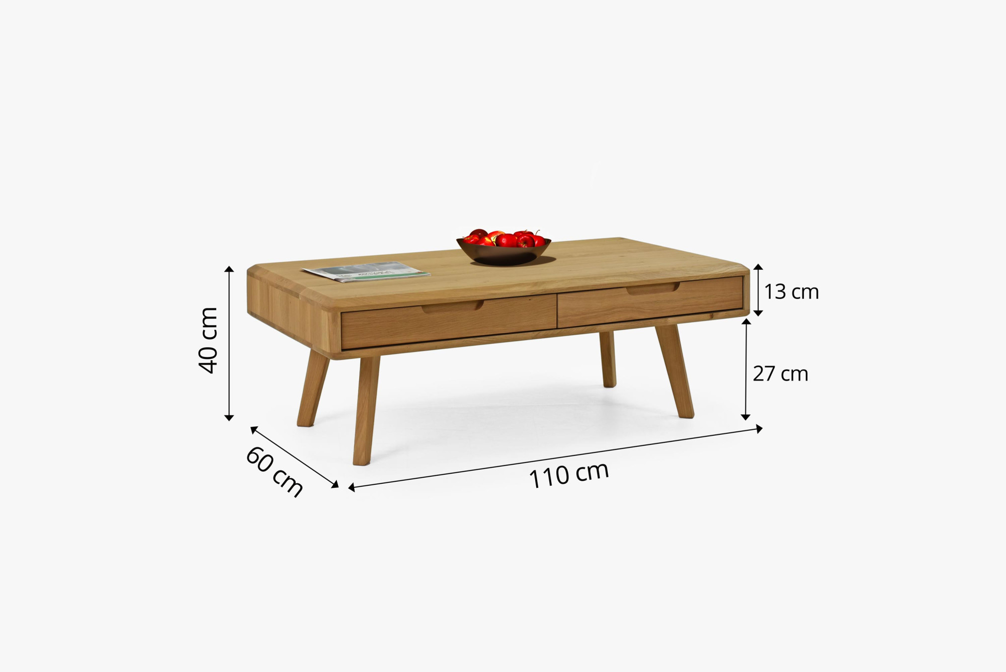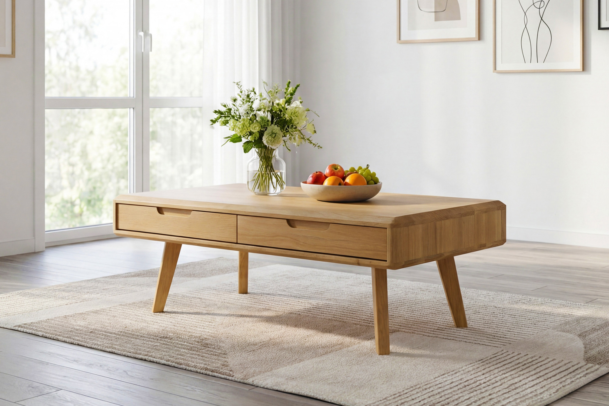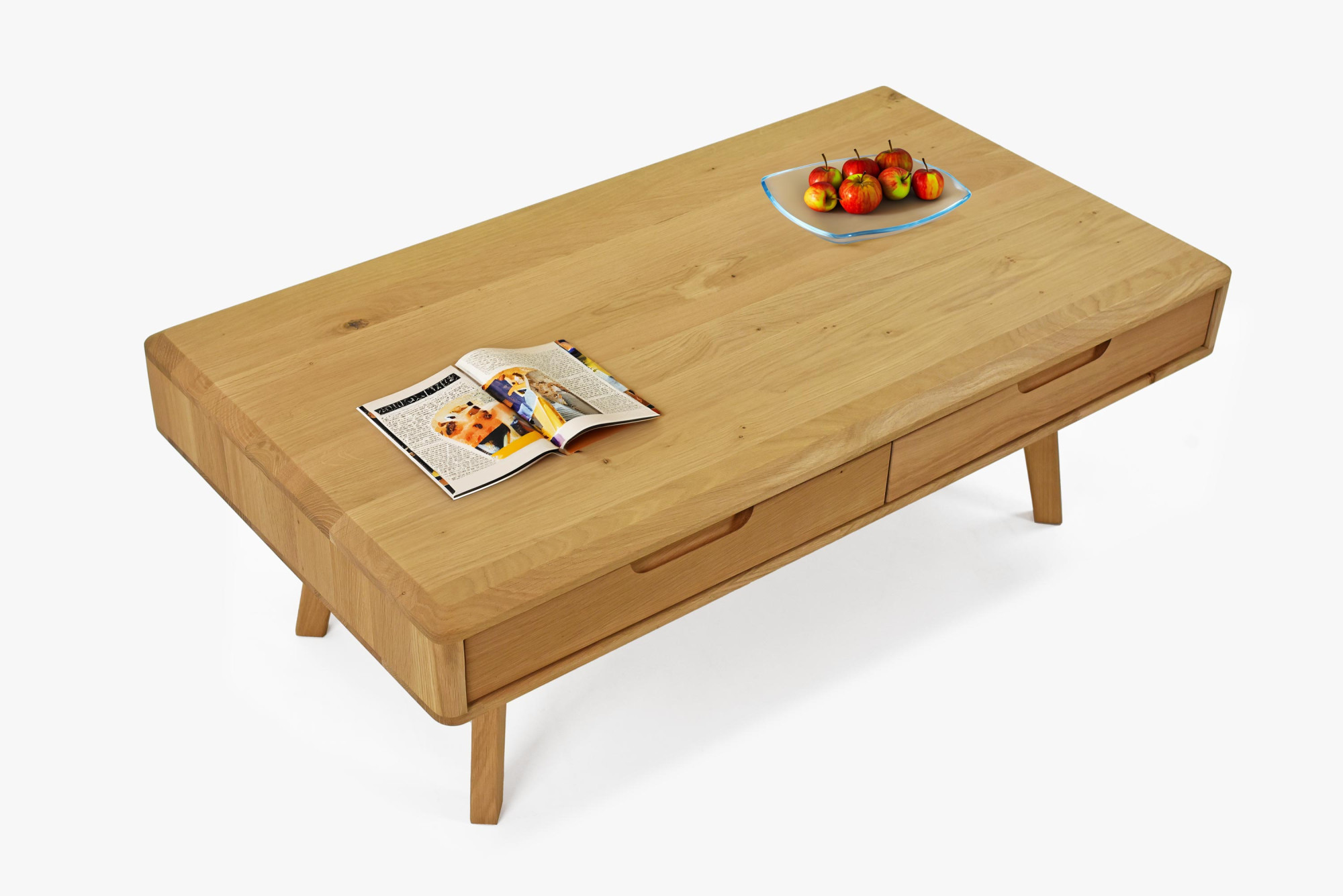 Tömör tölgy dohányzóasztal lábakkal és 4 fiókkal, természetes tölgy