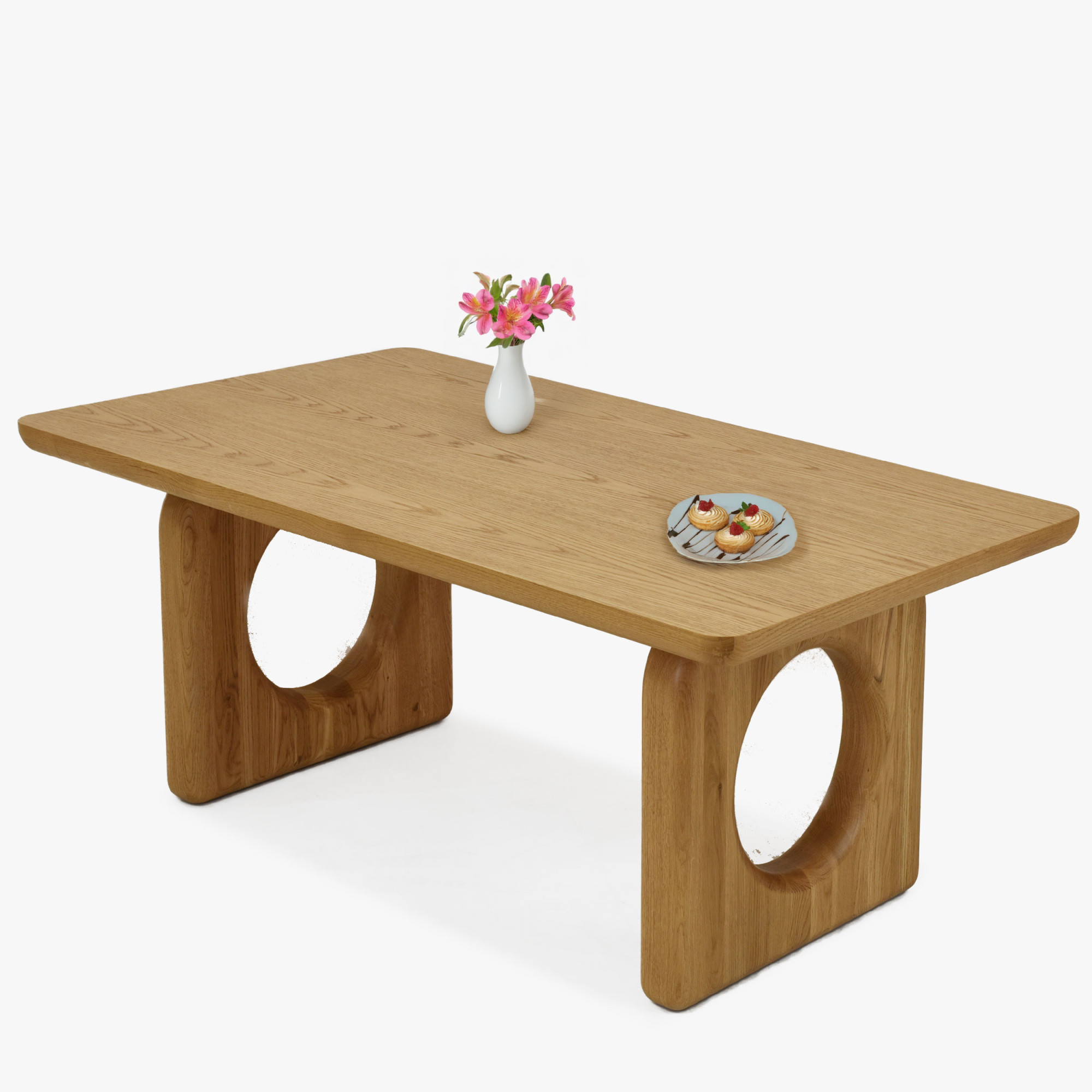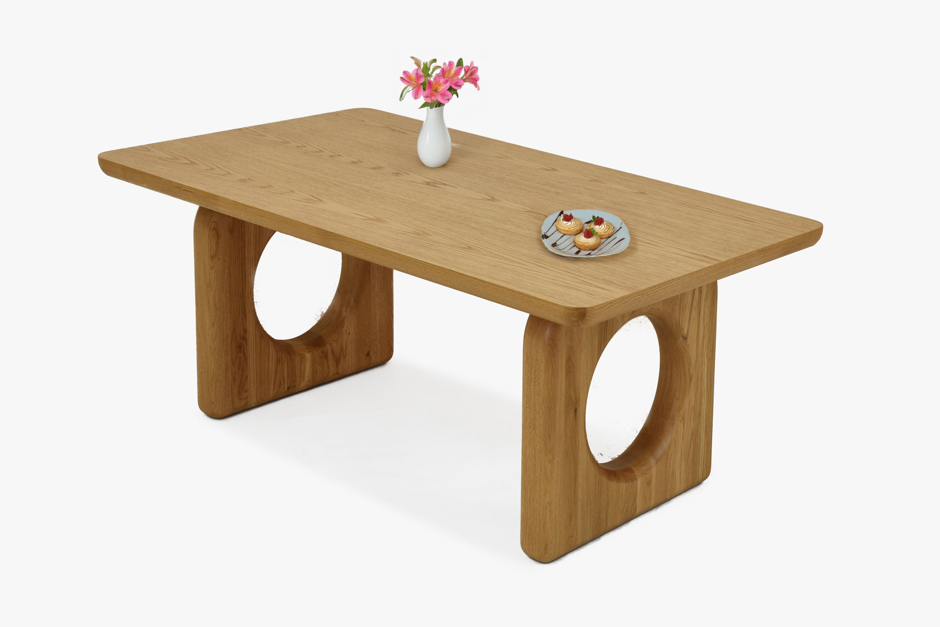 A meghatározó elem a lábak, melyek stílusos körkivágásokkal rendelkeznek, ez biztosítja a stabilitást és egyedi karaktert ad az asztalnak. A felső lap minőségi tölgy furnérból készült, masszív élekkel a természetes megjelenés hangsúlyozásához. A matt lakk védelmet nyújt a felületnek a kisebb karcok és foltok ellen.