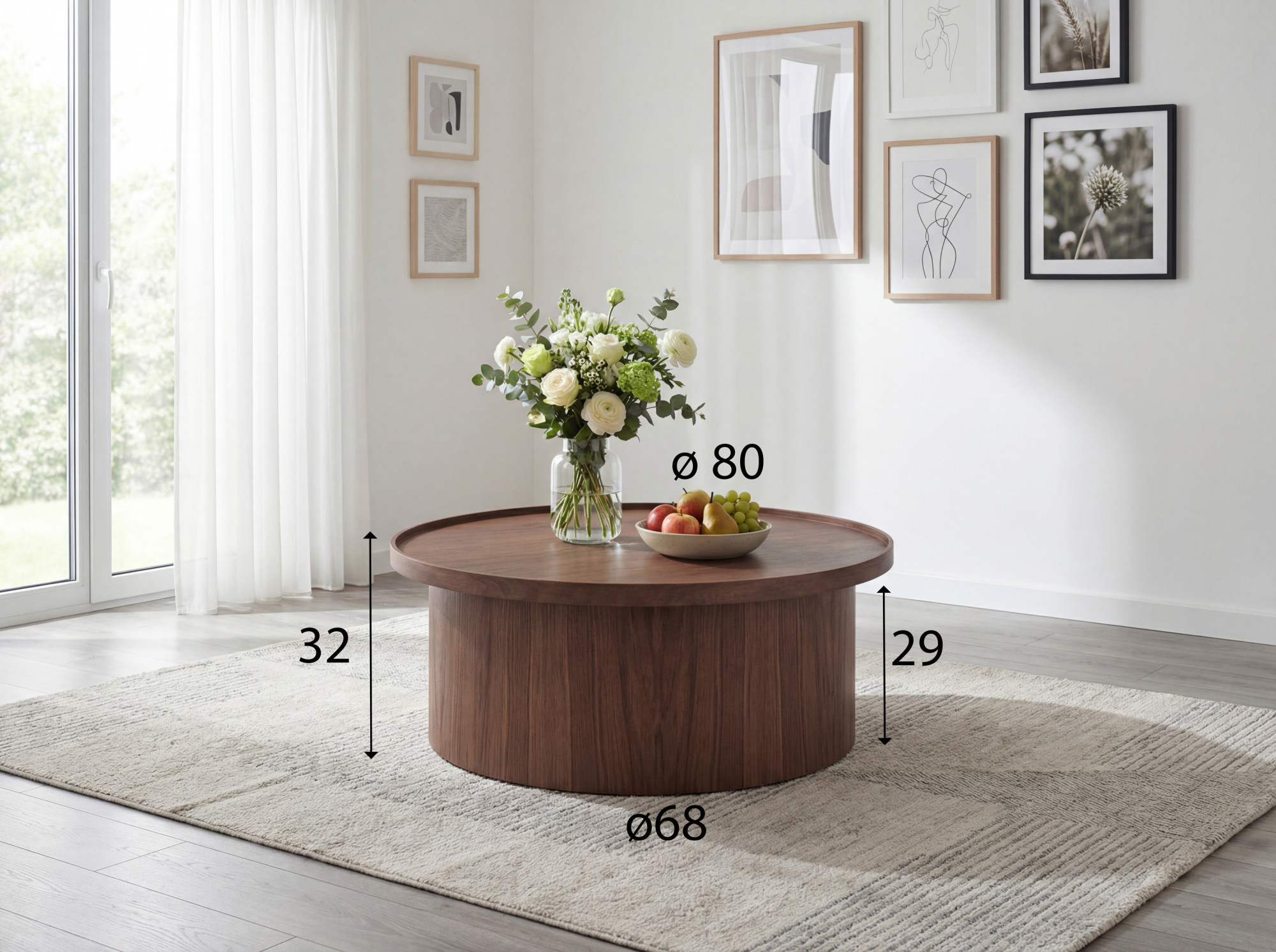 Az asztal nemcsak szép, hanem praktikus is – méretei ideálisak kisebb és tágasabb nappalik számára egyaránt. Teljesen összeszerelve szállítjuk, azonnal használatba vehető. Elegáns dió színének köszönhetően könnyen kombinálható további azonos árnyalatú bútorokkal vagy más természetes anyagokkal. A kínálatban megtalálható egy kisebb, 45 cm átmérőjű változat is, amely önállóan vagy kiegészítőként vásárolható meg. Dió színű tölgyfa dohányzóasztal megfelel a magas környezetvédelmi követelményeknek is – a használt furnér FSC tanúsítvánnyal rendelkezik, ami a fa felelős eredetét garantálja.