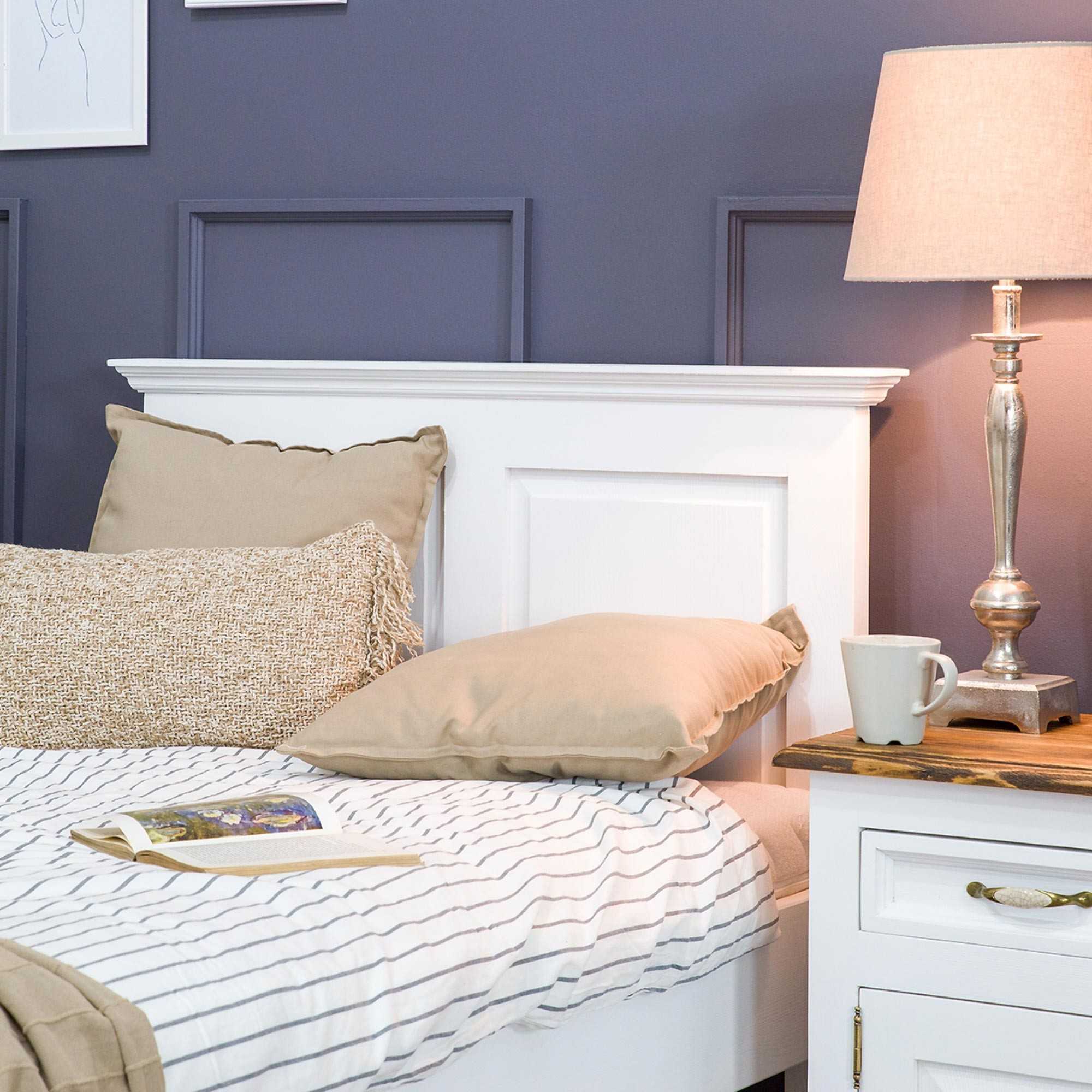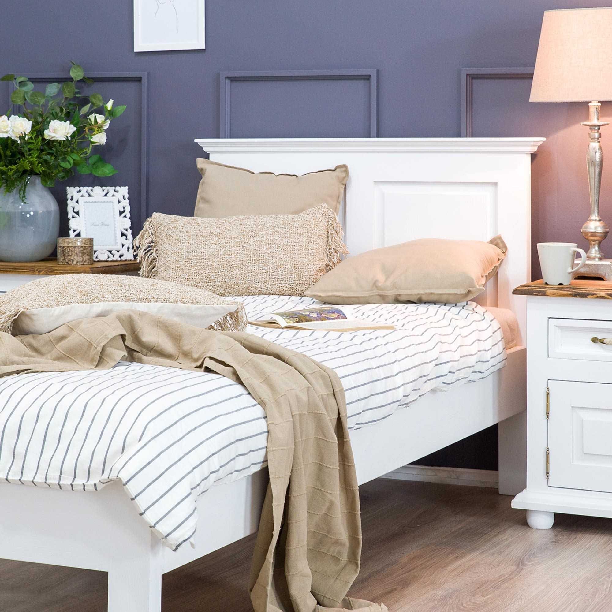 A masszív konstrukció ötödik középső lábbal biztosítja a stabilitást. A fehér ökológiai festék és patina hatású felület különleges, kopottas megjelenést kölcsönöz a bútoroknak. Az ágyba bármilyen ágyrács (rostély) behelyezhető, azonban az ágyrács nem tartozék. A Provence stílusú ágy tökéletesen kombinálható a kollekció többi elemével, például éjjeli szekrénnyel vagy komóddal, így egy egységes és hangulatos hálószobai enteriőrt alakíthat ki.