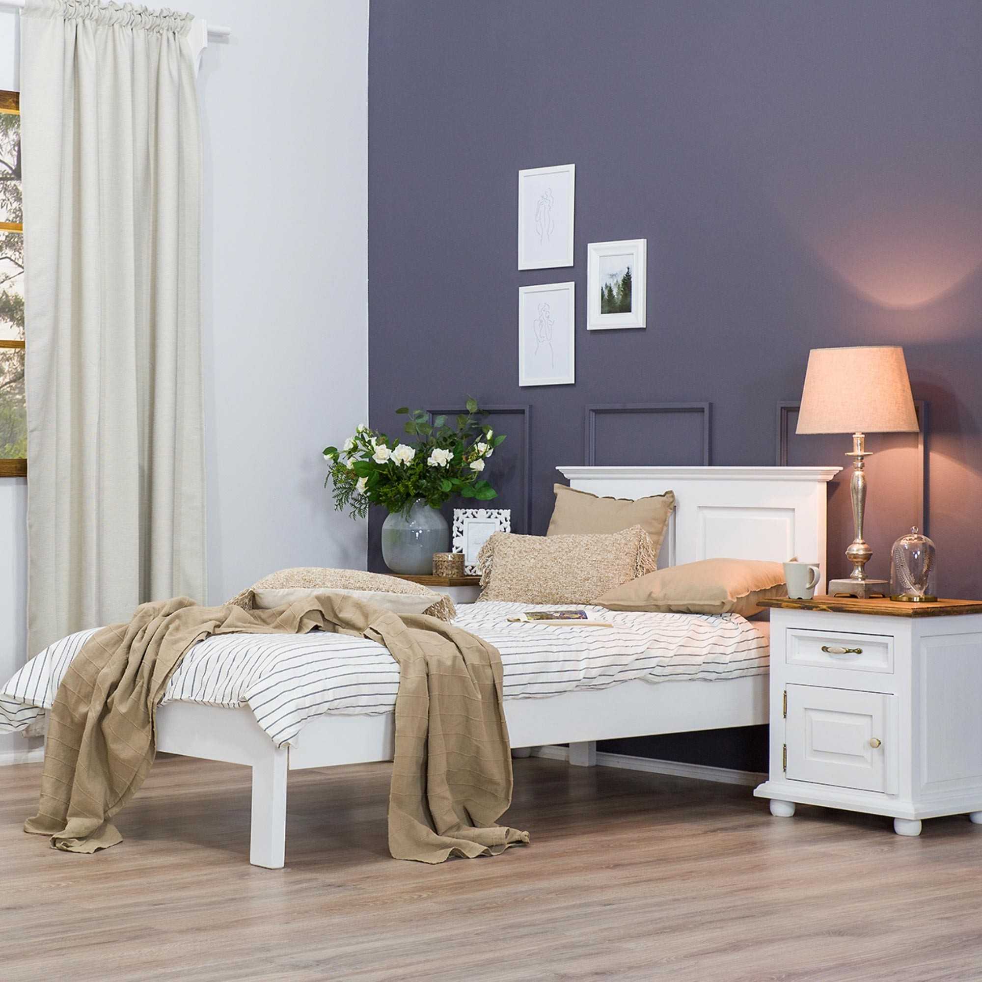 Ez a egyszemélyes ágy ideális választás azok számára, akik elegáns, időtálló Provence stílust és kényelmes fekvőfelületet keresnek hálószobájukba. A fehér, tömör borovi fenyőből készült ágy 90x200 cm-es matracméretre készült, így tökéletes kisebb helyiségekbe vagy egyedülállóknak. Praktikus kialakítása megkönnyíti a mindennapi használatot és egyedi hangulatot teremt a szobában.