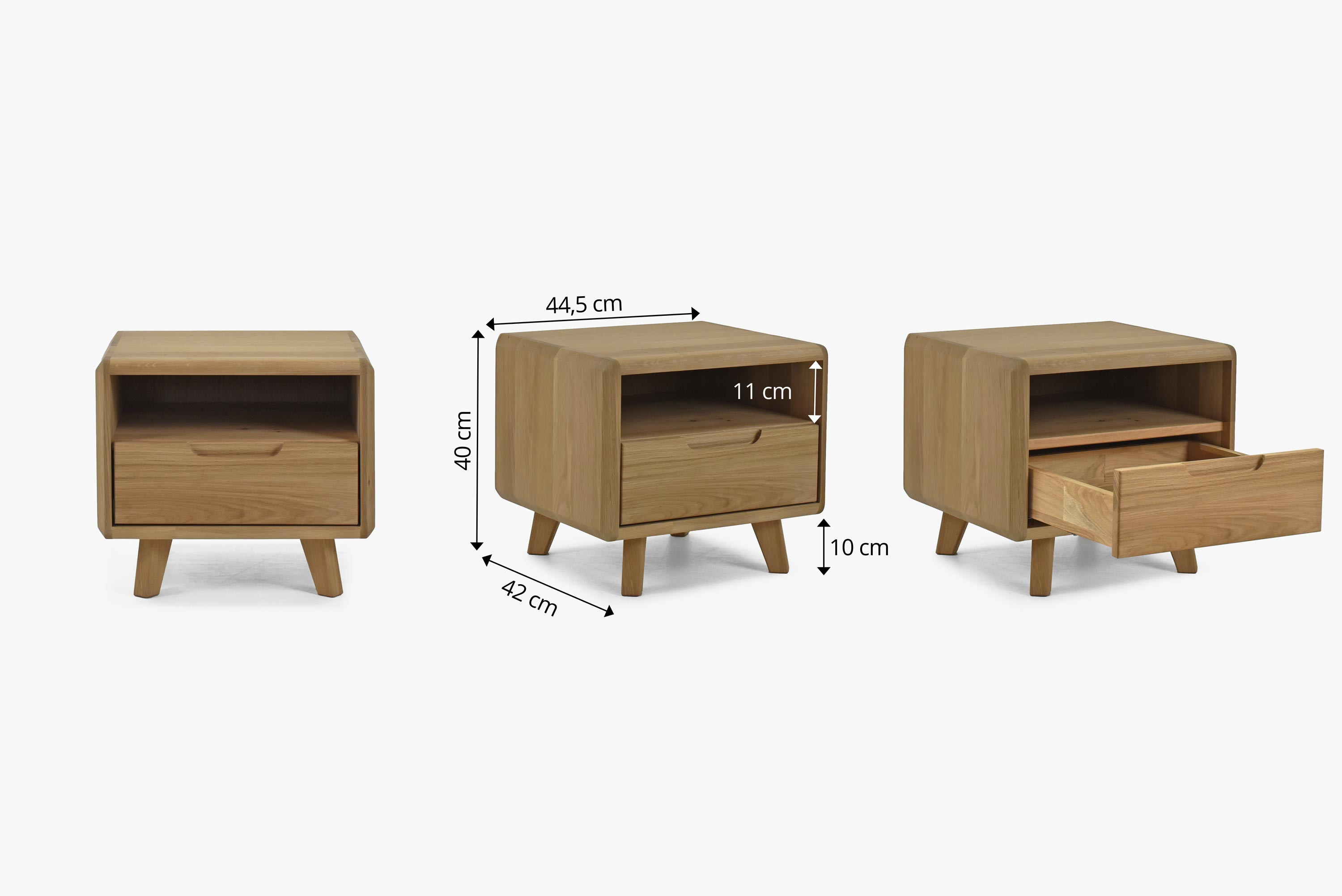 Az éjjeliszekrényt a praktikusságra és a használó kényelmére tervezték. Előre összeszerelve szállítjuk, kivéve a lábakat, amelyeket a vásárló saját maga szerel fel, így egyszerű és gyors az összeszerelés. Felszerelve egy fiókkal, soft-close mechanikával a csendesebb és simább záródásért és egy nyitott rekesszel, elegendő helyet kínál az éjszakai szükségleteinek, könyveinek vagy dekorációinak.