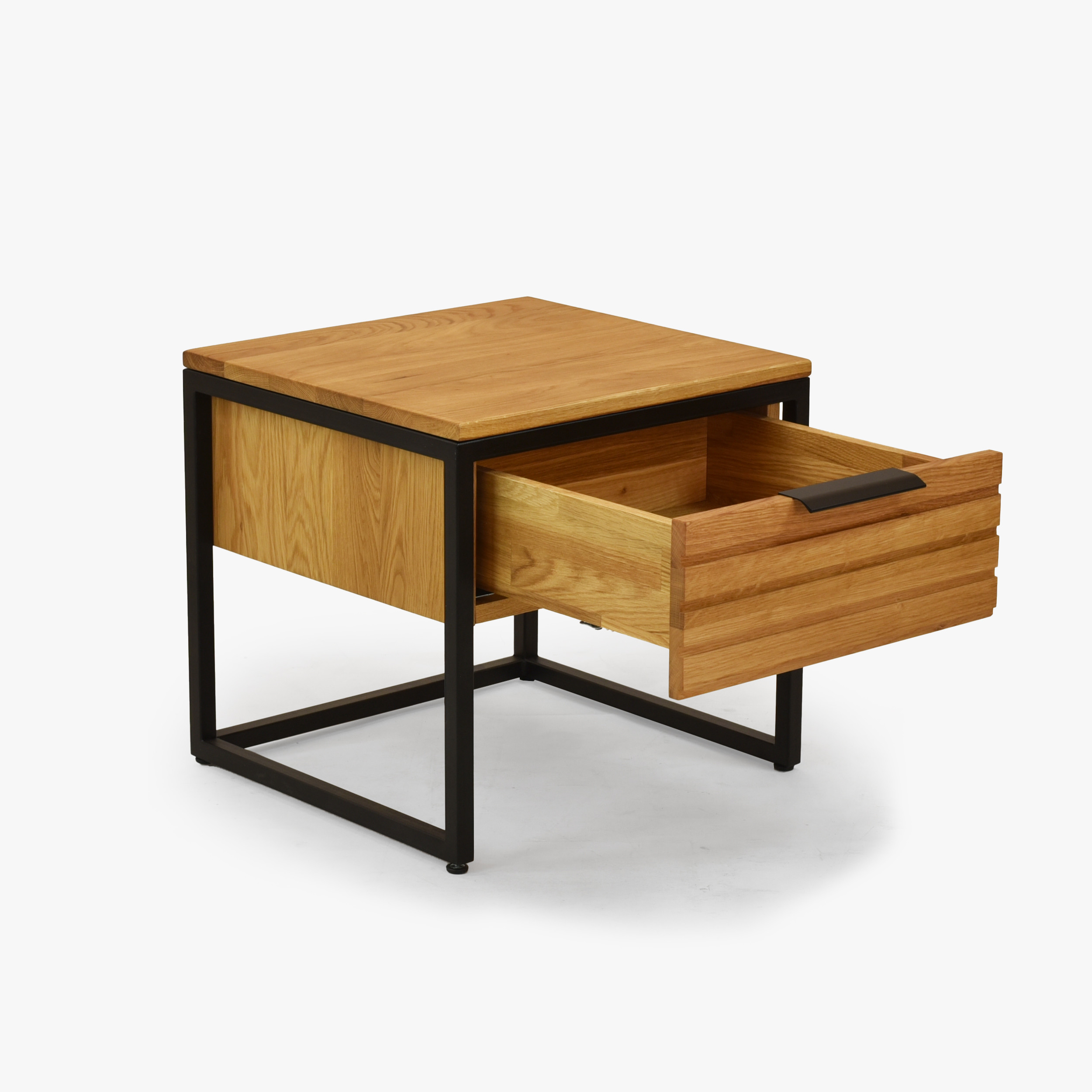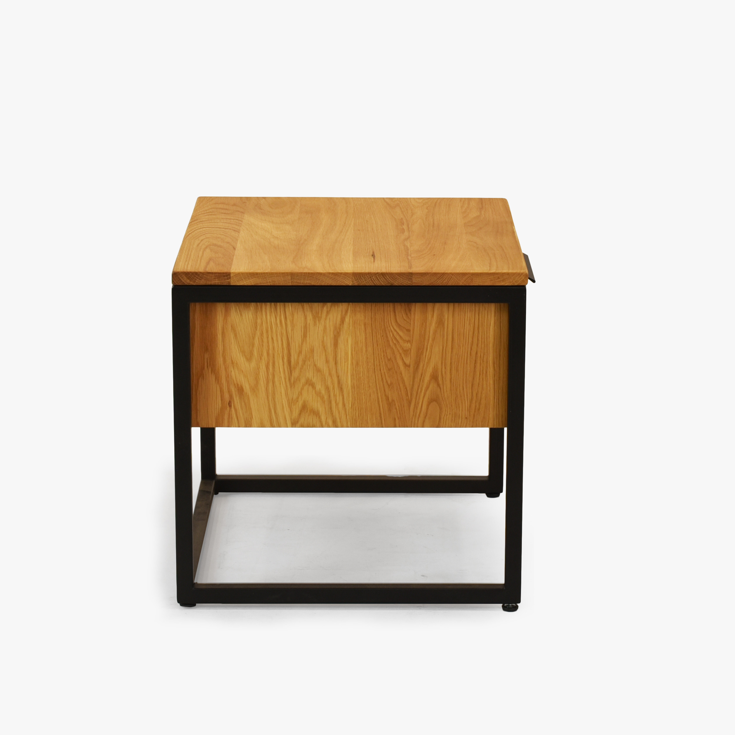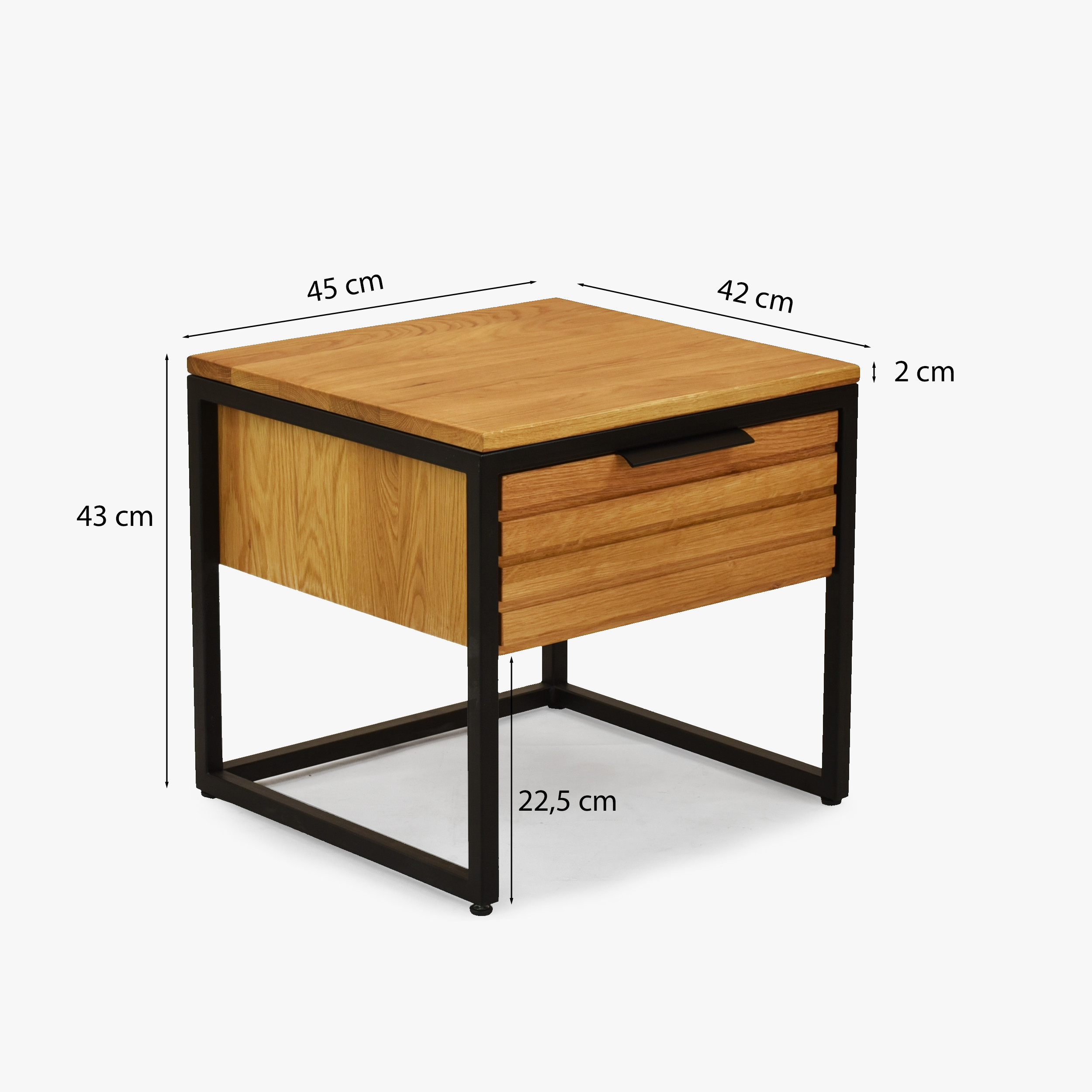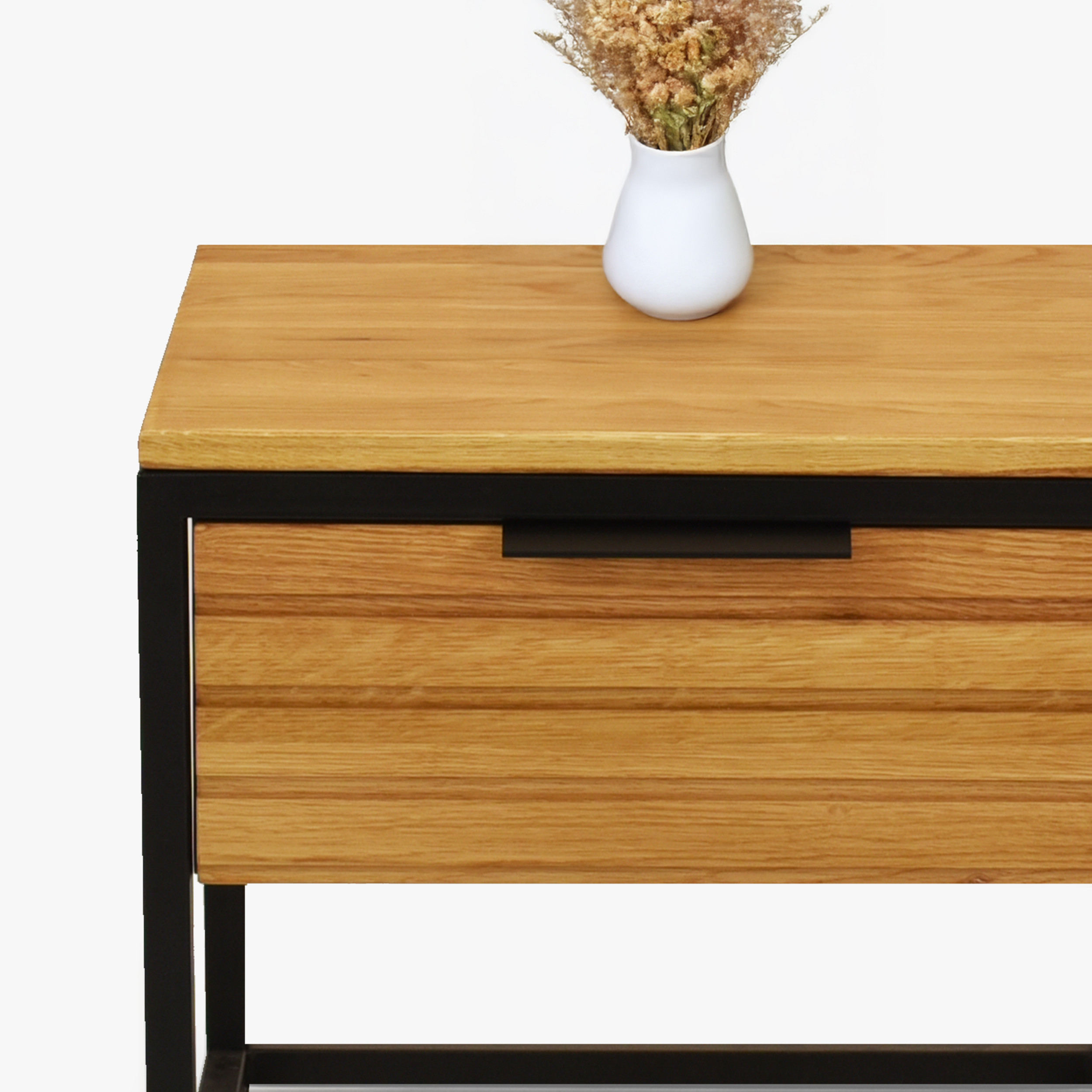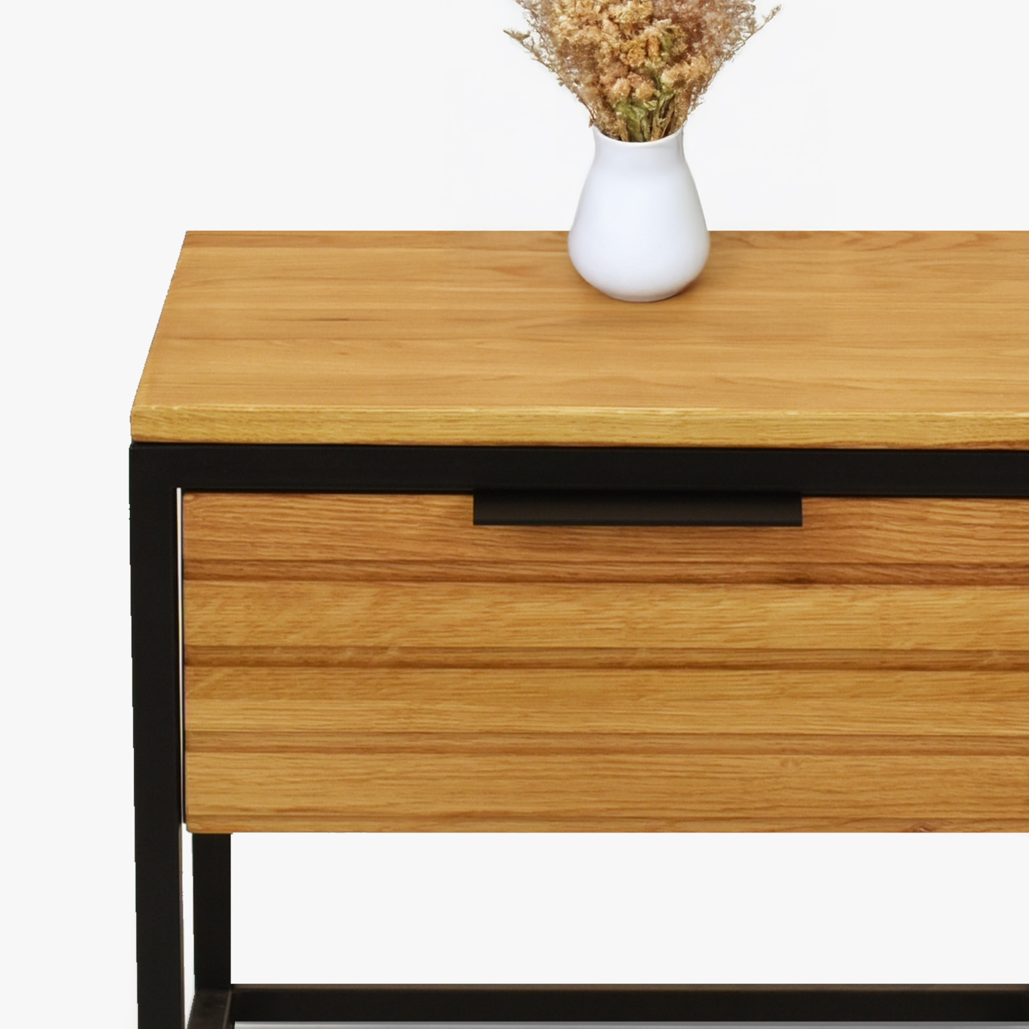 Tölgyfa éjjeliszekrény fekete fém lábakkal, modern ipari stílus