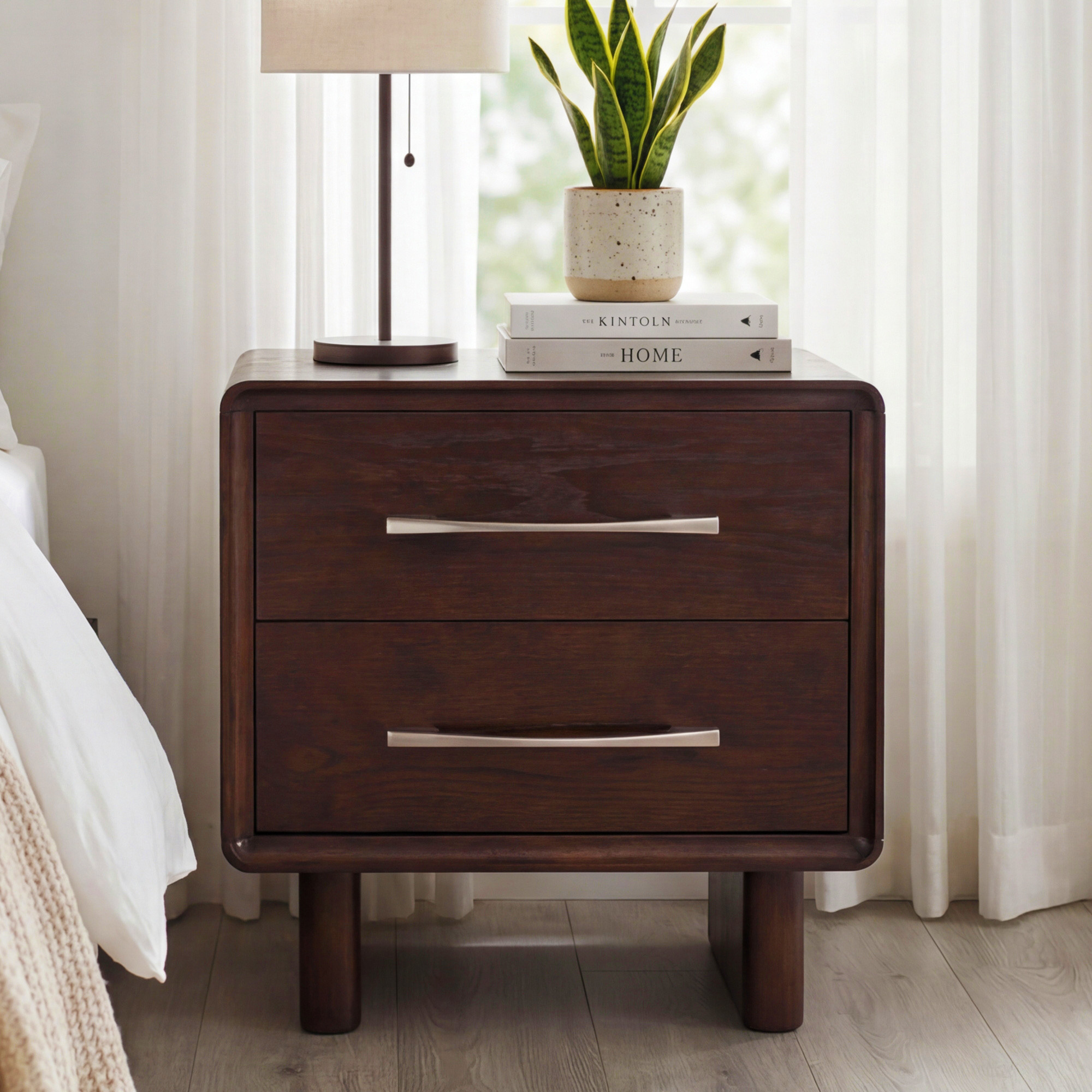Az éjjeliszekrény két tágas fiókkal rendelkezik, amelyeket soft-close rendszerrel szereltek fel a halk és sima záródásért – tökéletes megoldás, ha nem szeretné zavarni partnerét az éjszakai keresgéléskor. Az elegáns nikkel színű fém fogantyúk kiemelik a bútor exkluzív dizájnját. A felületet matt lakk védi, amely hatékonyan óvja a fát és gyönyörűen kiemeli természetes szerkezetét. Kompakt méreteinek (55 × 38 × 53 cm) köszönhetően mindenféle ágyhoz illik, és kisebb hálószobákban is könnyen elhelyezhető.