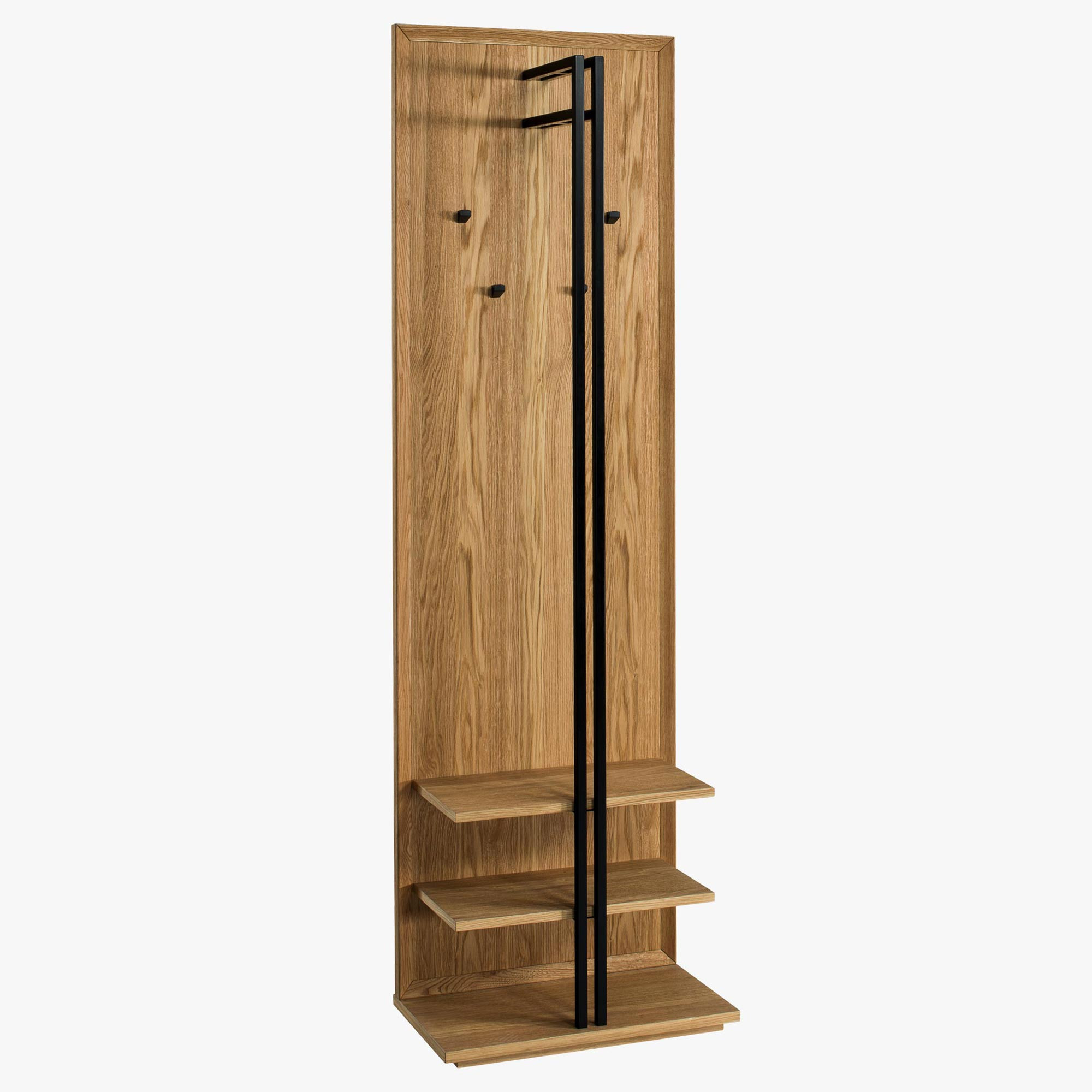 Tölgyfa előszobafogasfal fém elemekkel, cipőtárolós, 60x210 cm