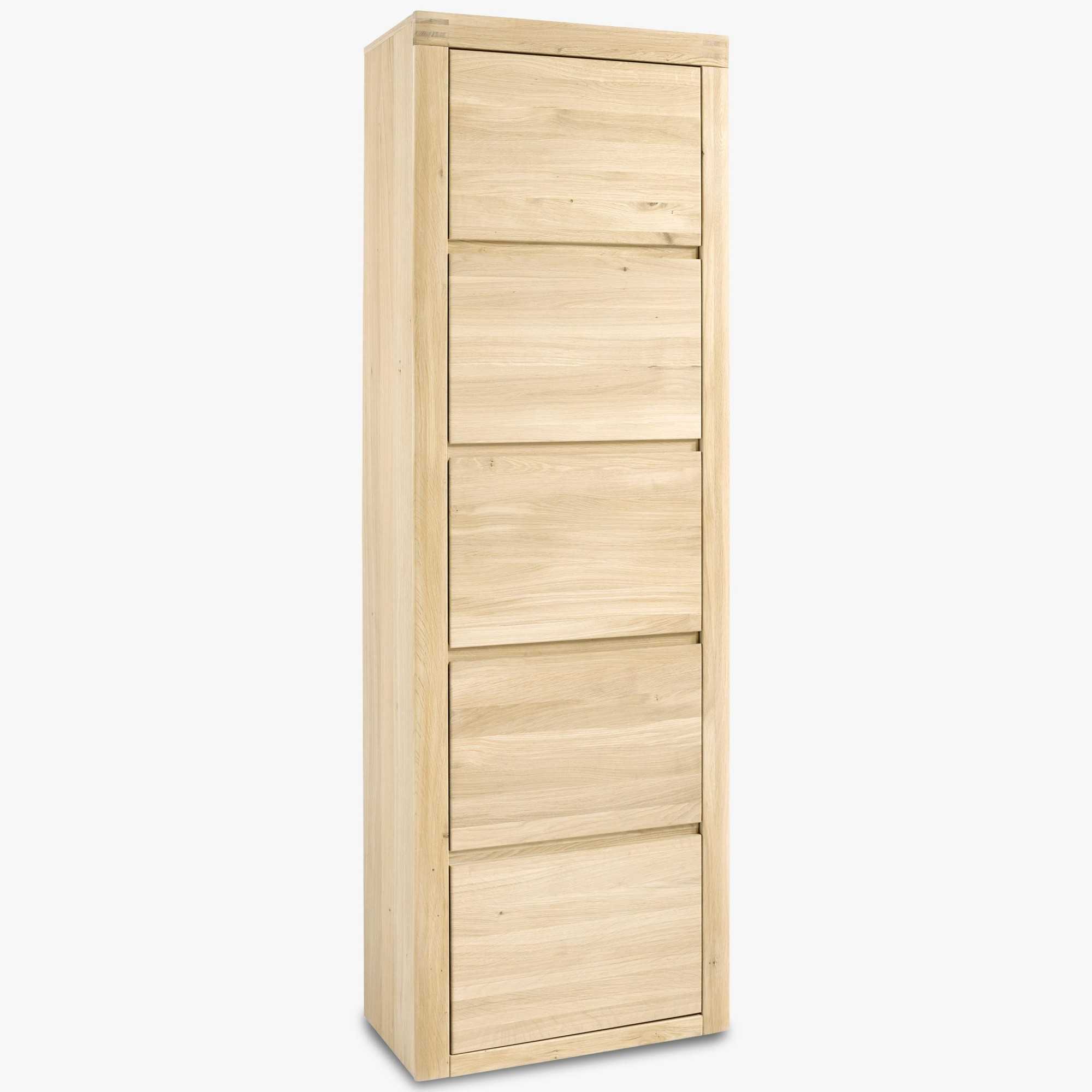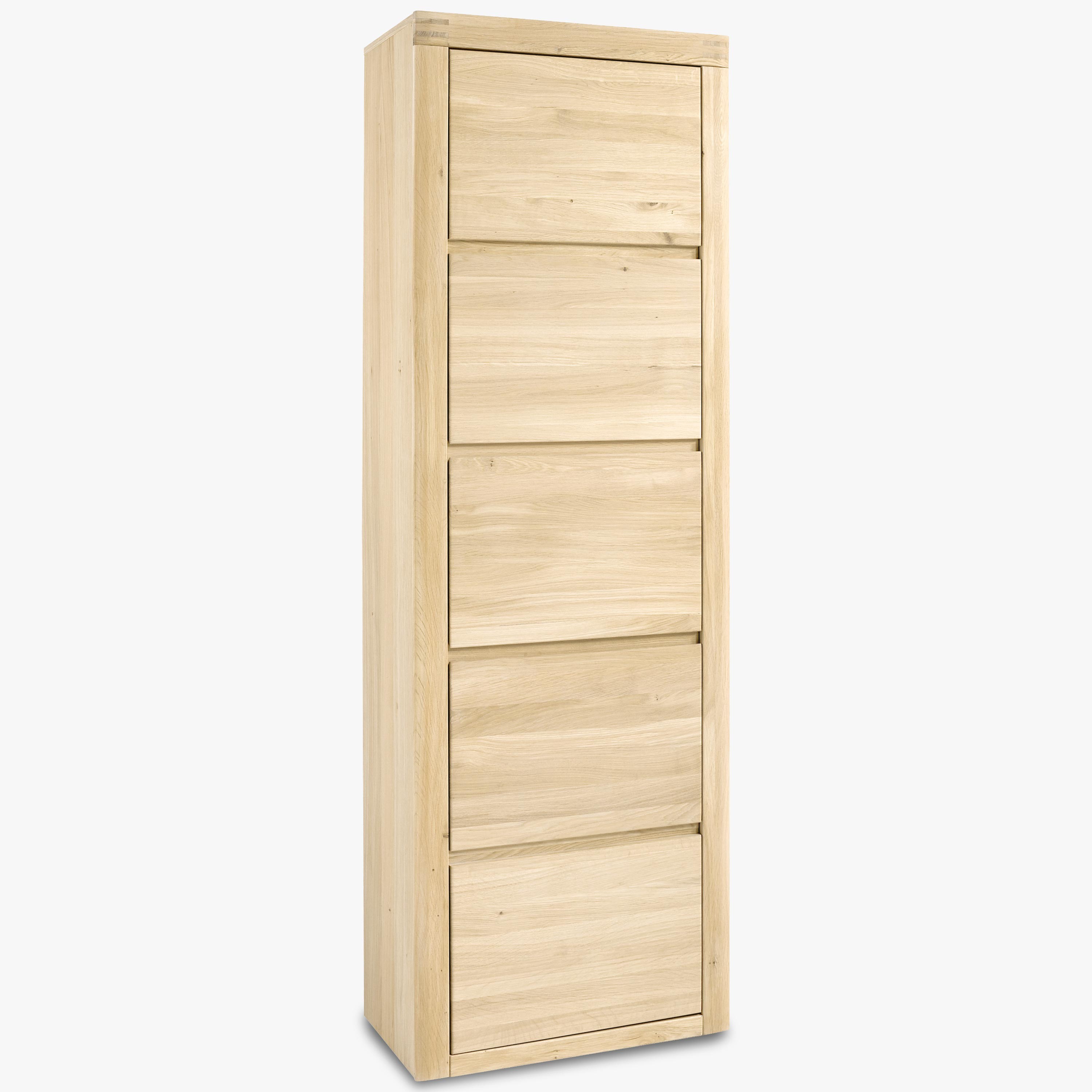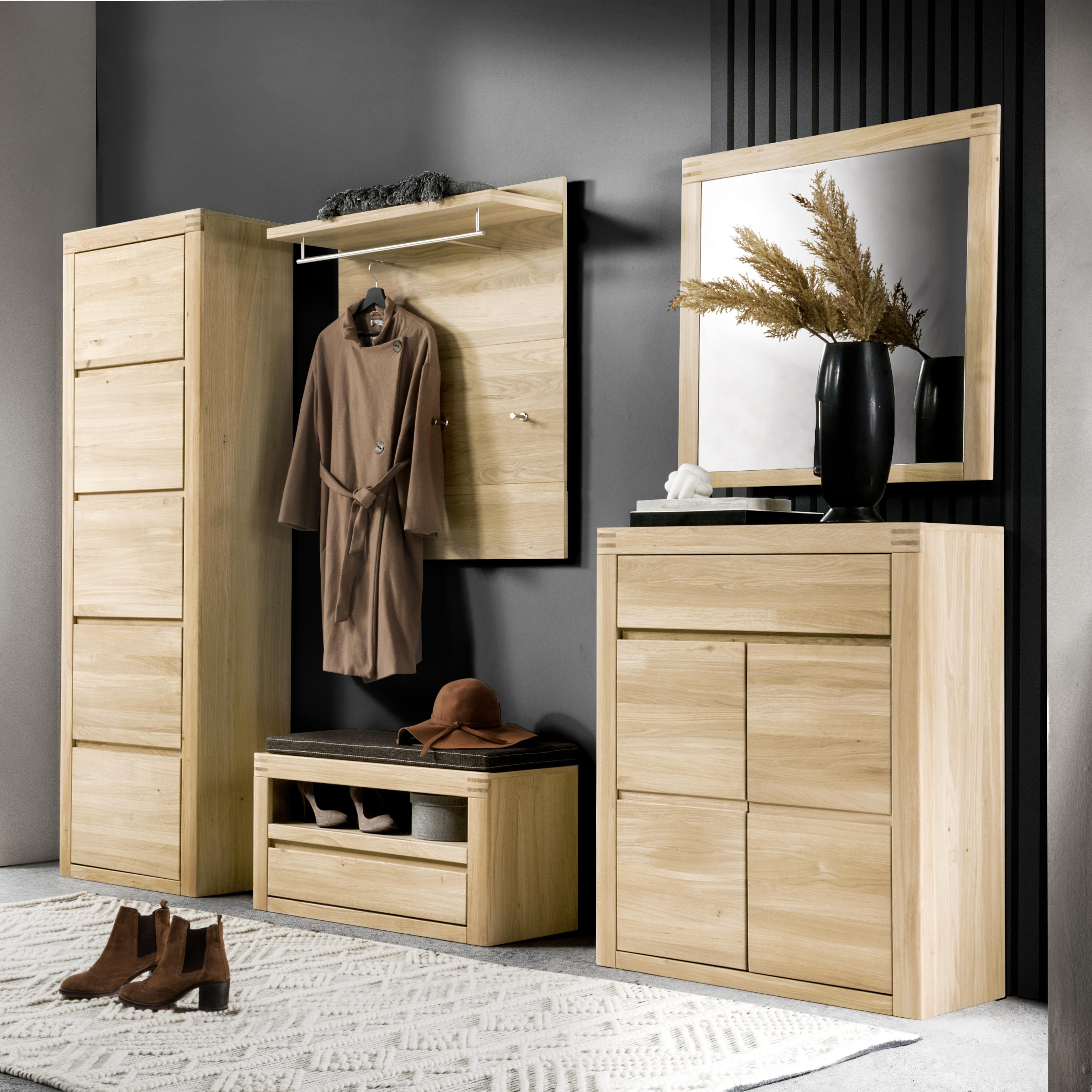A tágas, magas előszobaszekrény a bejárati térben biztosan sokféle felhasználást kínál. A magas szekrény nyíló ajtókkal rendelkezik, a zsanérok a bal vagy jobb oldalon helyezkednek el. Kinyitás után a belső részben 2 polcot talál a felső és az alsó részben. Továbbá fogassal a kabátok felakasztásához. A szekrény részben tömör tölgyből készült. A meghatározó rész a magas elülső ajtók, melyek valódi tölgyfából készültek. A belső váz és a polcok természetes tölgyfurnérból készülnek, fóliával kombinálva. Minden részt viasszal és olajjal kezeltek.