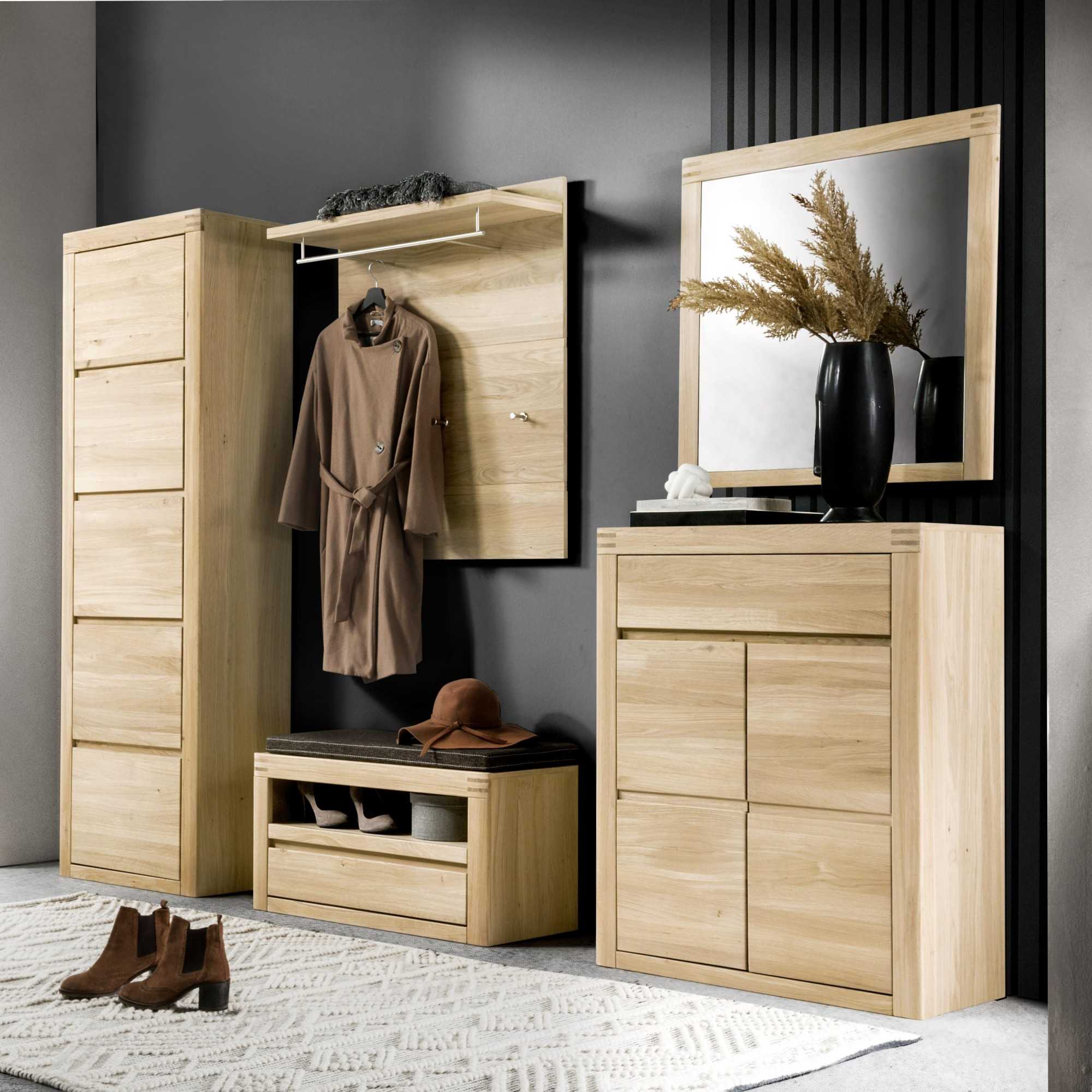 Előszobai bútorszett előszobába készült z tölgyfából, természetes tölgyfurnér kombinációjában. A világos tölgyfa dizájn biztosan megragadja a tekintetet első pillantásra. A fa természetes erezete és a natúr fa az otthonába lépve azonnal egyedülálló hangulatot teremt. A szett 5 elemet tartalmaz, a bútor minden olyan eleme, amely összeszerelhető, már össze van szerelve.