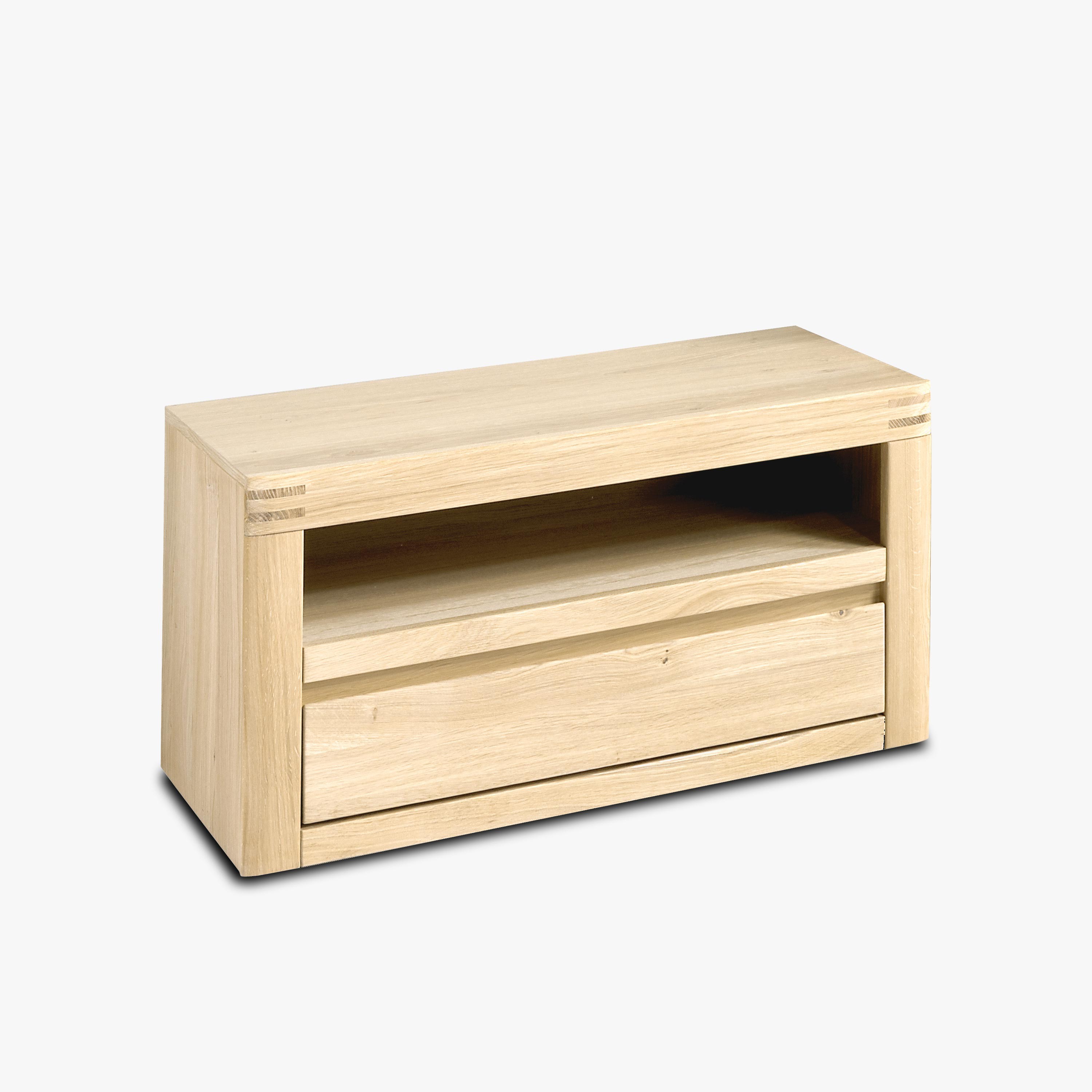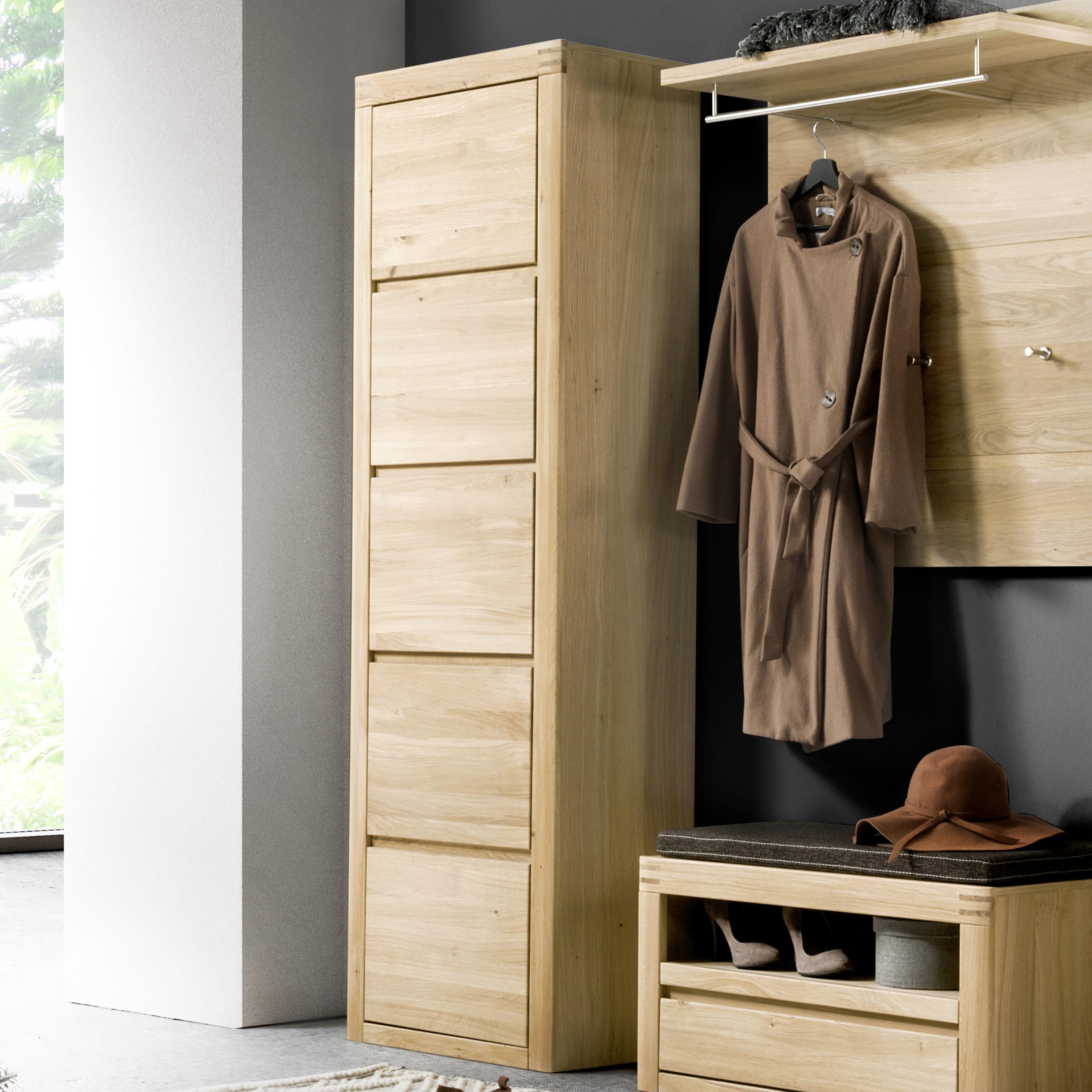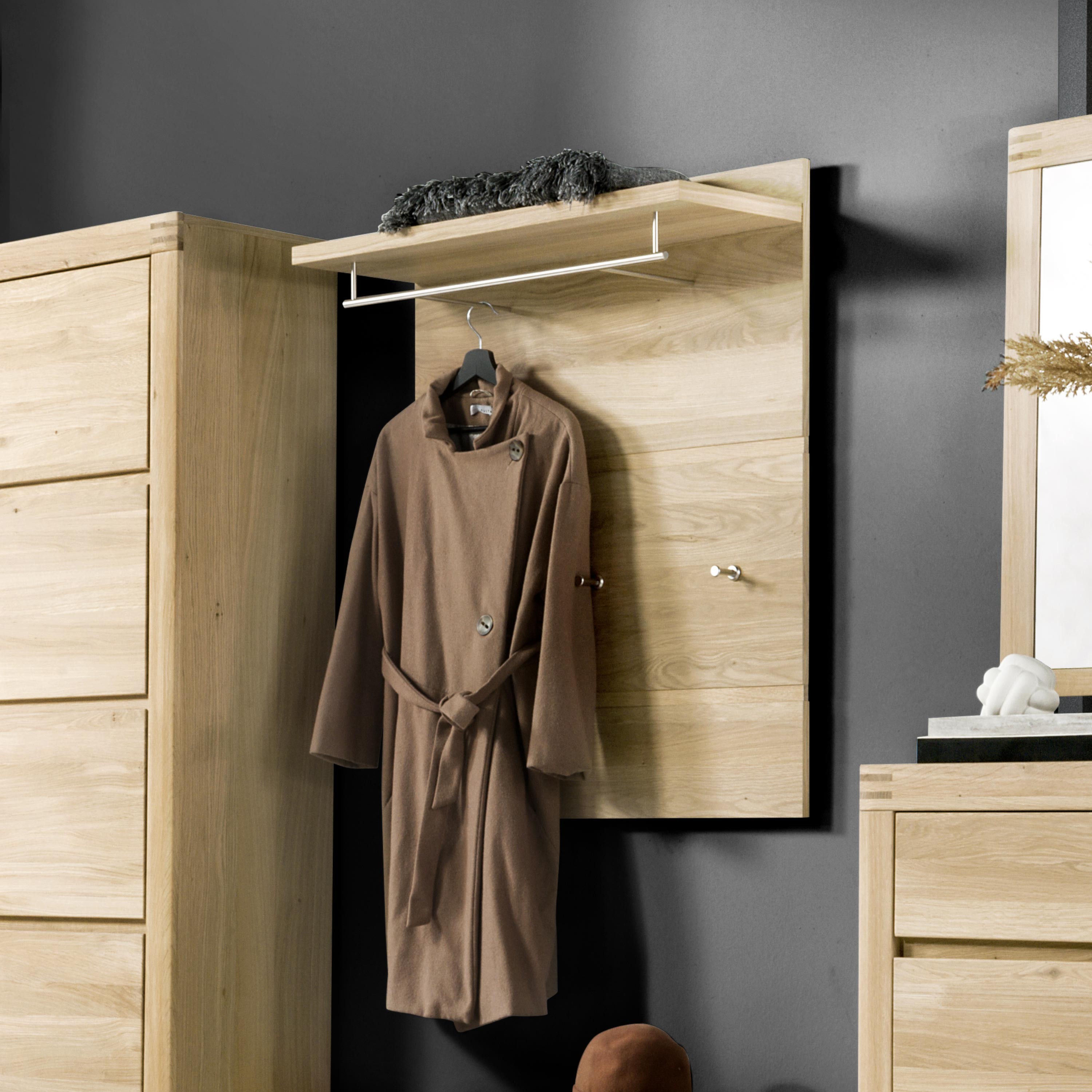 Impozáns előszobabútor világos, kellemes színekben. A bútor részben tömör tölgyfából készült, fehér tölgy színben. A bútor eleje tölgyfa. Az oldalak és a felső lap természetes tölgyfurnérból készülnek. Belső korpusz: természetes tölgyfurnér kombinálva fóliával. A fiókok és ajtók soft-close záródással rendelkeznek. A precíz kidolgozás és a magas színvonal természetes. A bútor német piacra készült.