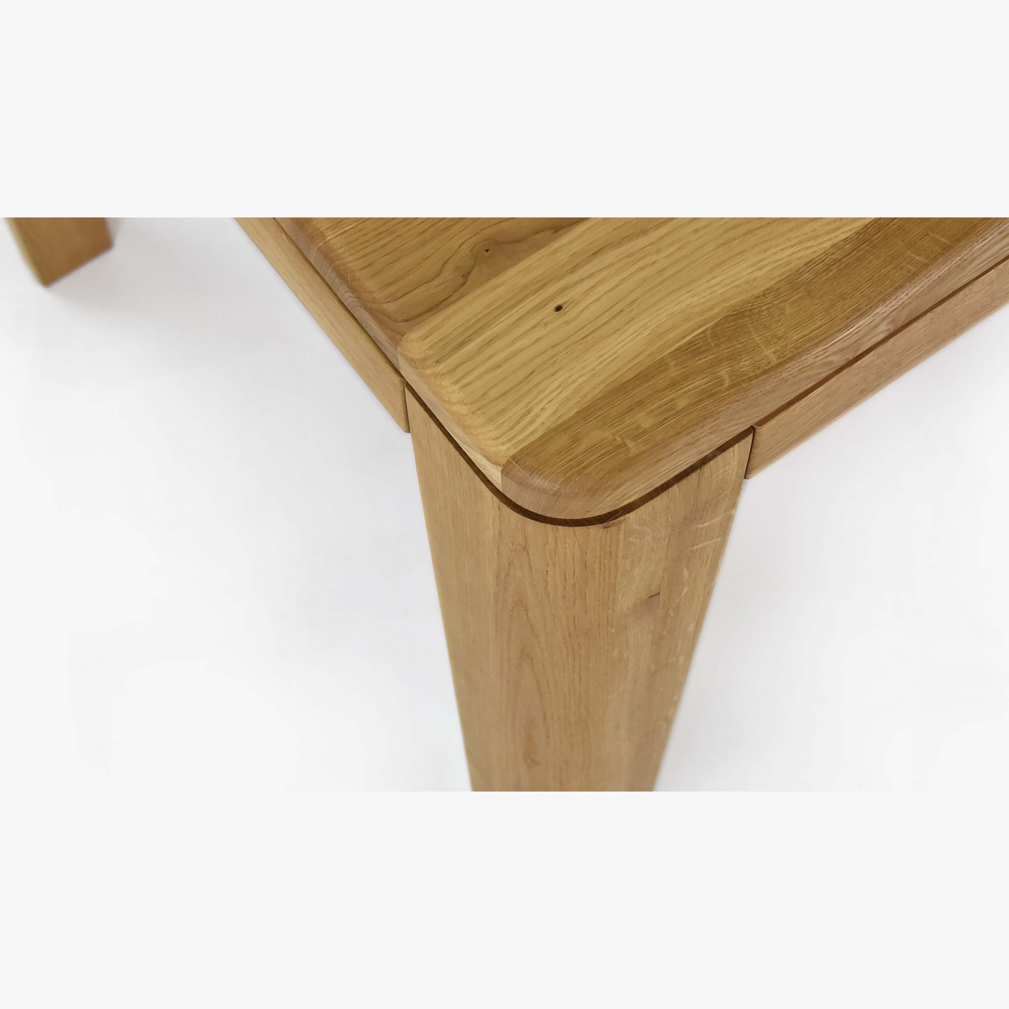 Dizájn étkezőasztal, 100% tömör tölgyből, praktikus felhasználásra. Engedje meg magának ezt a dizájnos, luxus darabot. Nagy előny a lekerekített élek és sarkok, így elkerülhetők a felesleges sérülések. Masszív, stabil lábak akár 10 x 10 cm mérettel garantálják az asztal magas stabilitását. A teteje akár 3 cm vastag, ami tölgyfánál teljesen elegendő. Az asztal előnye, hogy a lábak az asztallap végén vannak elhelyezve, így hatalmas hely marad a székei vagy foteljei számára. Az asztal magassága 76 cm, az asztal alsó éléig mért magasság akár 67 cm.
