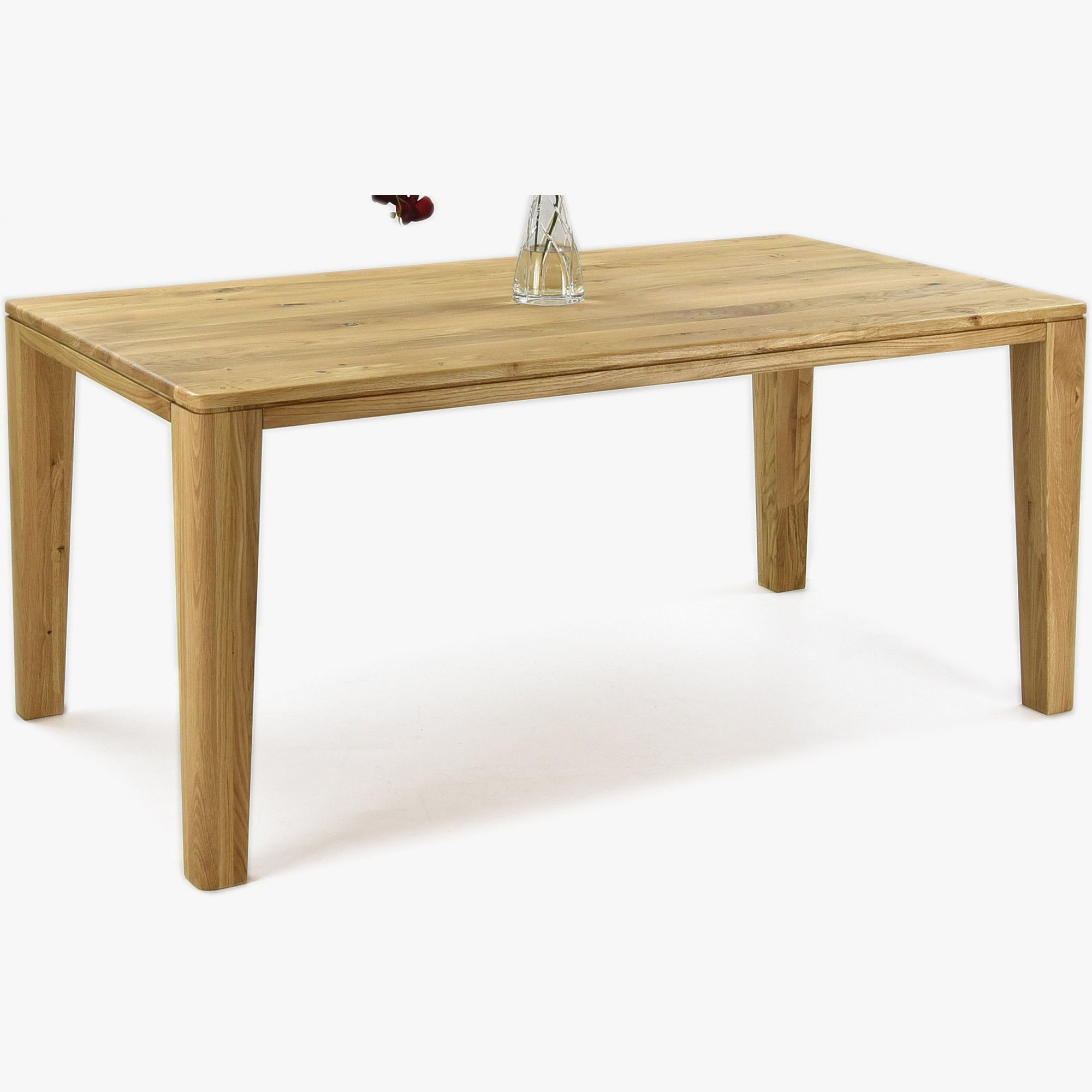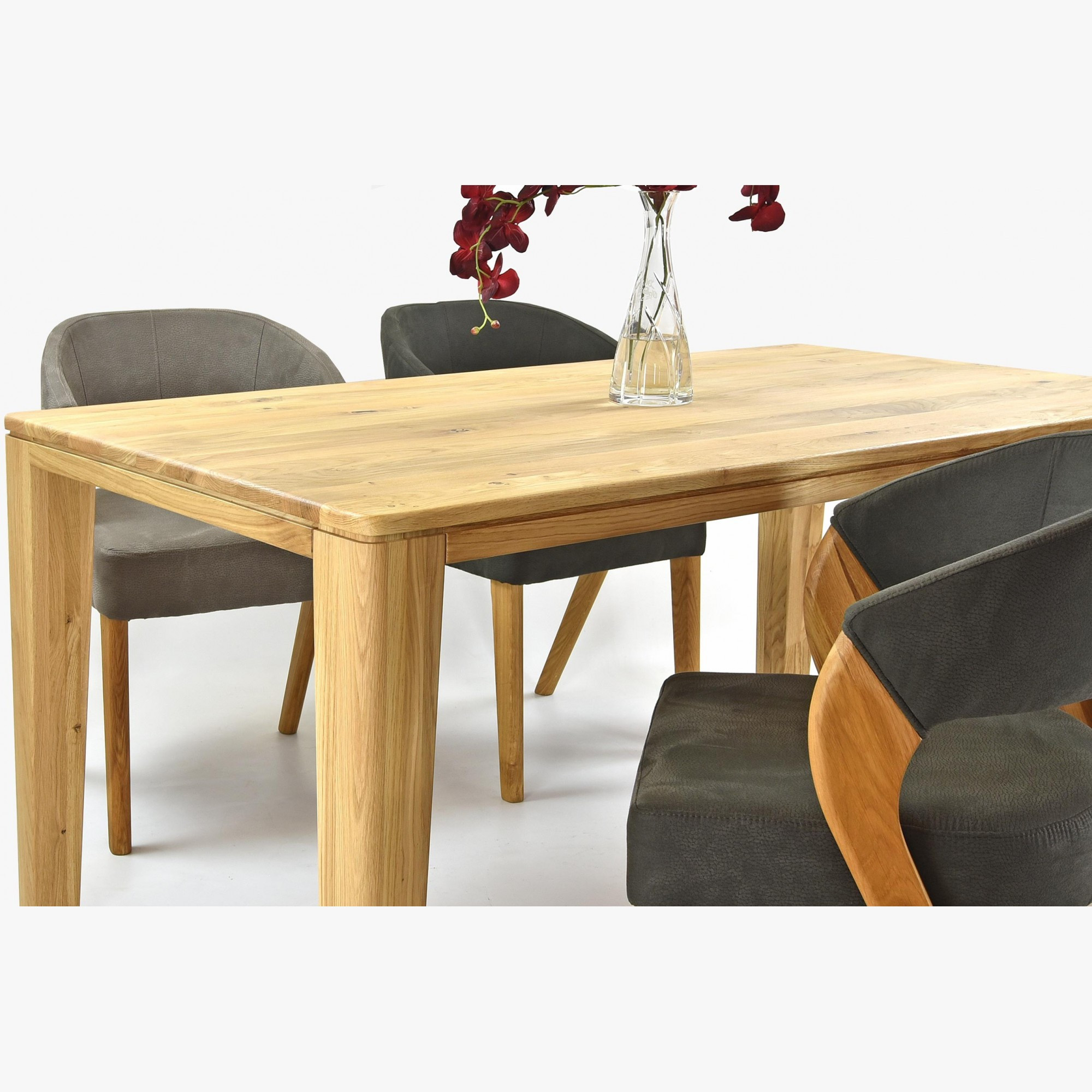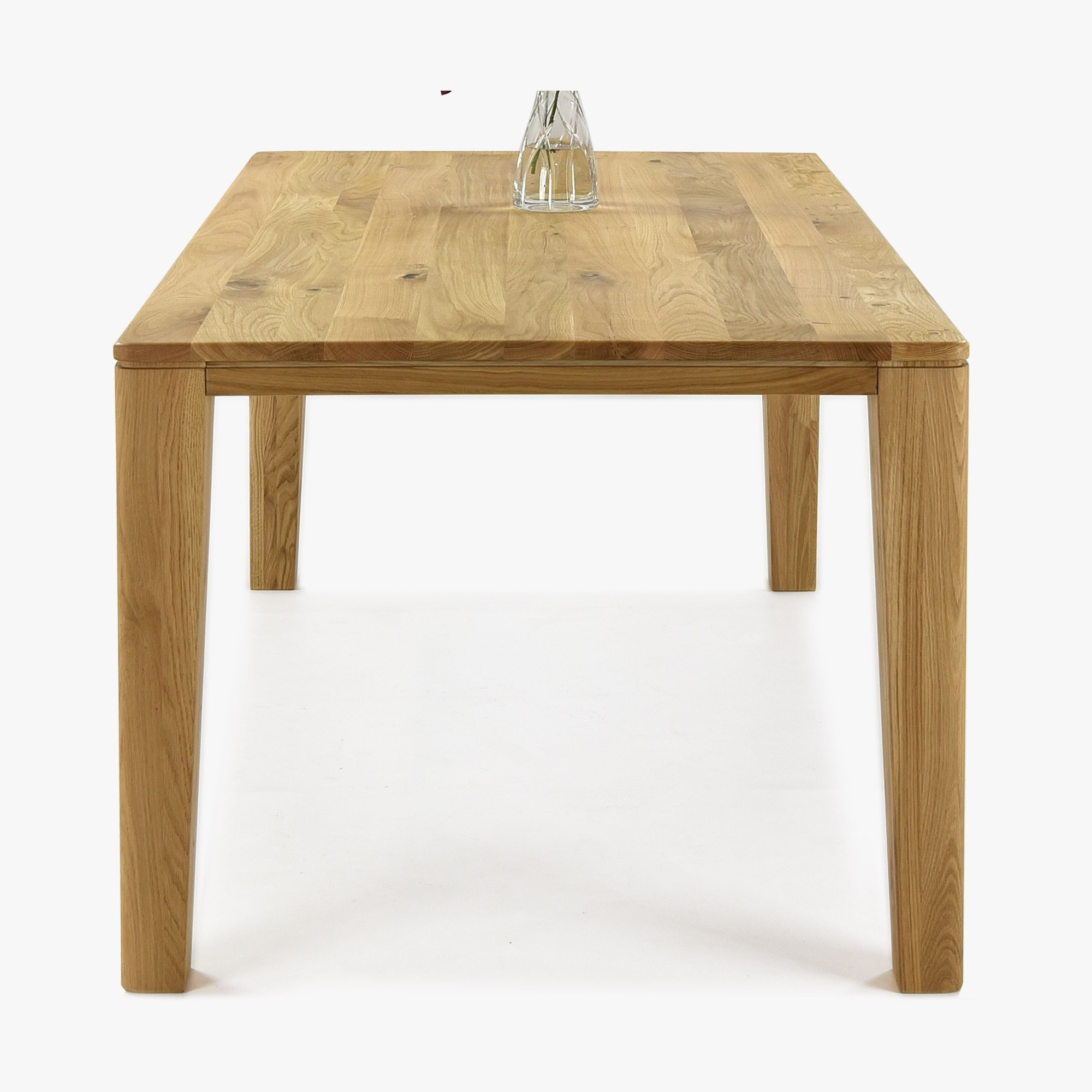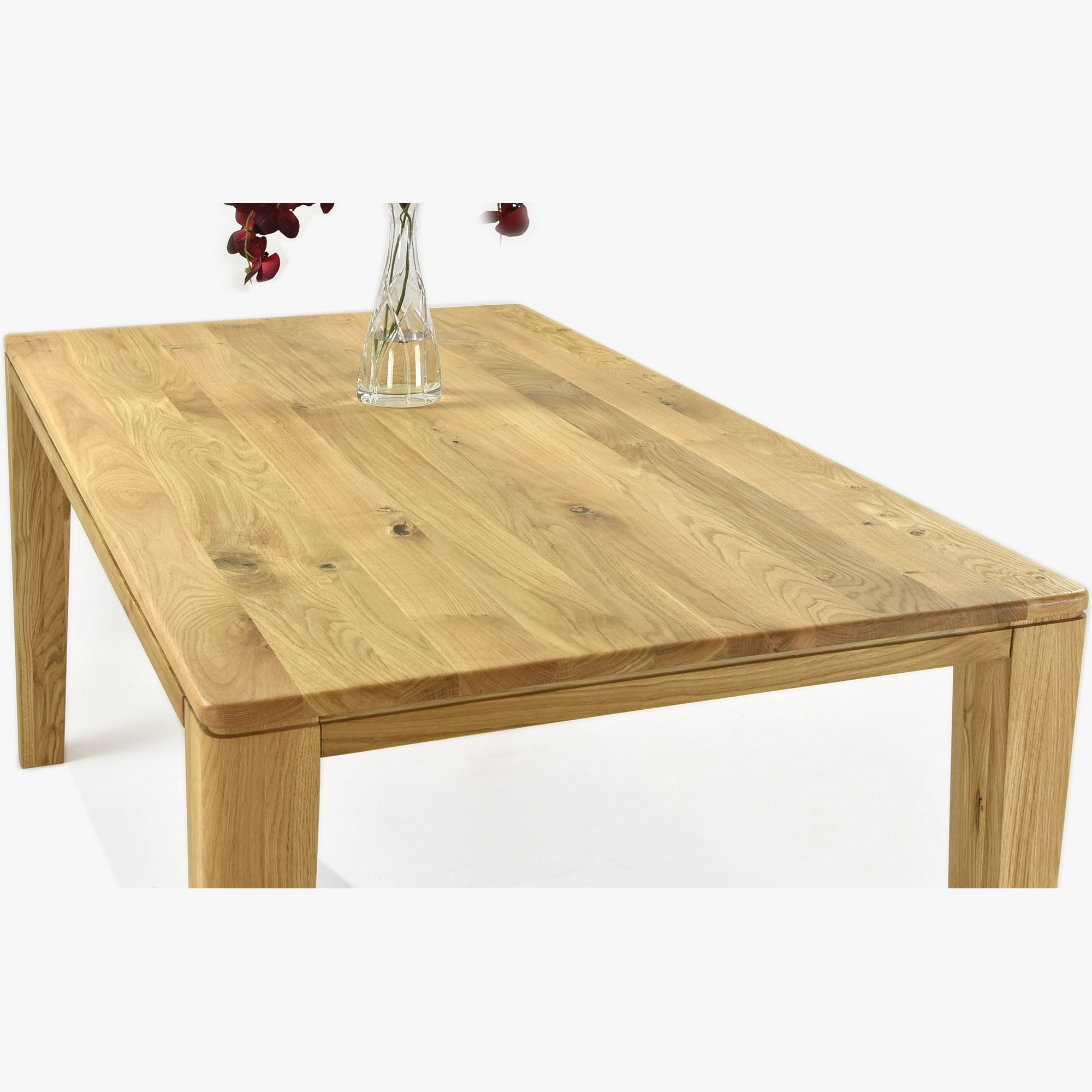 Design étkezőasztal, amely 100% tölgy tömörfából készült a praktikus használatra. Engedje meg magának ezt a designos, luxus étkezőasztal darabot. Nagy előnyt jelentenek a lekerekített élek és sarkok. Így elkerülheti a felesleges sérüléseket. Masszív, stabil lábak, mérete akár 10 x 10 cm garantálják az asztal magas stabilitását. A felső lap vastagsága akár 2 cm, ami tölgyfánál teljesen elegendő. Az asztal előnye, hogy a lábak az asztal végein helyezkednek el, így hatalmas helyet nyer a székei vagy foteleinek. Az asztal magassága 76 cm, az alsó él magassága akár 69 cm.