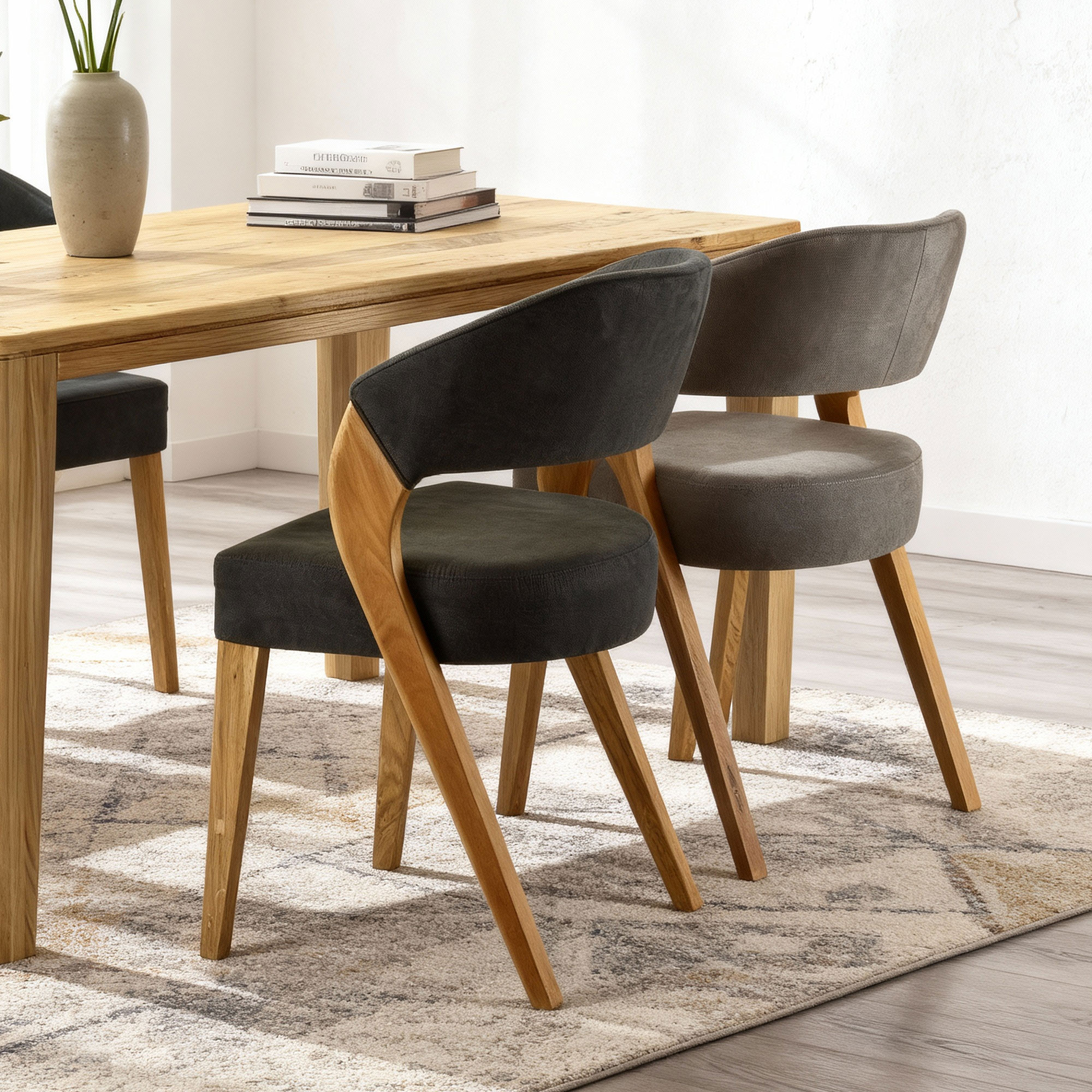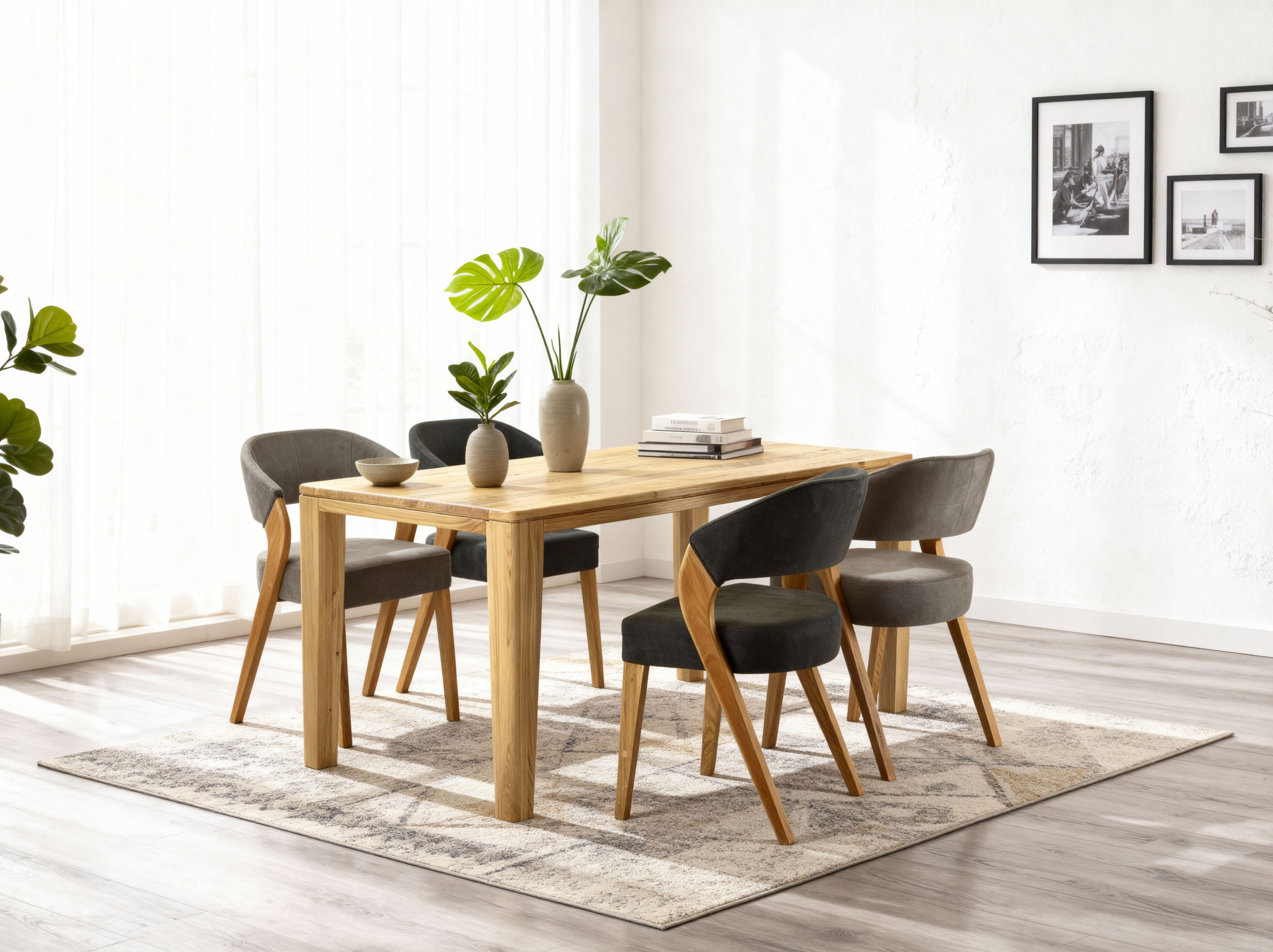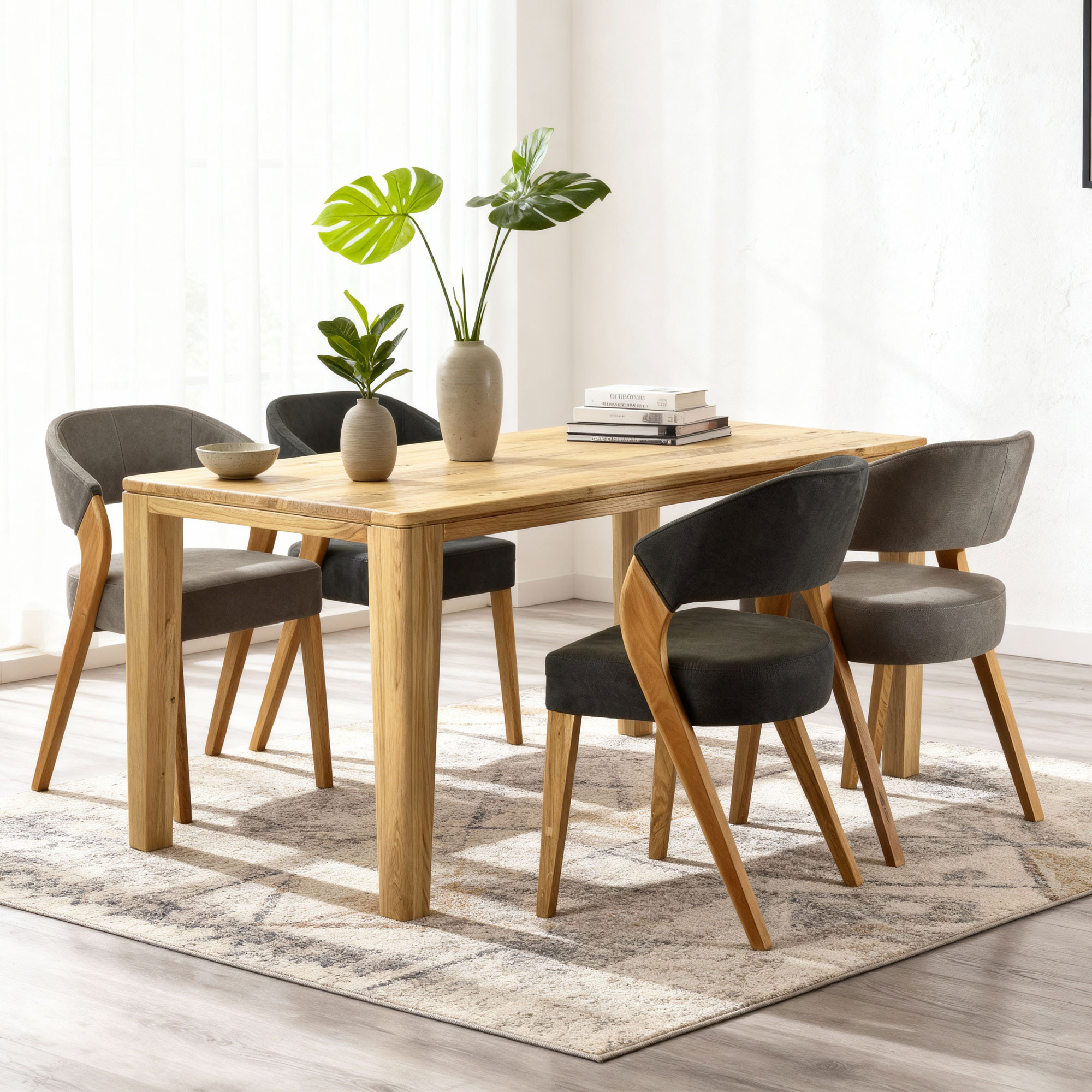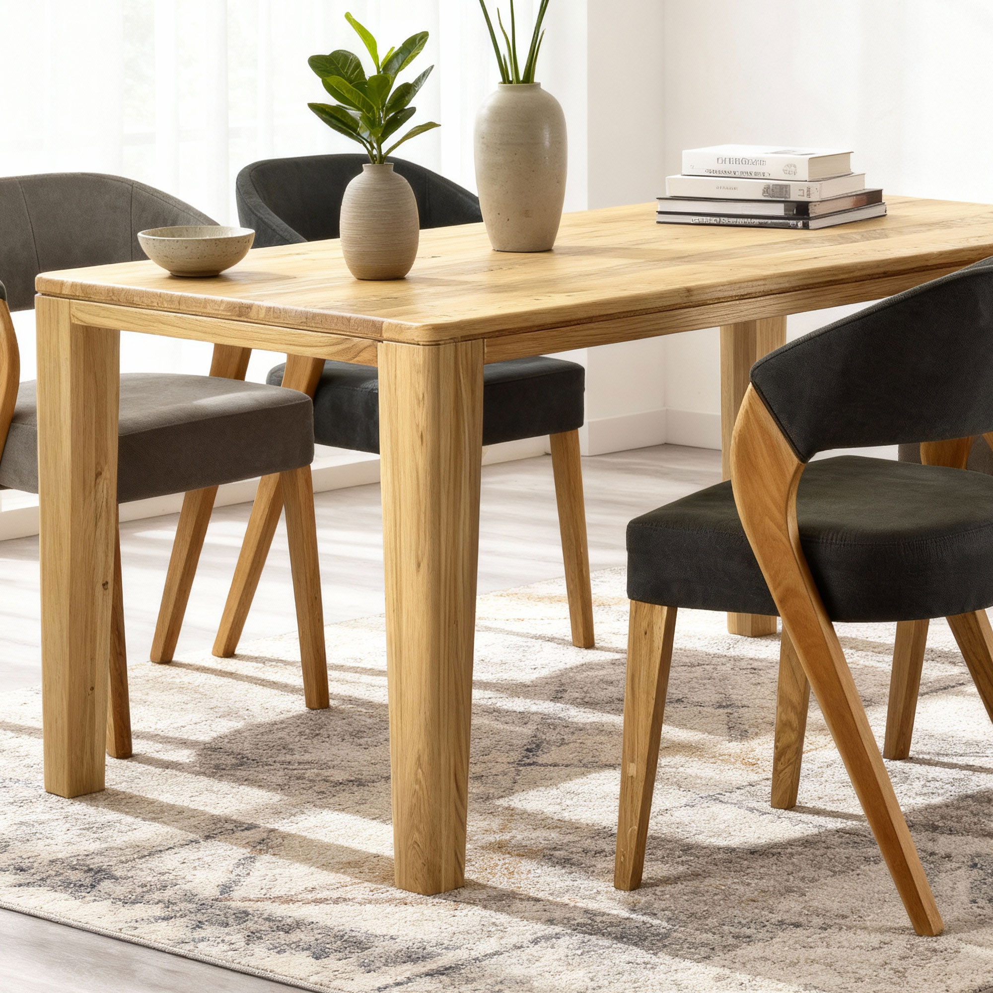 Design étkezőasztal, amely 100% tölgy tömörfából készült a praktikus használatra. Engedje meg magának ezt a designos, luxus étkezőasztal darabot. Nagy előnyt jelentenek a lekerekített élek és sarkok. Így elkerülheti a felesleges sérüléseket. Masszív, stabil lábak, mérete akár 10 x 10 cm garantálják az asztal magas stabilitását. A felső lap vastagsága akár 2 cm, ami tölgyfánál teljesen elegendő. Az asztal előnye, hogy a lábak az asztal végein helyezkednek el, így hatalmas helyet nyer a székei vagy foteleinek. Az asztal magassága 76 cm, az alsó él magassága akár 69 cm.
