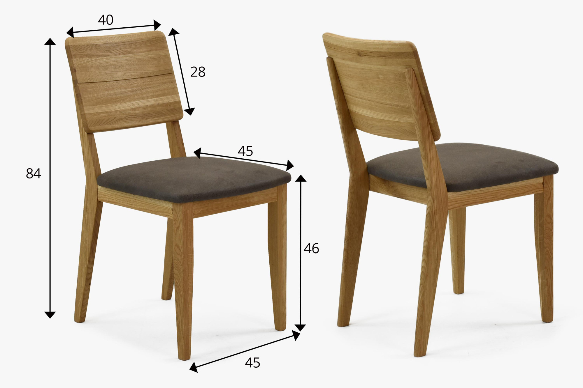A Robi modellű tölgyfa székek kárpitozott ülőkével, barnásszürke színben, amely a csiszolt bőr hatását idézi, maximális kényelmet és tartósságot biztosítanak. A masszív tölgy szerkezet és a minőségi bevonat kombinációja garantálja a hosszú élettartamot és az egyszerű karbantartást – elegendő a gyerek szappan és a pH 0-ás víz. Minden szék akár 120 kg-ot is elbír, és súlya hozzávetőlegesen 8 kg.