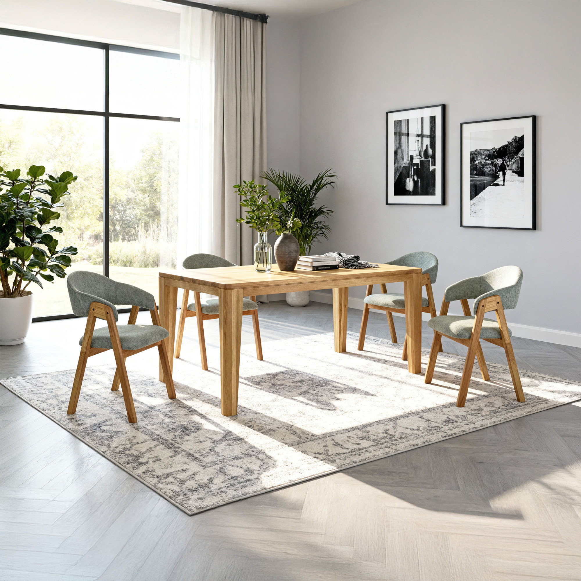 Tölgyfa tömörfa étkezőasztal és 4 kárpitozott York & Arco szék – tömör tölgy elegancia és kényelem