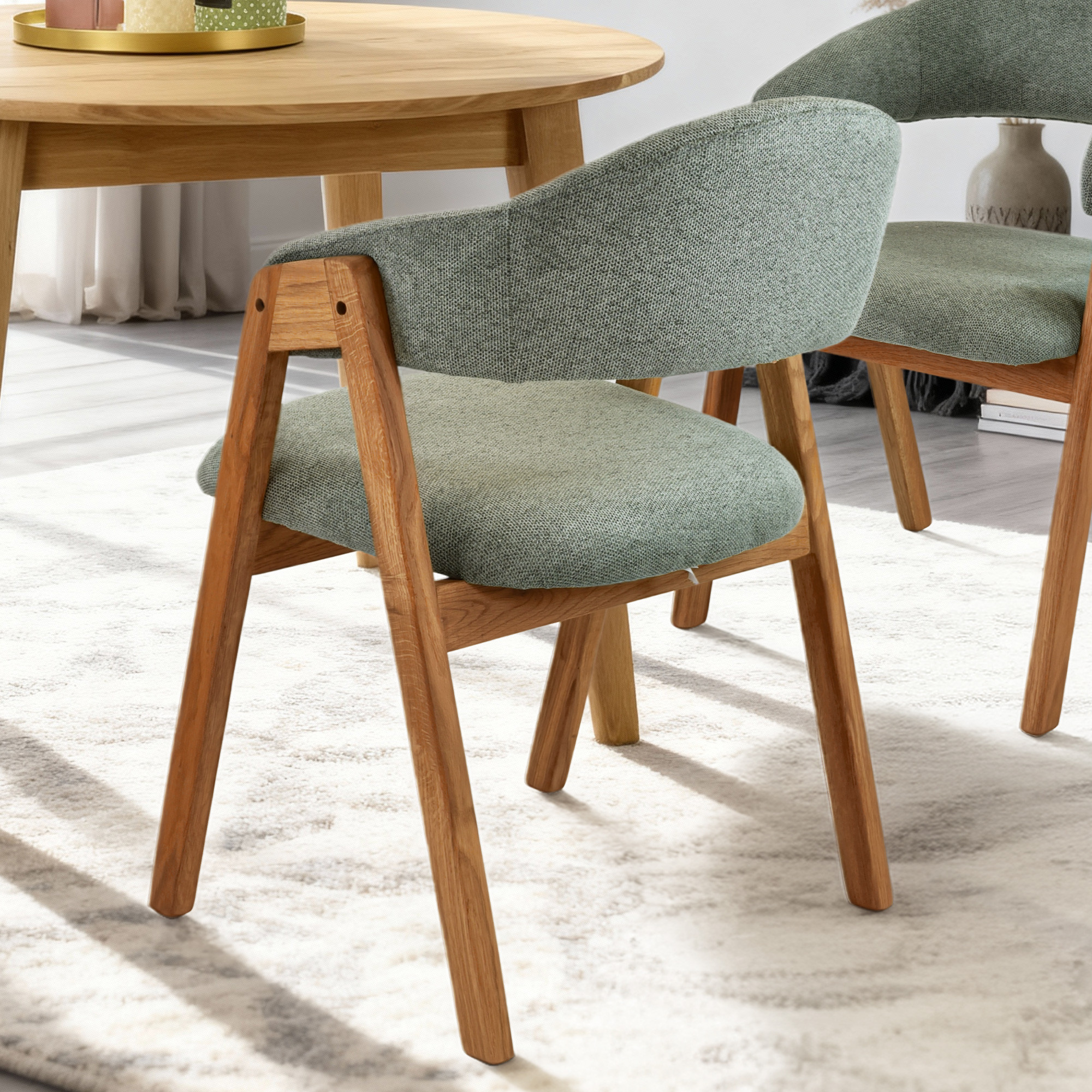 A garnitúra része az Arco szék, amely a természetes tölgyfa és a easy clean típusú puha kárpit kombinációjával tűnik ki. Ez nemcsak vizuálisan vonzó, hanem rendkívül ellenálló is – átesett a Martindale 60 000–70 000 ciklus teszten, ami megerősíti tartósságát. Az ergonómiailag formázott ülőfelület és háttámla, a kényelmes, 48 cm-es ülésmagasság és az integrált karfák révén az Arco széken való ülés kényelmes még hosszabb étkezés esetén is. Ez a tömör tölgyből készült étkezőgarnitúra ideális választás mindazok számára, akik minőségi, természetes fa bútort keresnek kedvező áron, közvetlenül a cseh gyártótól.
