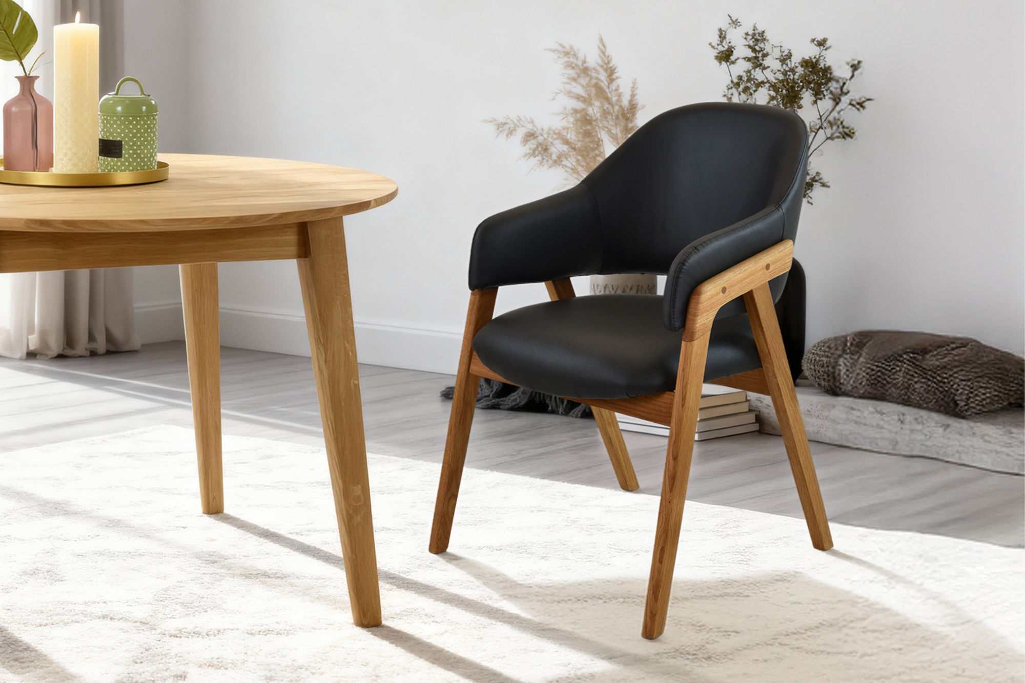 Lucas + Beny tömör tölgy étkezőgarnitúra – kihúzható asztal és 4 fekete kartámaszos szék