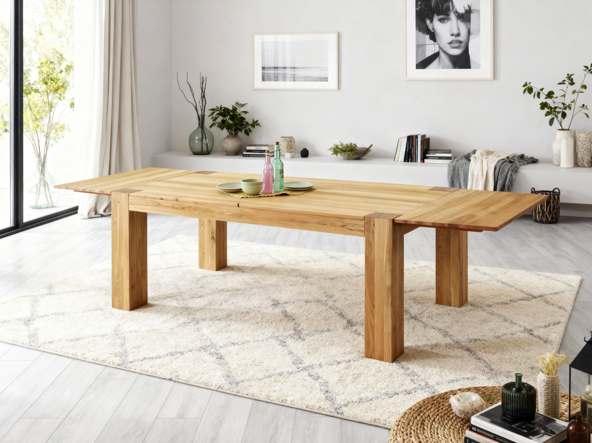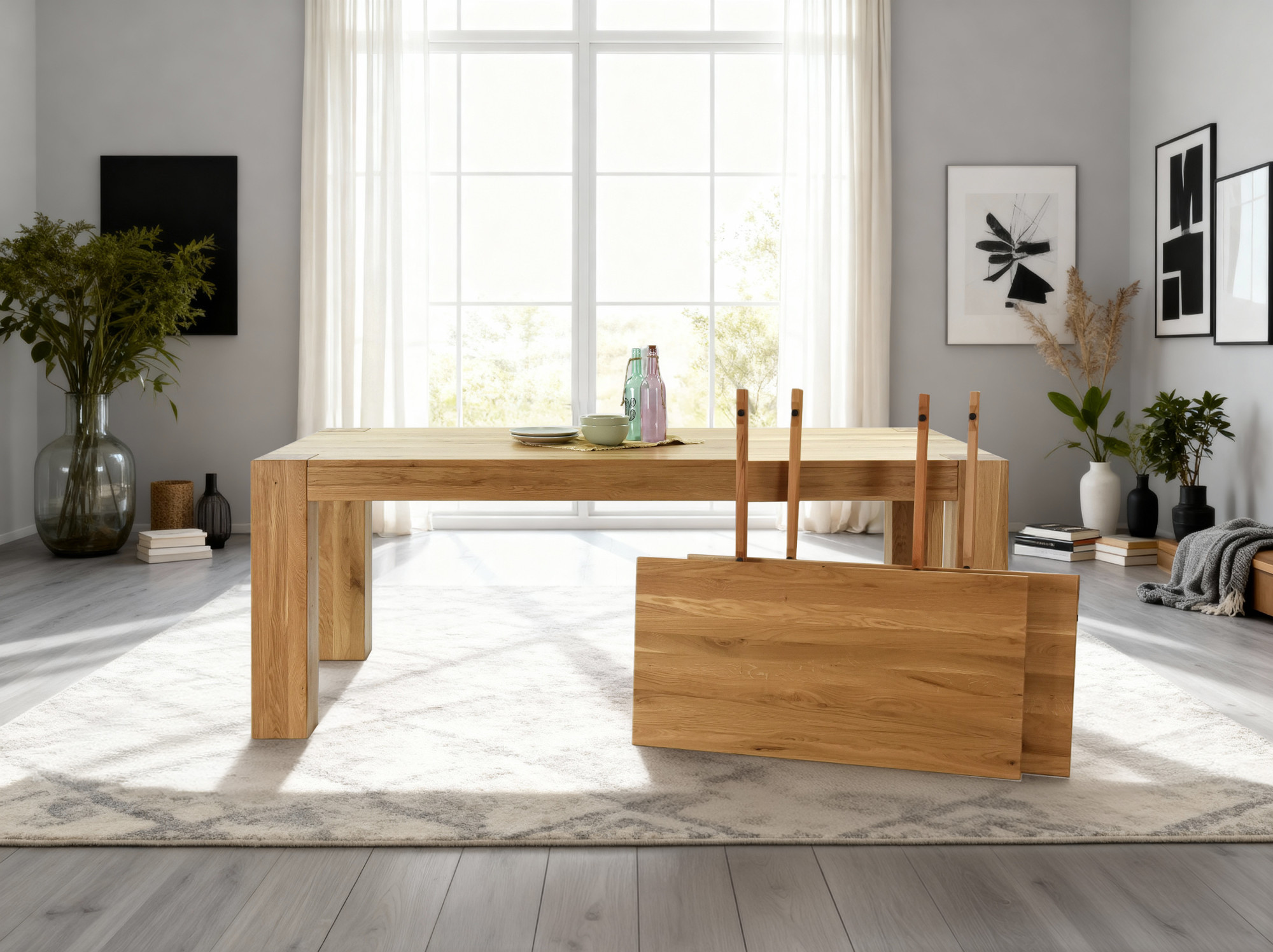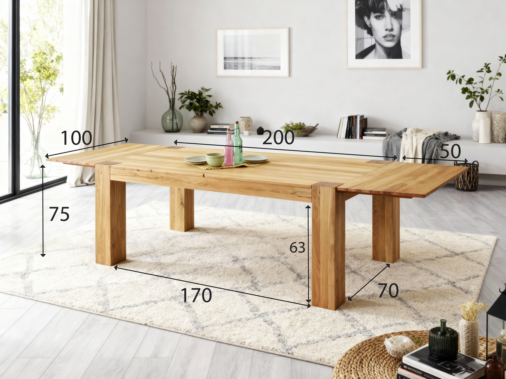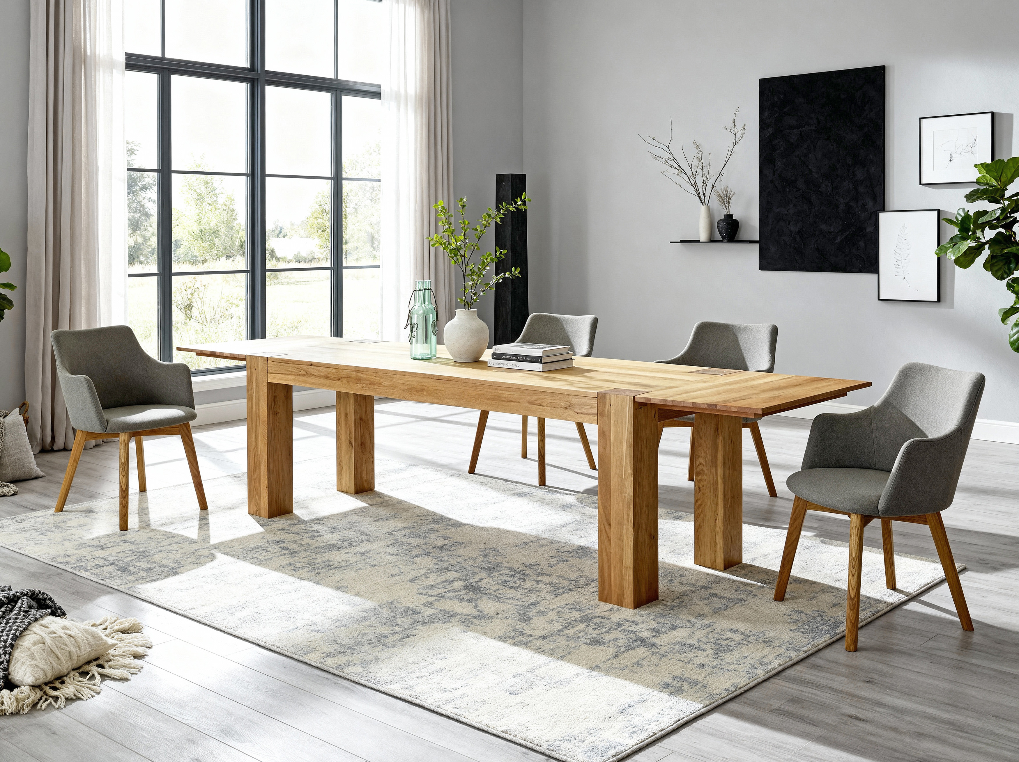 Modern étkezőgarnitúra tömörfából: tölgy kinyitható asztal 200x100 cm toldókkal és 4 kárpitozott karfás szék