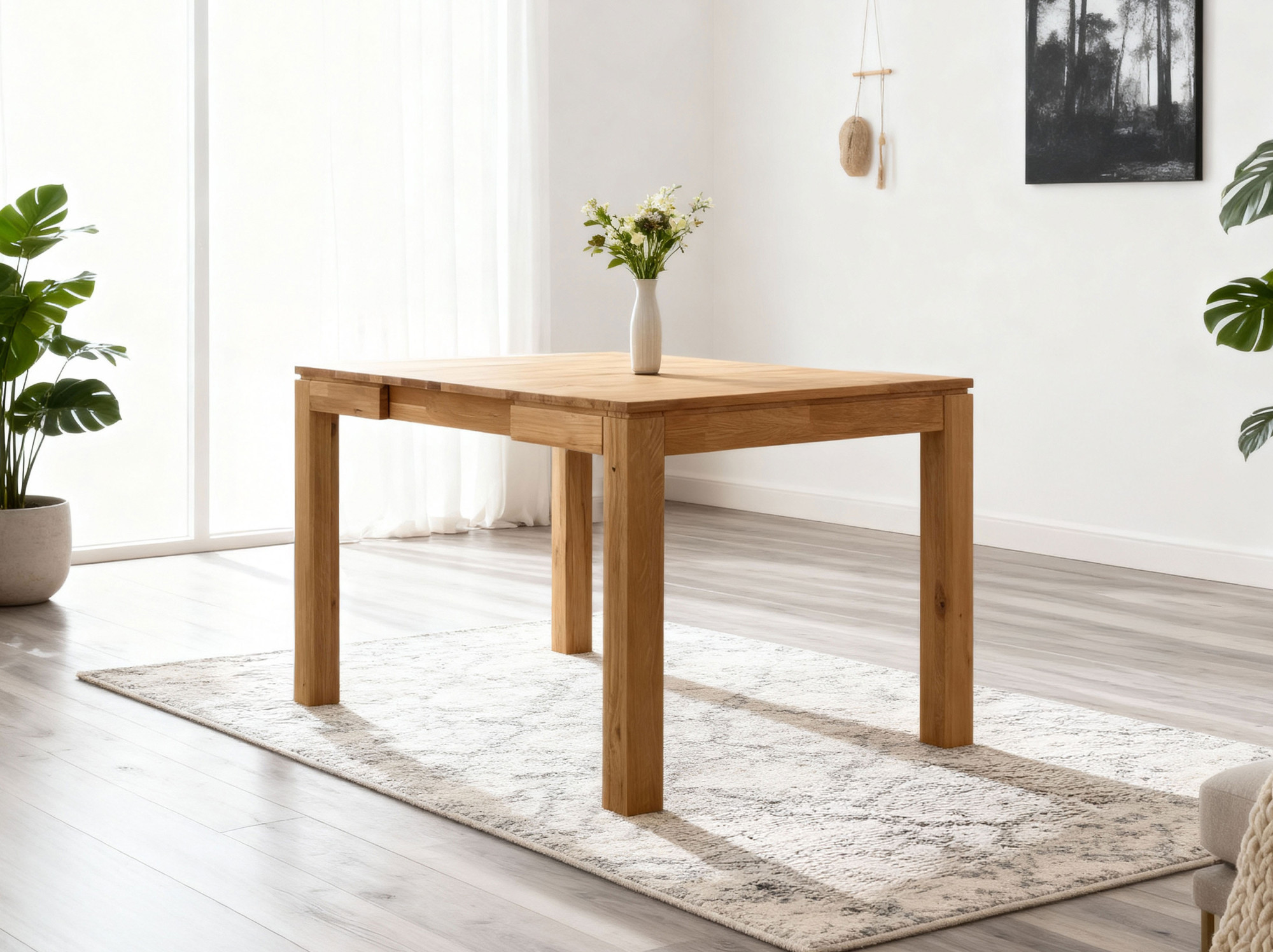 - Kihúzható tölgyfa asztal – alapméret 80 × 80 cm, kihúzva 130 × 80 cm
