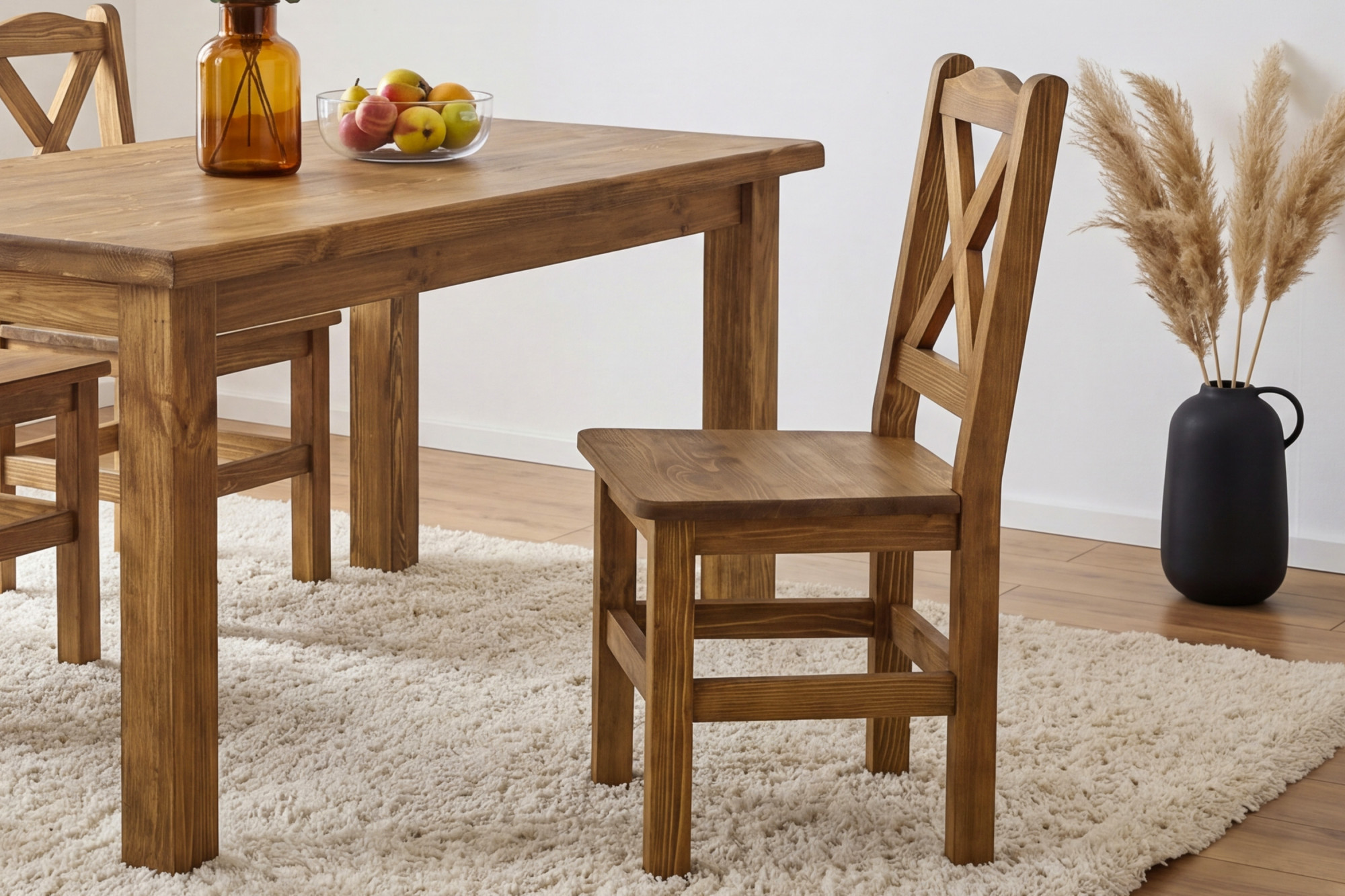 A garnitúra részét képezik a stabil, tömör fenyőből készült étkezőszékek is, amelyek kiváló kényelmet és hosszú élettartamot biztosítanak. Robusztus szerkezetüknek köszönhetően intenzív, mindennapi használatra is alkalmasak. A székek összeszerelt állapotban érkeznek, így azonnal használatba vehetők, nem igényelnek szerelést.