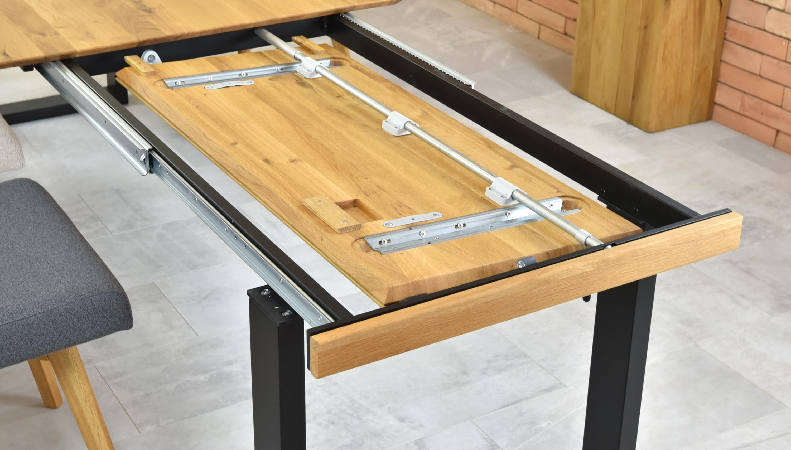 A kihúzó mechanizmus precíz német Pöttker vasalat. Ez egy nagyon egyszerű kihúzó rendszer, ahol az egész kihúzható rész az asztal alatt bújik meg. Az asztal lábainak alsó részén kerekek vannak a könnyű kihúzáshoz. Alapfelszereltség a biztosító mechanizmus a véletlen kinyílás ellen. Az egész kinyitást még egy kisgyermek is meg tudja csinálni, és mindössze néhány másodpercig tart.