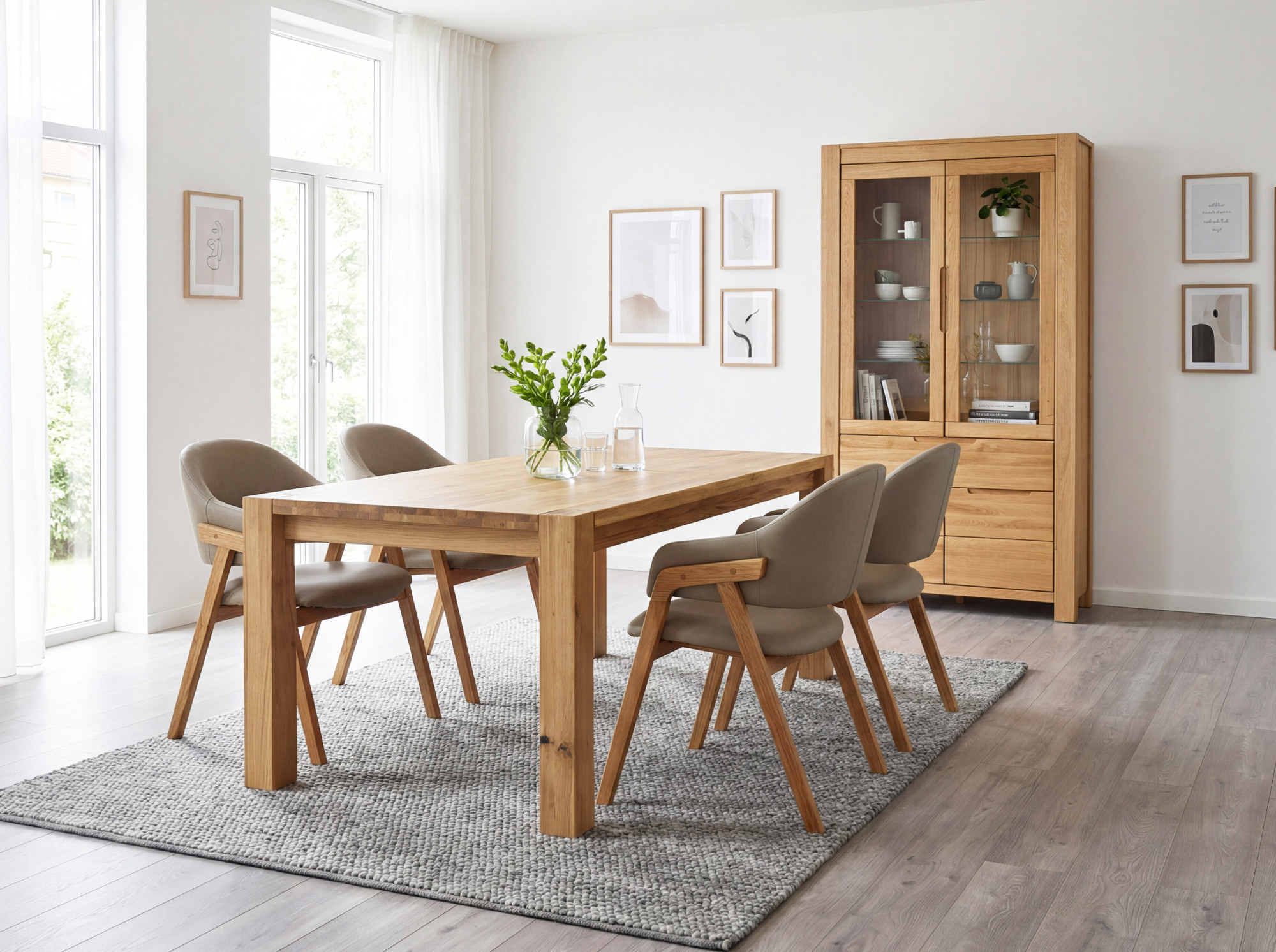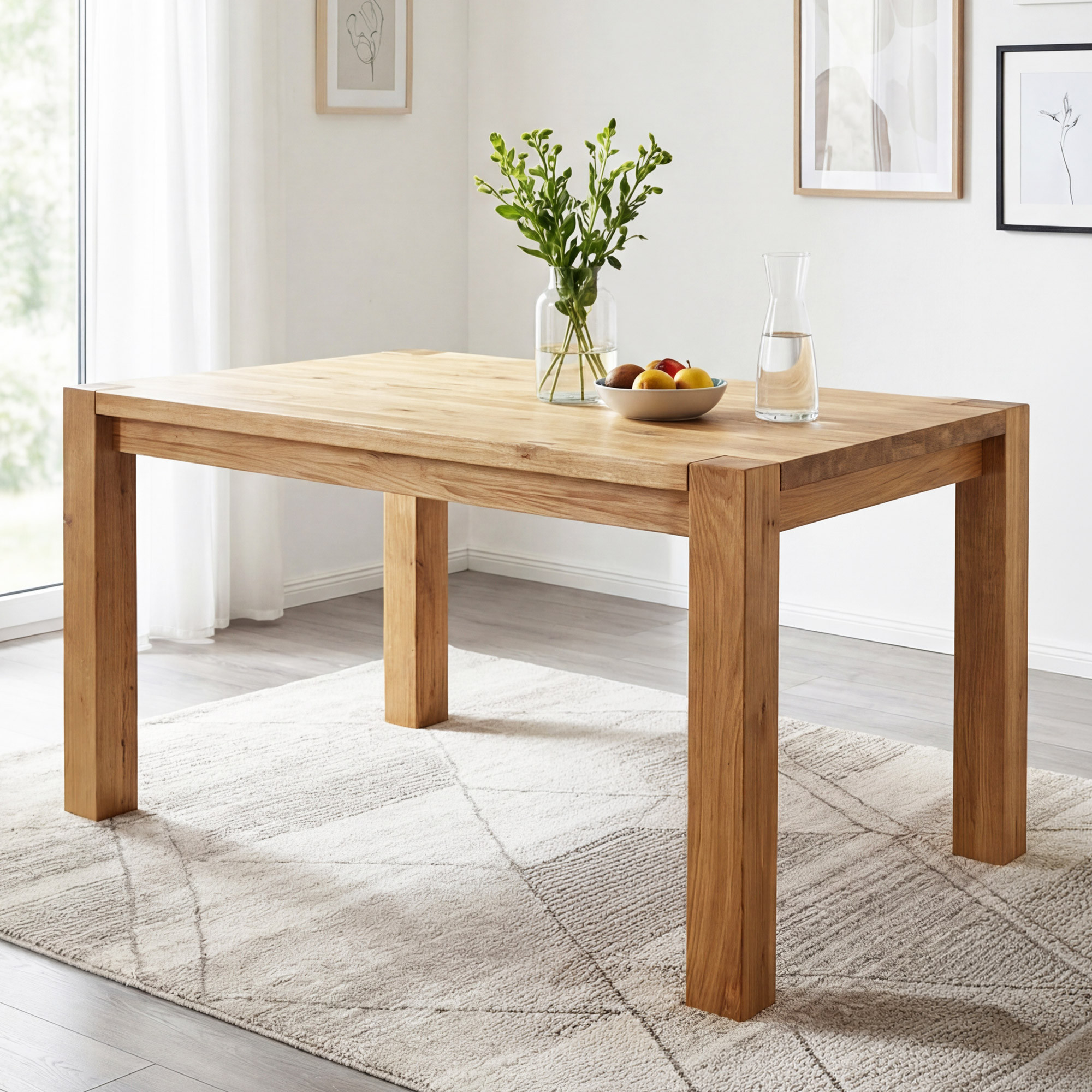 A teljes egészében tömör tölgyfából készült Košice étkezőasztal azok számára ideális választás, akik tartós, megbízható bútort keresnek. Az 140 x 90 cm méret kényelmesen 4–6 személynek ad helyet, és elérhető még a 120 x 80 cm és a 180 x 90 cm változatban is. Kizárólag vad tölgyet használtunk – a fa nem volt fehérítve és nem volt pácolva, így megőrizte természetes erezetét, beleértve a csomókat, amelyeket szándékosan hagyunk meg az autentikus, természetes megjelenésért. Az asztallap felülete természetes olajjal és viasszal kezelt, elismert márkától, ami kiemeli a fa szerkezetét és hatékony védelmet nyújt a kisebb karcok és kopások ellen.