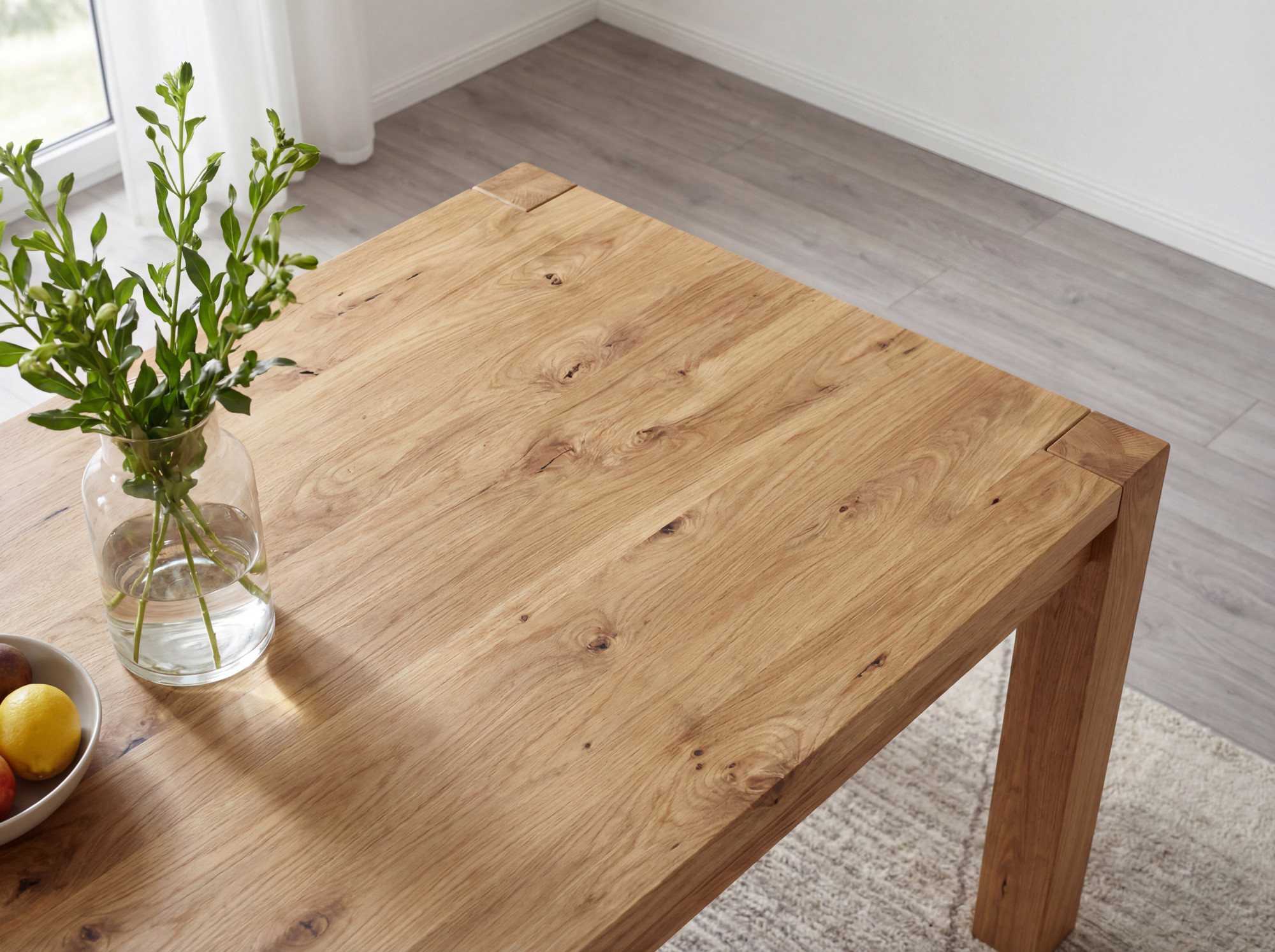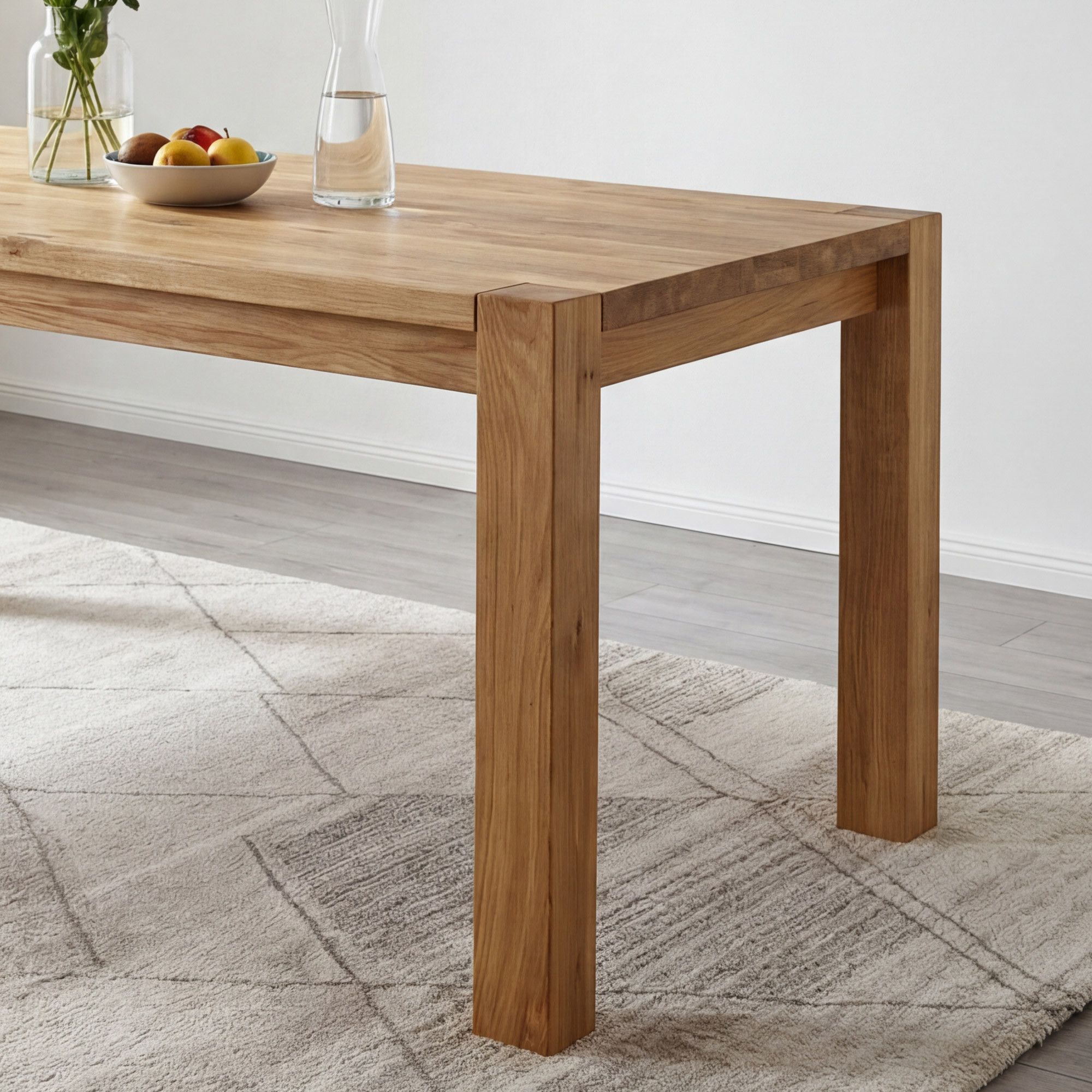 Az asztal szerkezete rendkívül masszív – a 8 x 8 cm keresztmetszetű masszív lábak maximális stabilitást biztosítanak még teljes kihasználtság esetén is. Az asztallap vastagsága 2 cm, a széleken akár 4 cm, ami masszív és reprezentatív megjelenést kölcsönöz az asztalnak. Az asztal magassága 76 cm (a padlótól az alsó élig 64 cm) ideális a kényelmes étkezéshez. A tömör tölgy kemény faanyag, ellenáll a karcoknak és sérüléseknek, ezért ez az asztal több generáción át tartó minőséget garantál. Az asztal lapra szerelten kerül kiszállításra egyszerű útmutatóval – az összeállítást gyorsan elvégezheti, speciális szerszám nélkül.