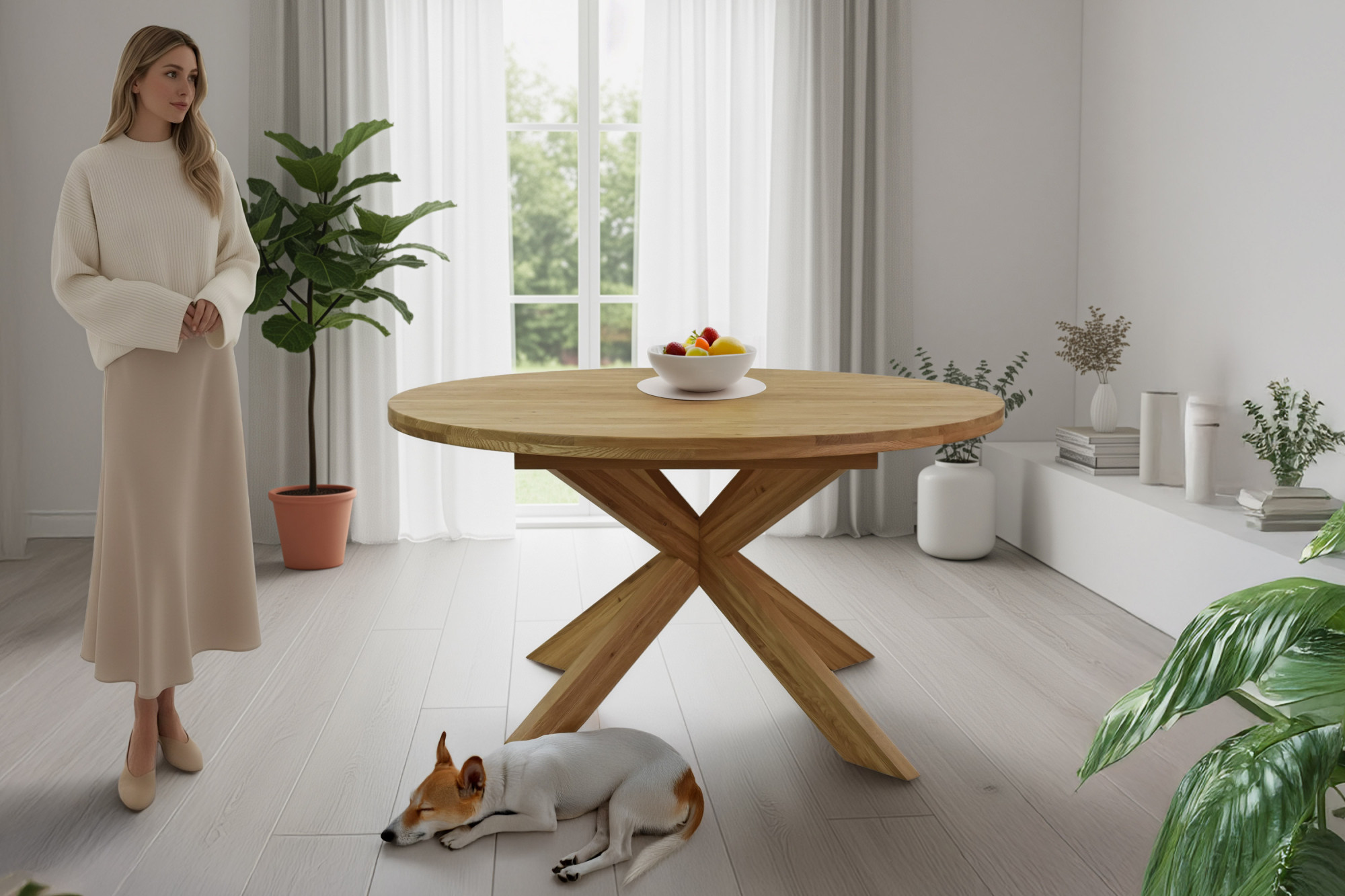 Masszív étkezőasztal valódi tölgyfából készült. Engedjen meg otthonában egy igazi darabot a természetes bútorokból. Az asztal kerek és bővíthető, ami jól jön vendégek vagy váratlan látogatások esetén. Az asztal átmérője +- 140 cm, a bővítő rész szélessége 50 cm, kinyitva így akár 190 cm-es felületet kap. Az étkezőasztal stabil és masszív. A hangsúlyos elem az egyedi, keresztezett formájú asztalláb.