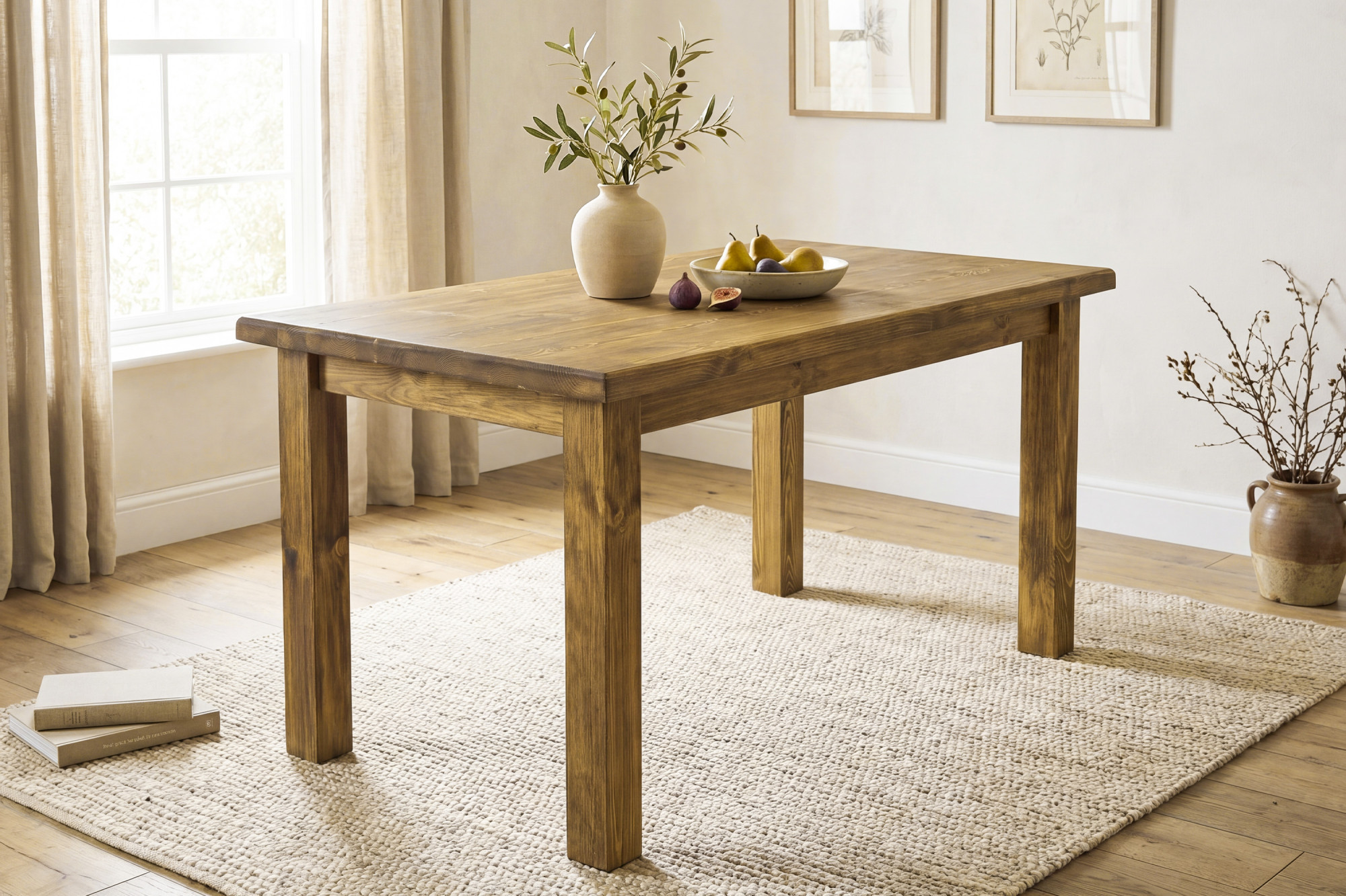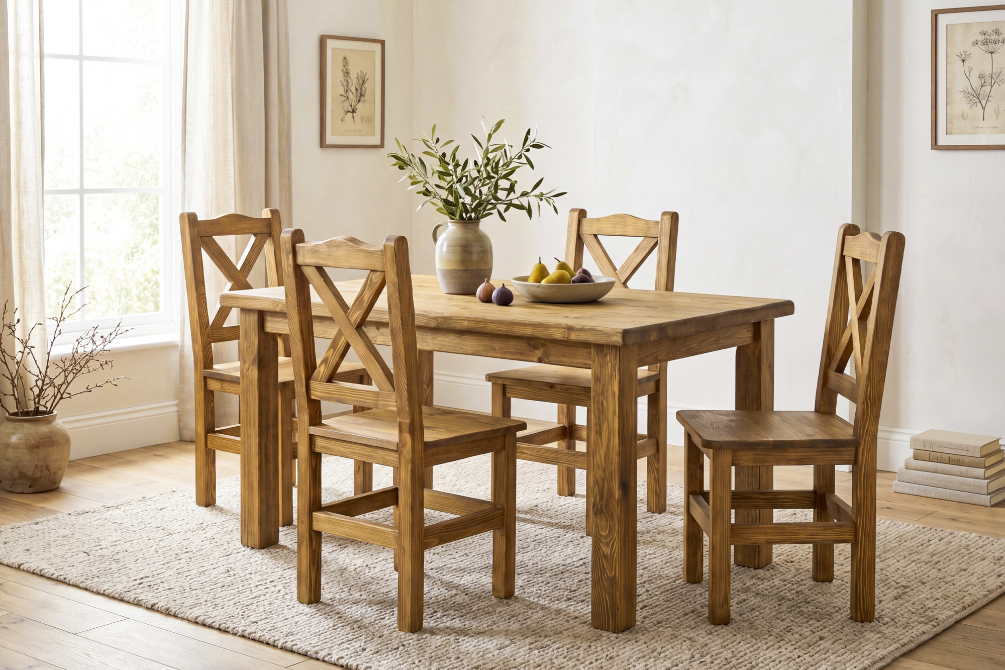 Az étkezőasztal minőségi tömör fenyőfából készült, amely szilárdságáról, természetes külleméről és hosszú élettartamáról ismert.