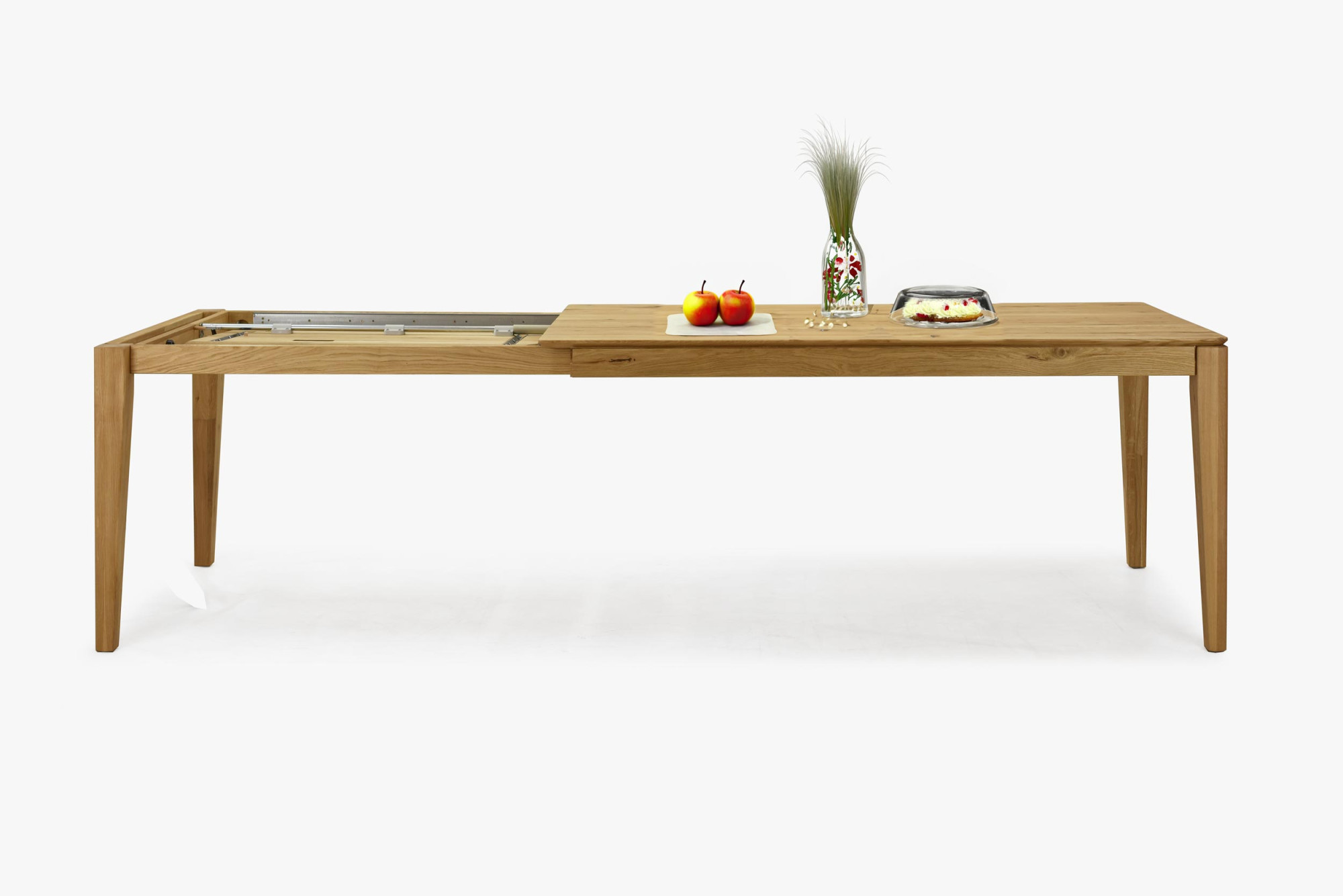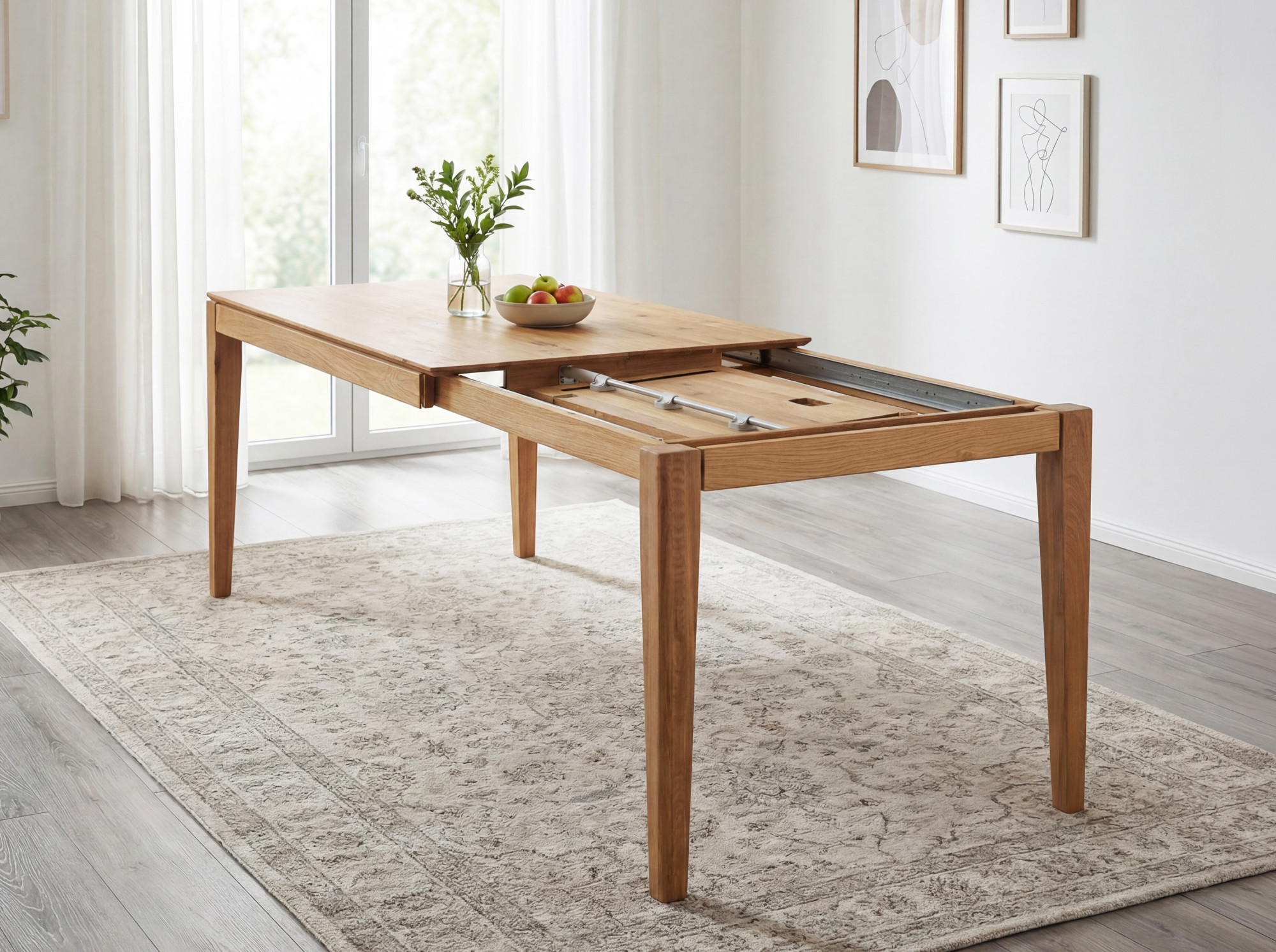 Ez a praktikus kihúzható mechanizmus lehetővé teszi az asztal egyszerű és gyors bővítését, amelyet akár egy gyerek is könnyen elvégezhet egy kézzel. A kihúzható lap elegánsan rejtve van az asztal alatt, az asztal lábai pedig görgőkkel vannak ellátva, amelyek megkönnyítik a mozgatást.
