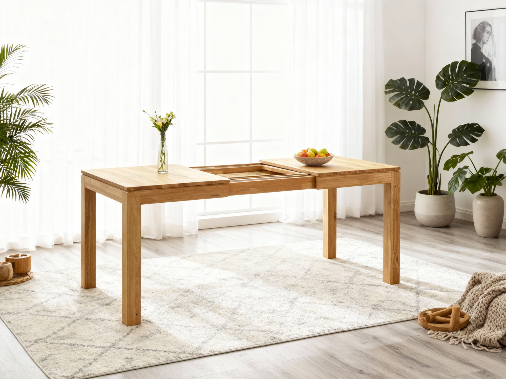 Az asztal fő előnye, hogy kihúzott állapotban is teljes szélességben használható, mivel az asztallábak mindig a végén helyezkednek el. Ez garantálja a stabilitást és elegendő helyet biztosít minden ülő számára. Az asztal lábai tölgyfából készülnek, és az asztal teljes váza szilárd és masszív. Az asztallap szintén tölgyfából készült, parkettamintás, úgynevezett finger joint technológiával. Az asztal felülete természetes olajjal van kezelve, amely védi a fát és kiemeli annak természetes szépségét.