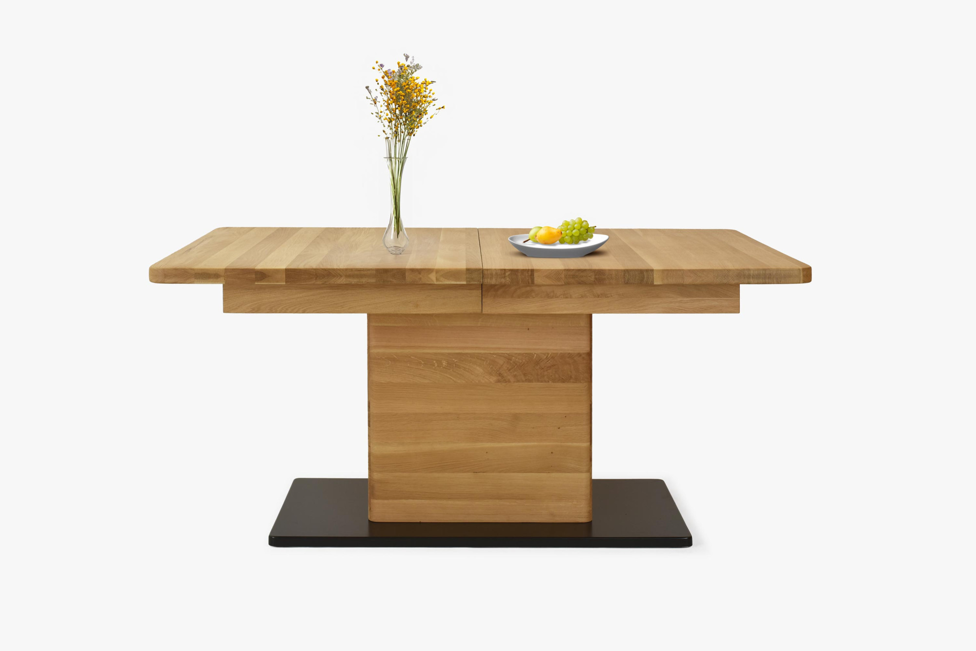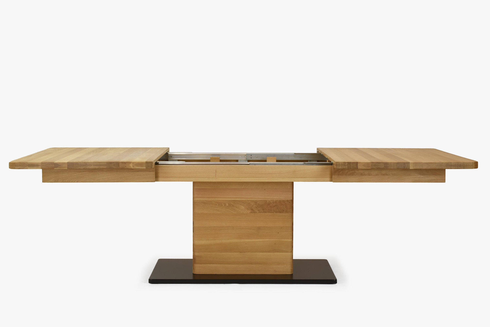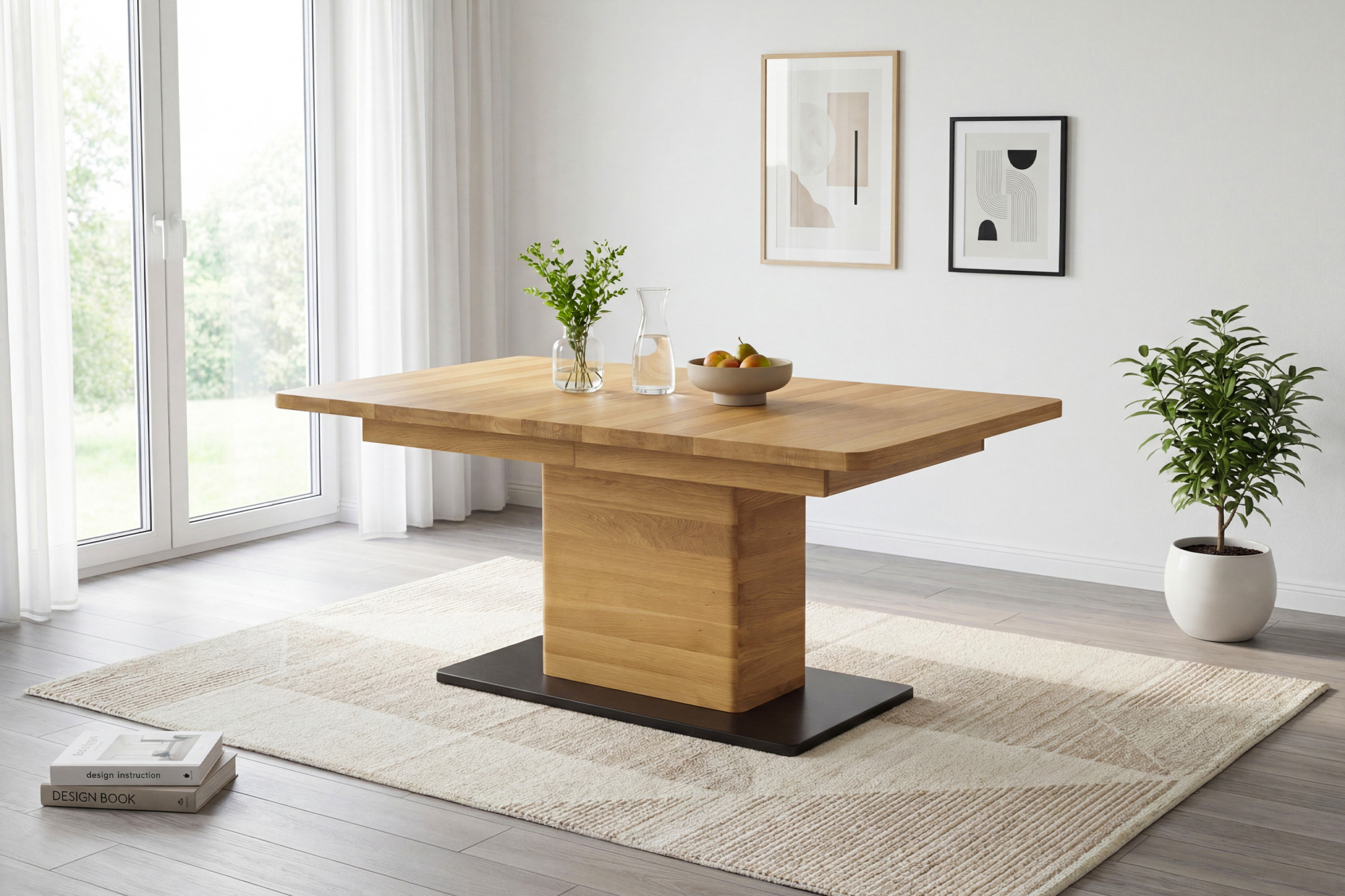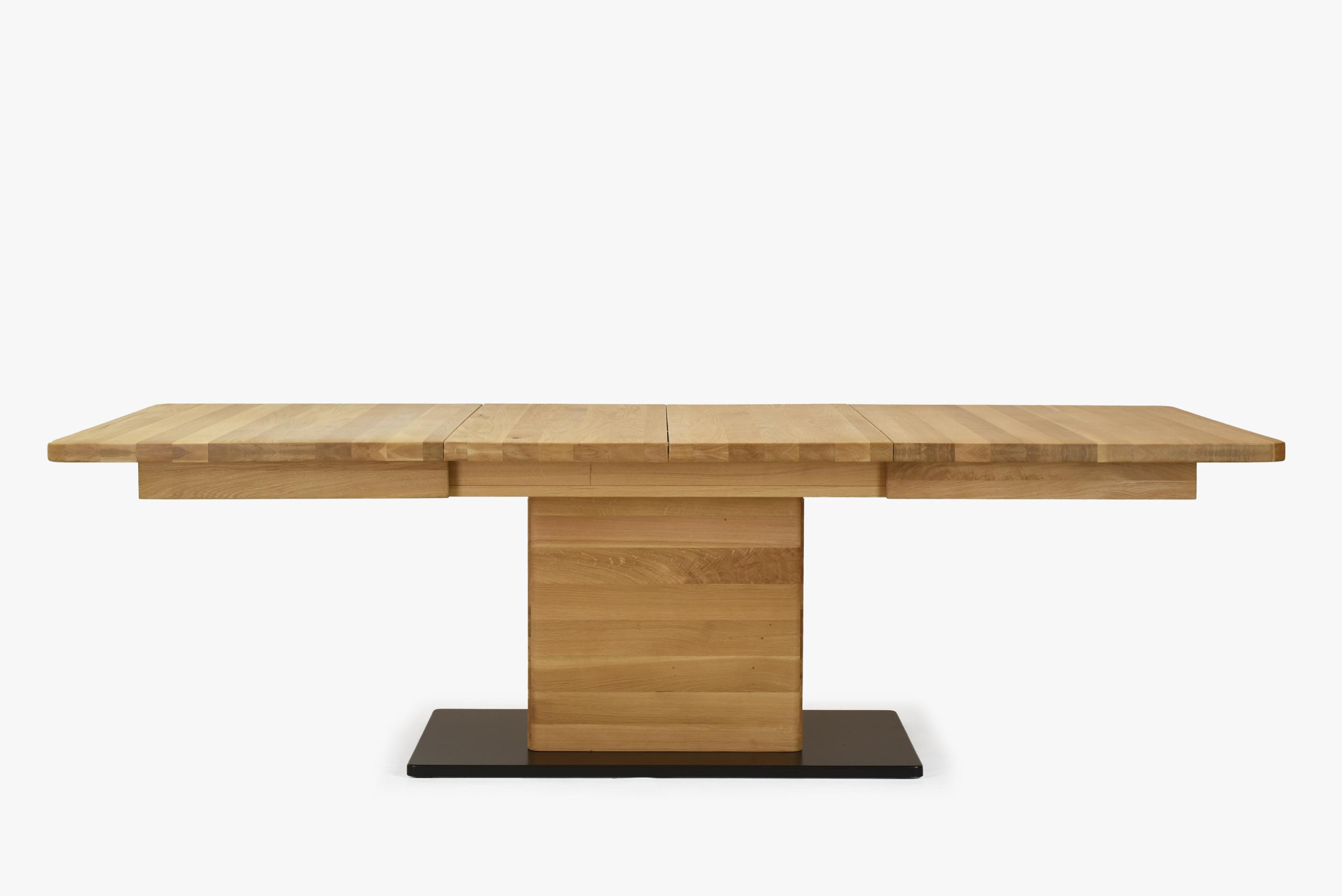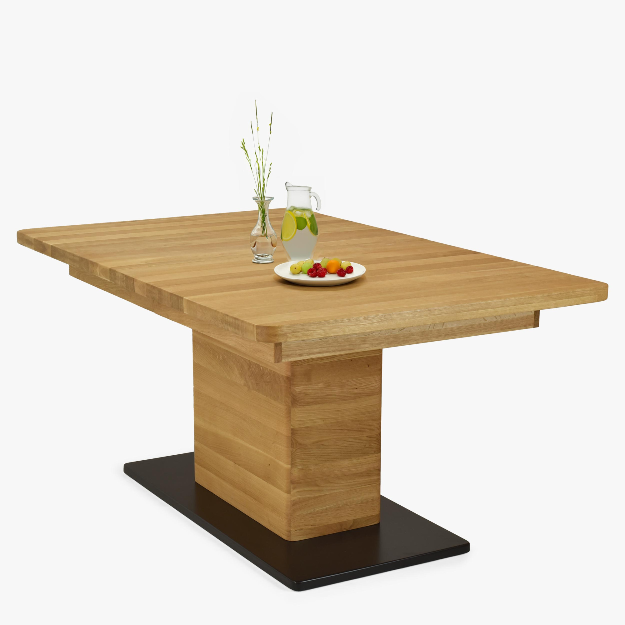 Egylábas kinyitható tölgyfa étkezőasztal fekete talppal, természetes