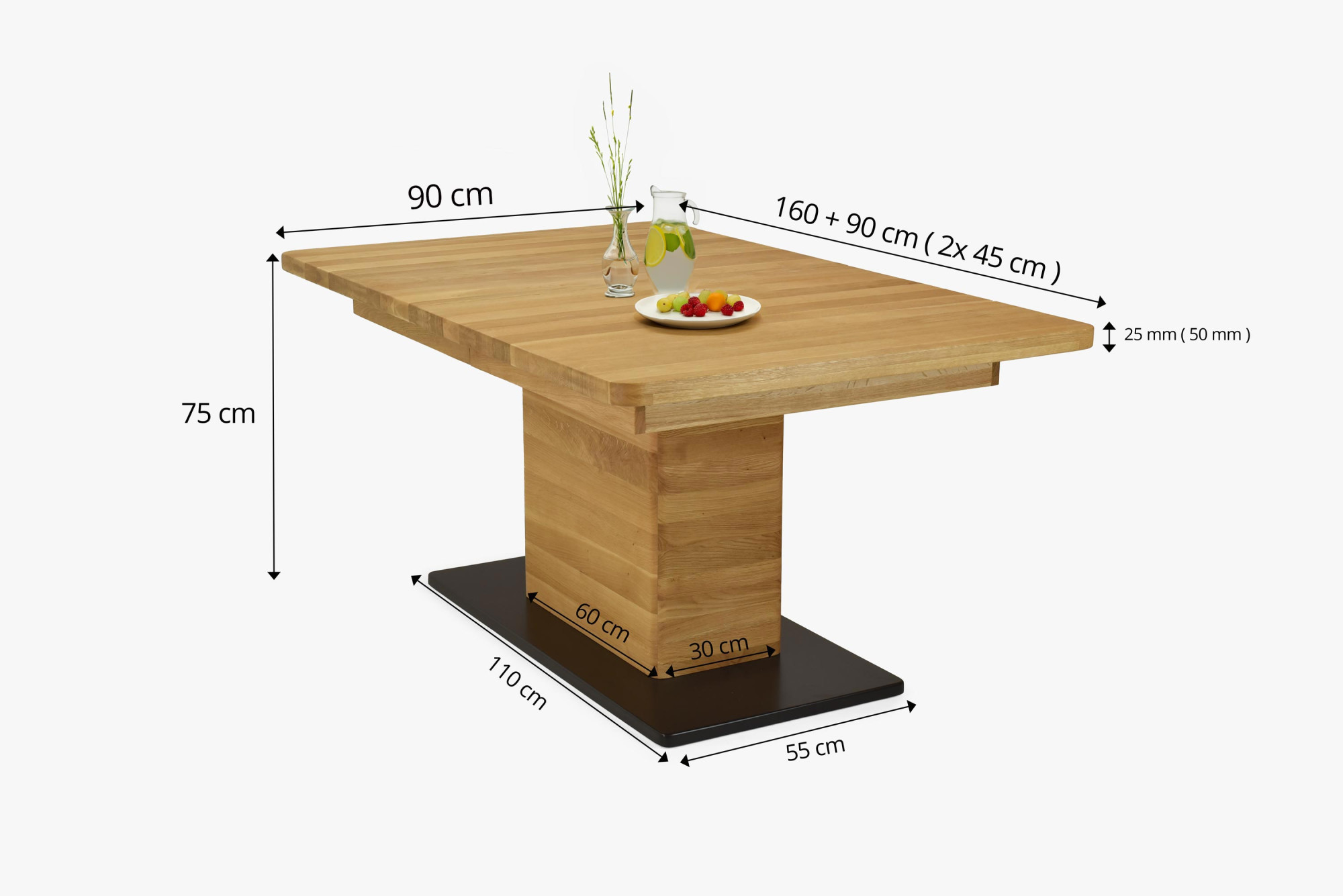 Az asztal kinyitható, amit különösen értékelni fog családi összejöveteleknél vagy vendégek fogadásánál. Az asztal alapmérete 160 x 90 cm, ami ideális a mindennapi használathoz. Kinyitva, amikor egy vagy két betétet lehet hozzáadni, az asztal hossza elérheti a 205 cm vagy 250 cm-t, így akár 10 személy számára is elegendő helyet biztosít. A kihúzó mechanizmus gondosan az asztallap középső részébe van rejtve, így nem bontja meg az esztétikát és diszkrét marad, amikor nincs rá szükség. Az asztal magassága 75 cm, az asztallap vastagsága 25 mm, míg a lap széleinek megmunkálása miatt optikailag még masszívabb hatású, akár 50 mm vastagságnak tűnik.
