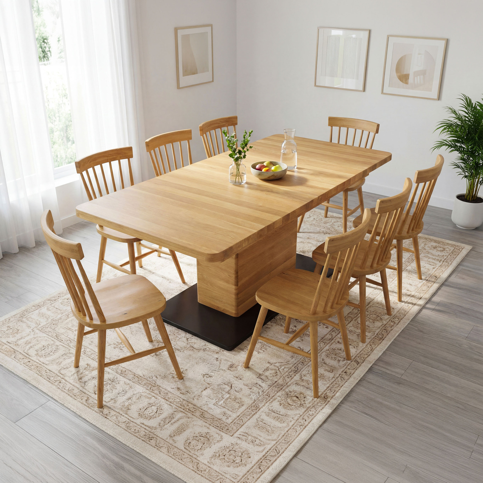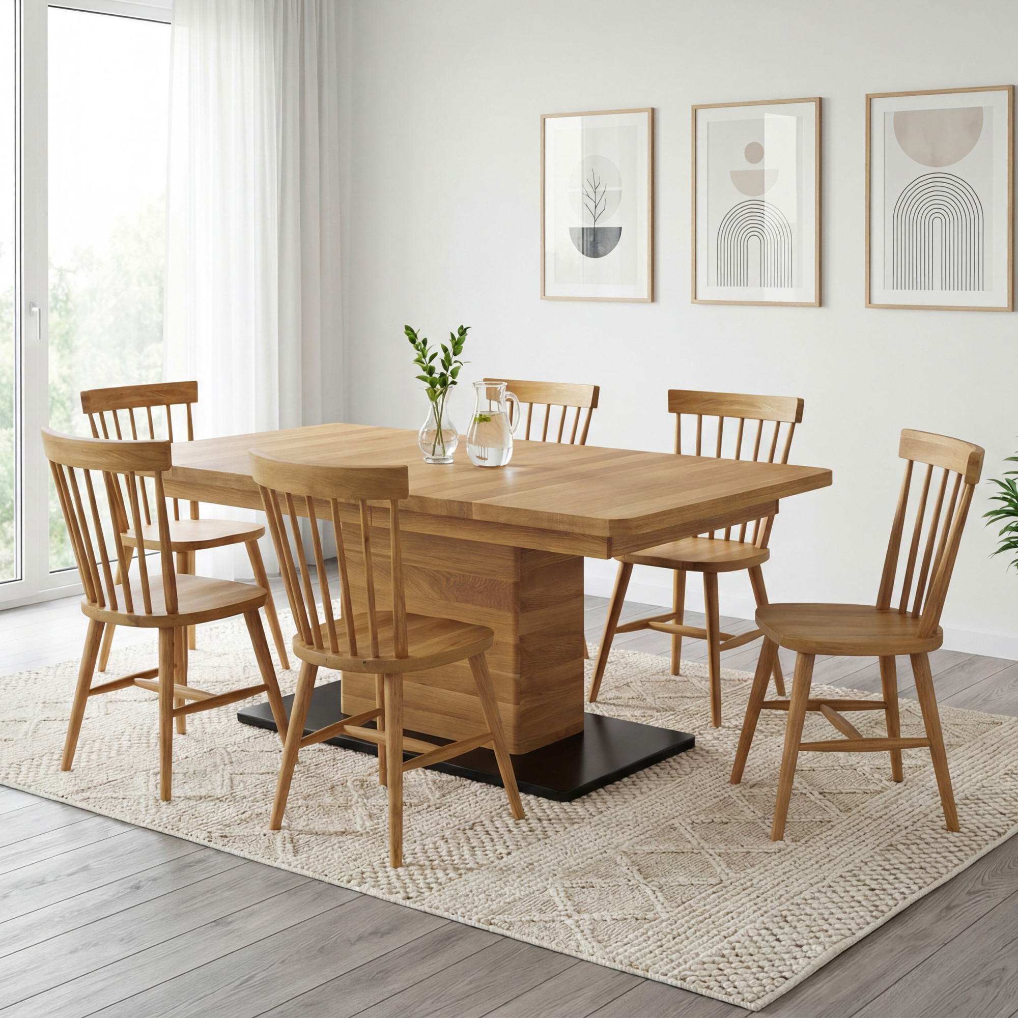 Tölgy kinyitható étkezőasztal egy lábon elegáns és funkcionális megoldás minden otthon számára, amely minőségi és stílusos tömörfa bútorokat keres. Ez az asztal modern dizájnjával tűnik ki, amely kombinálja a tömör tölgyfát és a fekete talapzatot, így egy egyedi és esztétikusan vonzó elemet teremt az Ön belső terében. Az asztal lekerekített sarkai nemcsak növelik a biztonságot, különösen gyermekes családoknál, hanem finomságot és eleganciát is kölcsönöznek az asztal egész megjelenésének.