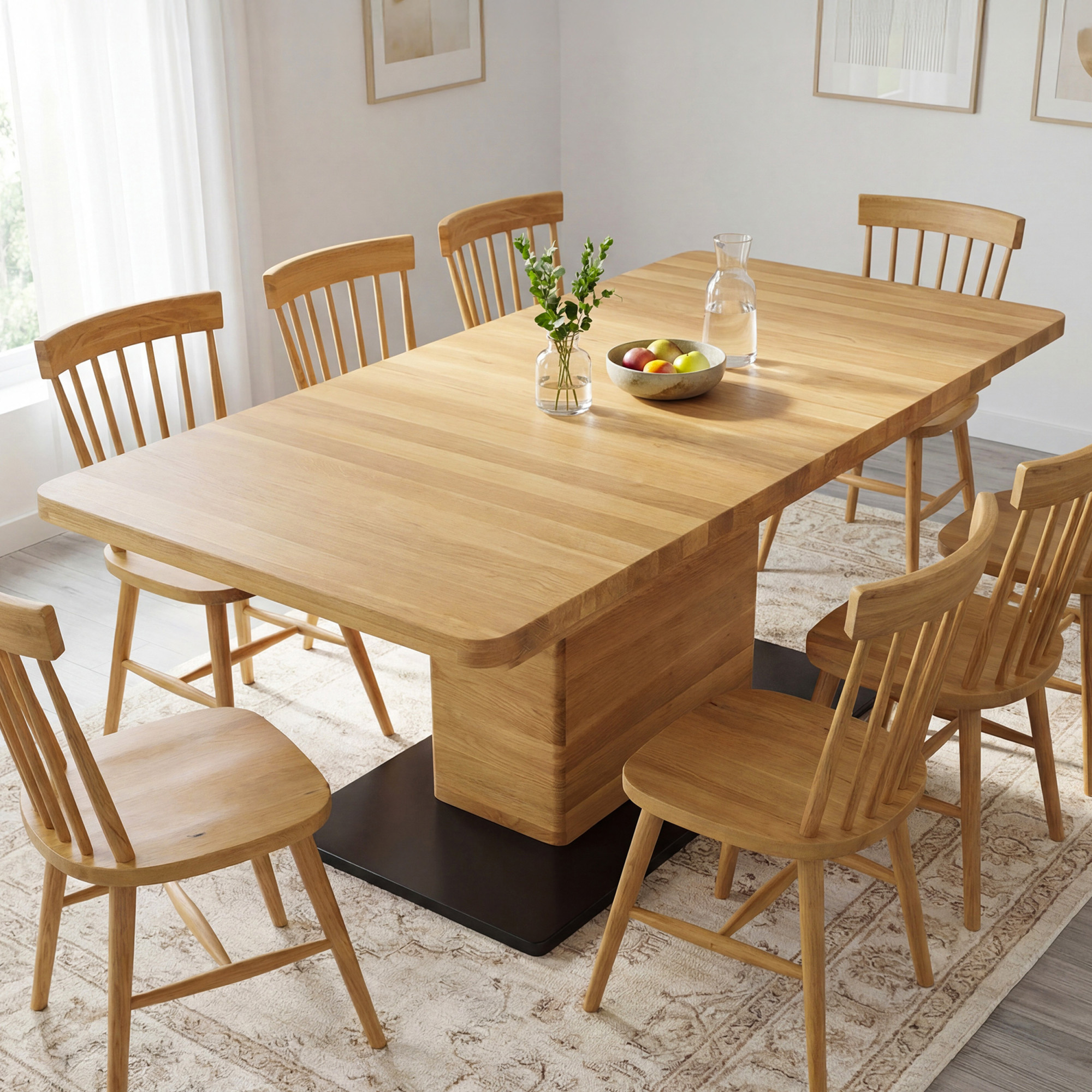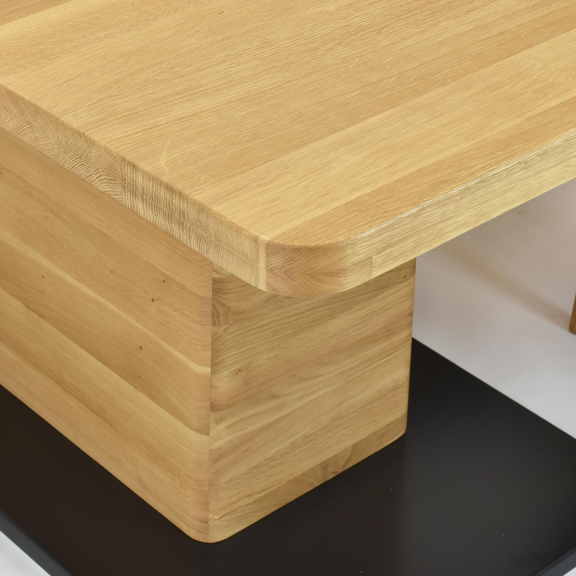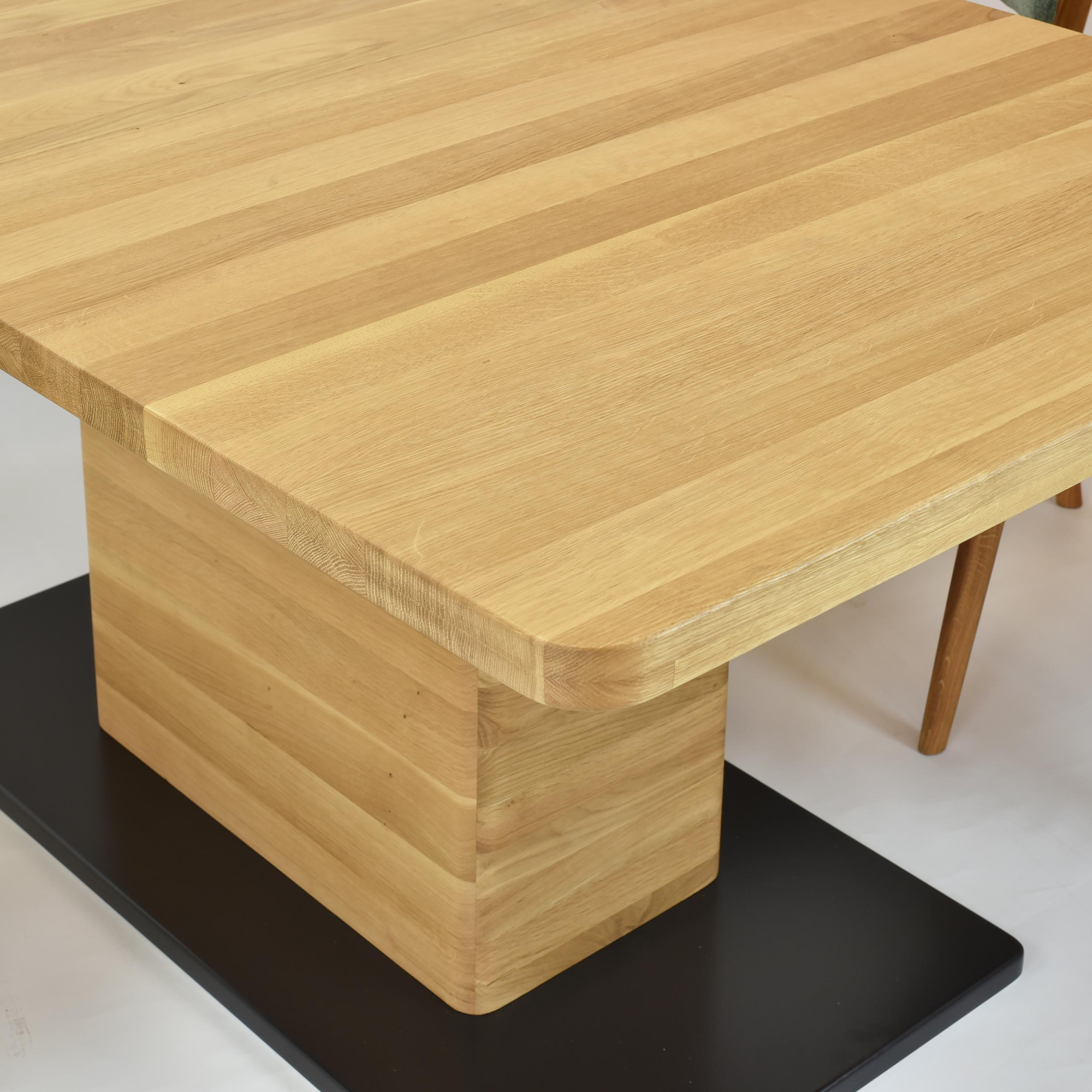 Az asztal kiváló minőségű tölgyfából készült, amelyet dán Woca természetes olajjal kezeltek, így biztosítva a hosszú élettartamot és a tartósságot. A fő domináns eleme ennek az asztalnak a központi lába, amely masszív fekete talapzaton áll. Ez a megoldás nemcsak maximális kényelmet biztosít ülés közben, hanem modern, minimalista megjelenést is kölcsönöz az asztalnak.
